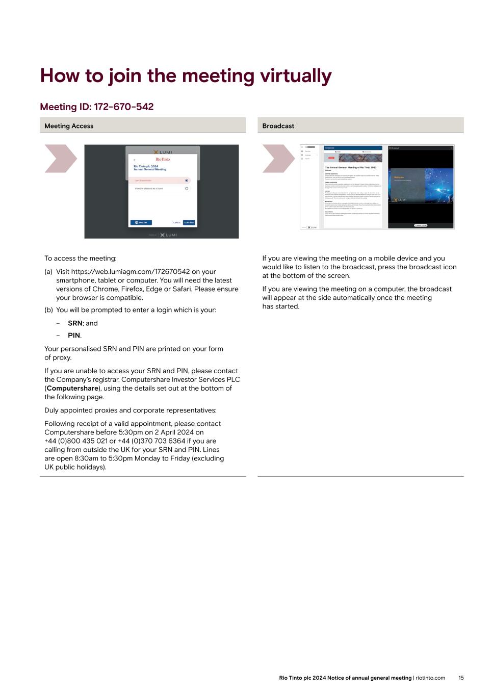 How to join the meeting virtually Meeting ID: 172-670-542 Meeting Access Broadcast To access the meeting: (a) Visit https://web.lumiagm.com/172670542 on your smartphone, tablet or computer. You will need the latest versions of Chrome, Firefox, Edge or Safari. Please ensure your browser is compatible. (b) You will be prompted to enter a login which is your: – SRN; and – PIN. Your personalised SRN and PIN are printed on your form of proxy. If you are unable to access your SRN and PIN, please contact the Company’s registrar, Computershare Investor Services PLC (Computershare), using the details set out at the bottom of the following page. Duly appointed proxies and corporate representatives: Following receipt of a valid appointment, please contact Computershare before 5:30pm on 2 April 2024 on +44 (0)800 435 021 or +44 (0)370 703 6364 if you are calling from outside the UK for your SRN and PIN. Lines are open 8:30am to 5:30pm Monday to Friday (excluding UK public holidays). If you are viewing the meeting on a mobile device and you would like to listen to the broadcast, press the broadcast icon at the bottom of the screen. If you are viewing the meeting on a computer, the broadcast will appear at the side automatically once the meeting has started. 15Rio Tinto plc 2024 Notice of annual general meeting | riotinto.com