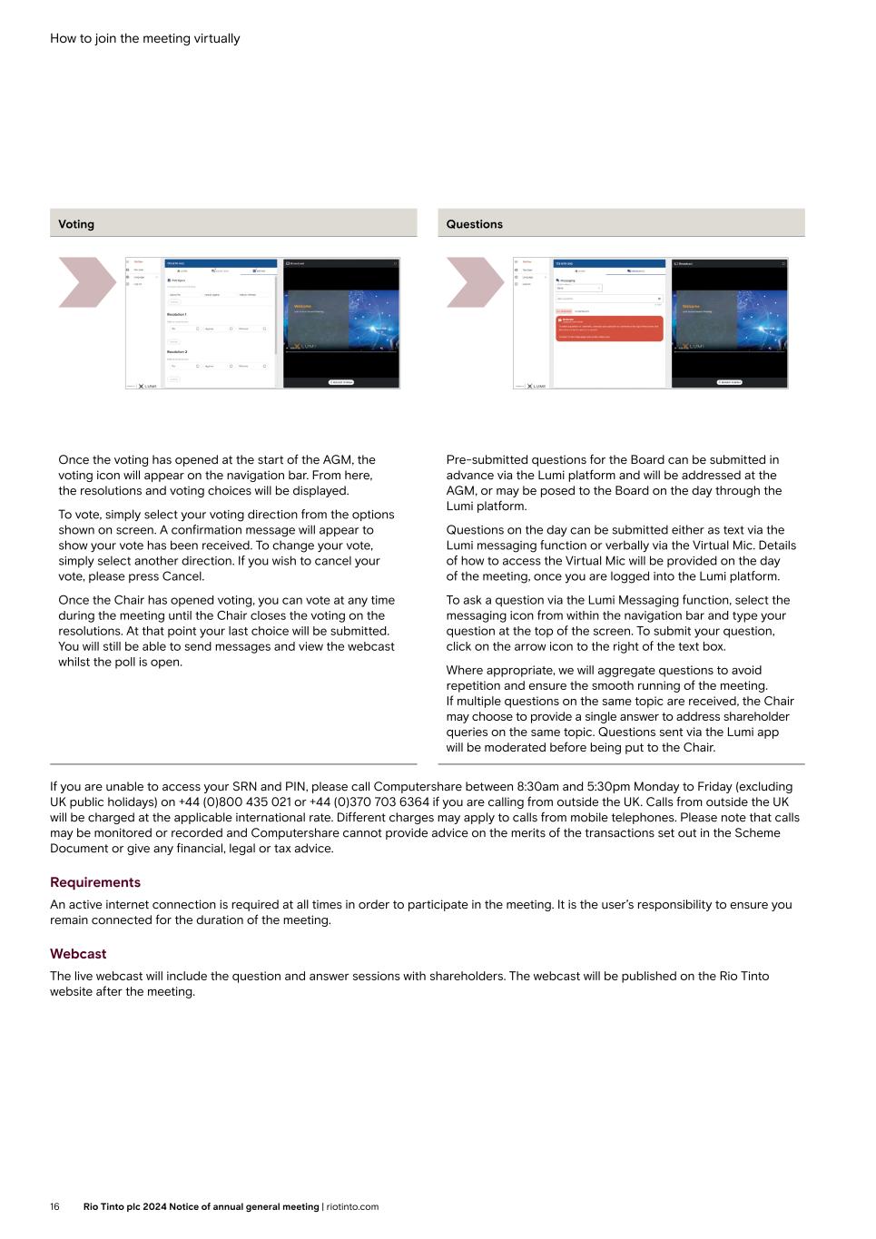 How to join the meeting virtually Voting Questions Once the voting has opened at the start of the AGM, the voting icon will appear on the navigation bar. From here, the resolutions and voting choices will be displayed. To vote, simply select your voting direction from the options shown on screen. A confirmation message will appear to show your vote has been received. To change your vote, simply select another direction. If you wish to cancel your vote, please press Cancel. Once the Chair has opened voting, you can vote at any time during the meeting until the Chair closes the voting on the resolutions. At that point your last choice will be submitted. You will still be able to send messages and view the webcast whilst the poll is open. Pre-submitted questions for the Board can be submitted in advance via the Lumi platform and will be addressed at the AGM, or may be posed to the Board on the day through the Lumi platform. Questions on the day can be submitted either as text via the Lumi messaging function or verbally via the Virtual Mic. Details of how to access the Virtual Mic will be provided on the day of the meeting, once you are logged into the Lumi platform. To ask a question via the Lumi Messaging function, select the messaging icon from within the navigation bar and type your question at the top of the screen. To submit your question, click on the arrow icon to the right of the text box. Where appropriate, we will aggregate questions to avoid repetition and ensure the smooth running of the meeting. If multiple questions on the same topic are received, the Chair may choose to provide a single answer to address shareholder queries on the same topic. Questions sent via the Lumi app will be moderated before being put to the Chair. If you are unable to access your SRN and PIN, please call Computershare between 8:30am and 5:30pm Monday to Friday (excluding UK public holidays) on +44 (0)800 435 021 or +44 (0)370 703 6364 if you are calling from outside the UK. Calls from outside the UK will be charged at the applicable international rate. Different charges may apply to calls from mobile telephones. Please note that calls may be monitored or recorded and Computershare cannot provide advice on the merits of the transactions set out in the Scheme Document or give any financial, legal or tax advice. Requirements An active internet connection is required at all times in order to participate in the meeting. It is the user’s responsibility to ensure you remain connected for the duration of the meeting. Webcast The live webcast will include the question and answer sessions with shareholders. The webcast will be published on the Rio Tinto website after the meeting. 16 Rio Tinto plc 2024 Notice of annual general meeting | riotinto.com