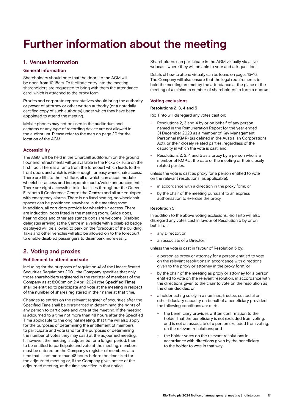 Further information about the meeting 1. Venue information General information Shareholders should note that the doors to the AGM will be open from 10:15am. To facilitate entry into the meeting, shareholders are requested to bring with them the attendance card, which is attached to the proxy form. Proxies and corporate representatives should bring the authority or power of attorney or other written authority (or a notarially certified copy of such authority) under which they have been appointed to attend the meeting. Mobile phones may not be used in the auditorium and cameras or any type of recording device are not allowed in the auditorium. Please refer to the map on page 20 for the location of the AGM. Accessibility The AGM will be held in the Churchill auditorium on the ground floor and refreshments will be available in the Pickwick suite on the first floor. There is a ramp from the forecourt which leads to the front doors and which is wide enough for easy wheelchair access. There are lifts to the first floor, all of which can accommodate wheelchair access and incorporate audio/voice announcements. There are eight accessible toilet facilities throughout the Queen Elizabeth II Conference Centre (the Centre) and all are equipped with emergency alarms. There is no fixed seating, so wheelchair spaces can be positioned anywhere in the meeting room. In addition, all corridors provide for wheelchair access. There are induction loops fitted in the meeting room. Guide dogs, hearing dogs and other assistance dogs are welcome. Disabled delegates arriving at the Centre in a vehicle with a disabled badge displayed will be allowed to park on the forecourt of the building. Taxis and other vehicles will also be allowed on to the forecourt to enable disabled passengers to disembark more easily. 2. Voting and proxies Entitlement to attend and vote Including for the purposes of regulation 41 of the Uncertificated Securities Regulations 2001, the Company specifies that only those shareholders registered in the register of members of the Company as at 8:00pm on 2 April 2024 (the Specified Time) shall be entitled to participate and vote at the meeting in respect of the number of shares registered in their name at that time. Changes to entries on the relevant register of securities after the Specified Time shall be disregarded in determining the rights of any person to participate and vote at the meeting. If the meeting is adjourned to a time not more than 48 hours after the Specified Time applicable to the original meeting, that time will also apply for the purposes of determining the entitlement of members to participate and vote (and for the purposes of determining the number of votes they may cast) at the adjourned meeting. If, however, the meeting is adjourned for a longer period, then to be entitled to participate and vote at the meeting, members must be entered on the Company’s register of members at a time that is not more than 48 hours before the time fixed for the adjourned meeting or, if the Company gives notice of the adjourned meeting, at the time specified in that notice. Shareholders can participate in the AGM virtually via a live webcast, where they will be able to vote and ask questions. Details of how to attend virtually can be found on pages 15–16. The Company will also ensure that the legal requirements to hold the meeting are met by the attendance at the place of the meeting of a minimum number of shareholders to form a quorum. Voting exclusions Resolutions 2, 3, 4 and 5 Rio Tinto will disregard any votes cast on: – Resolutions 2, 3 and 4 by or on behalf of any person named in the Remuneration Report for the year ended 31 December 2023 as a member of Key Management Personnel (KMP) (as defined in the Australian Corporations Act), or their closely related parties, regardless of the capacity in which the vote is cast; and – Resolutions 2, 3, 4 and 5 as a proxy by a person who is a member of KMP at the date of the meeting or their closely related parties, unless the vote is cast as proxy for a person entitled to vote on the relevant resolutions (as applicable): – in accordance with a direction in the proxy form; or – by the chair of the meeting pursuant to an express authorisation to exercise the proxy. Resolution 5 In addition to the above voting exclusions, Rio Tinto will also disregard any votes cast in favour of Resolution 5 by or on behalf of: – any Director; or – an associate of a Director; unless the vote is cast in favour of Resolution 5 by: – a person as proxy or attorney for a person entitled to vote on the relevant resolutions in accordance with directions given to the proxy or attorney in the proxy form; or – by the chair of the meeting as proxy or attorney for a person entitled to vote on the relevant resolution, in accordance with the directions given to the chair to vote on the resolution as the chair decides; or – a holder acting solely in a nominee, trustee, custodial or other fiduciary capacity on behalf of a beneficiary provided the following conditions are met: – the beneficiary provides written confirmation to the holder that the beneficiary is not excluded from voting, and is not an associate of a person excluded from voting, on the relevant resolutions; and – the holder votes on the relevant resolutions in accordance with directions given by the beneficiary to the holder to vote in that way. 17Rio Tinto plc 2024 Notice of annual general meeting | riotinto.com