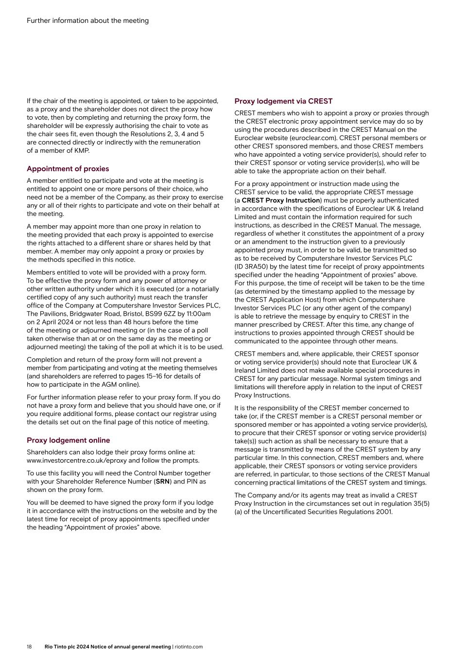 Further information about the meeting If the chair of the meeting is appointed, or taken to be appointed, as a proxy and the shareholder does not direct the proxy how to vote, then by completing and returning the proxy form, the shareholder will be expressly authorising the chair to vote as the chair sees fit, even though the Resolutions 2, 3, 4 and 5 are connected directly or indirectly with the remuneration of a member of KMP. Appointment of proxies A member entitled to participate and vote at the meeting is entitled to appoint one or more persons of their choice, who need not be a member of the Company, as their proxy to exercise any or all of their rights to participate and vote on their behalf at the meeting. A member may appoint more than one proxy in relation to the meeting provided that each proxy is appointed to exercise the rights attached to a different share or shares held by that member. A member may only appoint a proxy or proxies by the methods specified in this notice. Members entitled to vote will be provided with a proxy form. To be effective the proxy form and any power of attorney or other written authority under which it is executed (or a notarially certified copy of any such authority) must reach the transfer office of the Company at Computershare Investor Services PLC, The Pavilions, Bridgwater Road, Bristol, BS99 6ZZ by 11:00am on 2 April 2024 or not less than 48 hours before the time of the meeting or adjourned meeting or (in the case of a poll taken otherwise than at or on the same day as the meeting or adjourned meeting) the taking of the poll at which it is to be used. Completion and return of the proxy form will not prevent a member from participating and voting at the meeting themselves (and shareholders are referred to pages 15–16 for details of how to participate in the AGM online). For further information please refer to your proxy form. If you do not have a proxy form and believe that you should have one, or if you require additional forms, please contact our registrar using the details set out on the final page of this notice of meeting. Proxy lodgement online Shareholders can also lodge their proxy forms online at: www.investorcentre.co.uk/eproxy and follow the prompts. To use this facility you will need the Control Number together with your Shareholder Reference Number (SRN) and PIN as shown on the proxy form. You will be deemed to have signed the proxy form if you lodge it in accordance with the instructions on the website and by the latest time for receipt of proxy appointments specified under the heading “Appointment of proxies” above. Proxy lodgement via CREST CREST members who wish to appoint a proxy or proxies through the CREST electronic proxy appointment service may do so by using the procedures described in the CREST Manual on the Euroclear website (euroclear.com). CREST personal members or other CREST sponsored members, and those CREST members who have appointed a voting service provider(s), should refer to their CREST sponsor or voting service provider(s), who will be able to take the appropriate action on their behalf. For a proxy appointment or instruction made using the CREST service to be valid, the appropriate CREST message (a CREST Proxy Instruction) must be properly authenticated in accordance with the specifications of Euroclear UK & Ireland Limited and must contain the information required for such instructions, as described in the CREST Manual. The message, regardless of whether it constitutes the appointment of a proxy or an amendment to the instruction given to a previously appointed proxy must, in order to be valid, be transmitted so as to be received by Computershare Investor Services PLC (ID 3RA50) by the latest time for receipt of proxy appointments specified under the heading “Appointment of proxies” above. For this purpose, the time of receipt will be taken to be the time (as determined by the timestamp applied to the message by the CREST Application Host) from which Computershare Investor Services PLC (or any other agent of the company) is able to retrieve the message by enquiry to CREST in the manner prescribed by CREST. After this time, any change of instructions to proxies appointed through CREST should be communicated to the appointee through other means. CREST members and, where applicable, their CREST sponsor or voting service provider(s) should note that Euroclear UK & Ireland Limited does not make available special procedures in CREST for any particular message. Normal system timings and limitations will therefore apply in relation to the input of CREST Proxy Instructions. It is the responsibility of the CREST member concerned to take (or, if the CREST member is a CREST personal member or sponsored member or has appointed a voting service provider(s), to procure that their CREST sponsor or voting service provider(s) take(s)) such action as shall be necessary to ensure that a message is transmitted by means of the CREST system by any particular time. In this connection, CREST members and, where applicable, their CREST sponsors or voting service providers are referred, in particular, to those sections of the CREST Manual concerning practical limitations of the CREST system and timings. The Company and/or its agents may treat as invalid a CREST Proxy Instruction in the circumstances set out in regulation 35(5) (a) of the Uncertificated Securities Regulations 2001. 18 Rio Tinto plc 2024 Notice of annual general meeting | riotinto.com