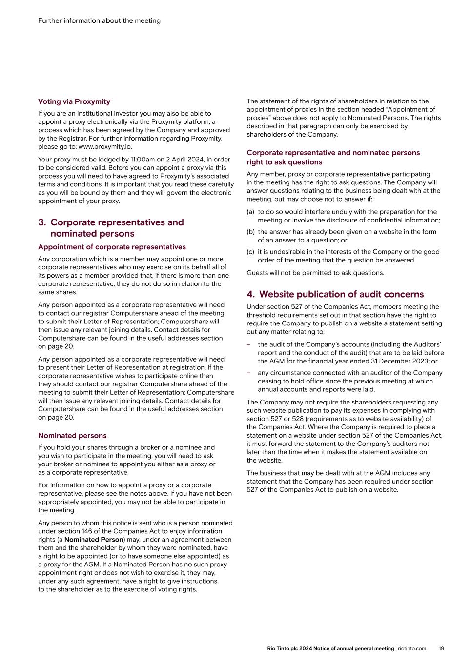 Further information about the meeting Voting via Proxymity If you are an institutional investor you may also be able to appoint a proxy electronically via the Proxymity platform, a process which has been agreed by the Company and approved by the Registrar. For further information regarding Proxymity, please go to: www.proxymity.io. Your proxy must be lodged by 11:00am on 2 April 2024, in order to be considered valid. Before you can appoint a proxy via this process you will need to have agreed to Proxymity’s associated terms and conditions. It is important that you read these carefully as you will be bound by them and they will govern the electronic appointment of your proxy. 3. Corporate representatives and nominated persons Appointment of corporate representatives Any corporation which is a member may appoint one or more corporate representatives who may exercise on its behalf all of its powers as a member provided that, if there is more than one corporate representative, they do not do so in relation to the same shares. Any person appointed as a corporate representative will need to contact our registrar Computershare ahead of the meeting to submit their Letter of Representation; Computershare will then issue any relevant joining details. Contact details for Computershare can be found in the useful addresses section on page 20. Any person appointed as a corporate representative will need to present their Letter of Representation at registration. If the corporate representative wishes to participate online then they should contact our registrar Computershare ahead of the meeting to submit their Letter of Representation; Computershare will then issue any relevant joining details. Contact details for Computershare can be found in the useful addresses section on page 20. Nominated persons If you hold your shares through a broker or a nominee and you wish to participate in the meeting, you will need to ask your broker or nominee to appoint you either as a proxy or as a corporate representative. For information on how to appoint a proxy or a corporate representative, please see the notes above. If you have not been appropriately appointed, you may not be able to participate in the meeting. Any person to whom this notice is sent who is a person nominated under section 146 of the Companies Act to enjoy information rights (a Nominated Person) may, under an agreement between them and the shareholder by whom they were nominated, have a right to be appointed (or to have someone else appointed) as a proxy for the AGM. If a Nominated Person has no such proxy appointment right or does not wish to exercise it, they may, under any such agreement, have a right to give instructions to the shareholder as to the exercise of voting rights. The statement of the rights of shareholders in relation to the appointment of proxies in the section headed “Appointment of proxies” above does not apply to Nominated Persons. The rights described in that paragraph can only be exercised by shareholders of the Company. Corporate representative and nominated persons right to ask questions Any member, proxy or corporate representative participating in the meeting has the right to ask questions. The Company will answer questions relating to the business being dealt with at the meeting, but may choose not to answer if: (a) to do so would interfere unduly with the preparation for the meeting or involve the disclosure of confidential information; (b) the answer has already been given on a website in the form of an answer to a question; or (c) it is undesirable in the interests of the Company or the good order of the meeting that the question be answered. Guests will not be permitted to ask questions. 4. Website publication of audit concerns Under section 527 of the Companies Act, members meeting the threshold requirements set out in that section have the right to require the Company to publish on a website a statement setting out any matter relating to: – the audit of the Company’s accounts (including the Auditors’ report and the conduct of the audit) that are to be laid before the AGM for the financial year ended 31 December 2023; or – any circumstance connected with an auditor of the Company ceasing to hold office since the previous meeting at which annual accounts and reports were laid. The Company may not require the shareholders requesting any such website publication to pay its expenses in complying with section 527 or 528 (requirements as to website availability) of the Companies Act. Where the Company is required to place a statement on a website under section 527 of the Companies Act, it must forward the statement to the Company’s auditors not later than the time when it makes the statement available on the website. The business that may be dealt with at the AGM includes any statement that the Company has been required under section 527 of the Companies Act to publish on a website. 19Rio Tinto plc 2024 Notice of annual general meeting | riotinto.com