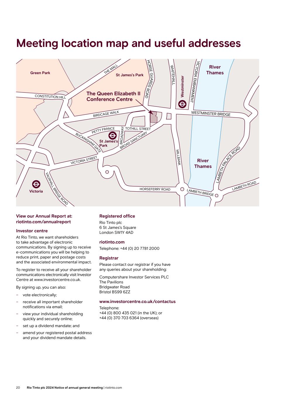 Meeting location map and useful addresses Green Park Green Park Victoria W es tm in st er St James’s Park St James’s Park River Thames River Thames The Queen Elizabeth II Conference Centre CONSTITUTION HILL THE M ALL BIRDCAGE WALK TOTHILL STREET PETTY FRANCE BROAD SANCTUARY B R O A D W A Y BUCKINGHAM GATE VICTORIA STREET VAU XH ALL BRIDG E ROAD HORSEFERRY ROAD M ILLB A N K LAMBETH BRIDGE LAMBETH ROADLA M BE TH P AL AC E ROAD WESTMINSTER BRIDGE VIC TO R IA EM B A N KM EN T W H ITEH A LL H O RSE G UARDS R O A D View our Annual Report at: riotinto.com/annualreport Investor centre At Rio Tinto, we want shareholders to take advantage of electronic communications. By signing up to receive e-communications you will be helping to reduce print, paper and postage costs and the associated environmental impact. To register to receive all your shareholder communications electronically visit Investor Centre at www.investorcentre.co.uk. By signing up, you can also: – vote electronically; – receive all important shareholder notifications via email; – view your individual shareholding quickly and securely online; – set up a dividend mandate; and – amend your registered postal address and your dividend mandate details. Registered office Rio Tinto plc 6 St James’s Square London SW1Y 4AD riotinto.com Telephone: +44 (0) 20 7781 2000 Registrar Please contact our registrar if you have any queries about your shareholding: Computershare Investor Services PLC The Pavilions Bridgwater Road Bristol BS99 6ZZ www.investorcentre.co.uk/contactus Telephone: +44 (0) 800 435 021 (in the UK); or +44 (0) 370 703 6364 (overseas) 20 Rio Tinto plc 2024 Notice of annual general meeting | riotinto.com