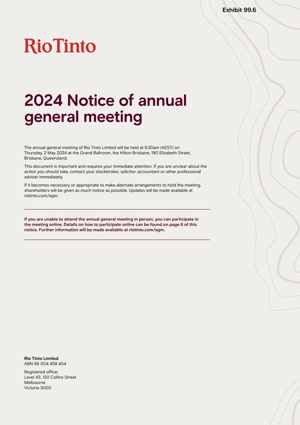 The annual general meeting of Rio Tinto Limited will be held at 9:30am (AEST) on Thursday, 2 May 2024 at the Grand Ballroom, the Hilton Brisbane, 190 Elizabeth Street, Brisbane, Queensland. This document is important and requires your immediate attention. If you are unclear about the action you should take, contact your stockbroker, solicitor, accountant or other professional adviser immediately. If it becomes necessary or appropriate to make alternate arrangements to hold the meeting, shareholders will be given as much notice as possible. Updates will be made available at riotinto.com/agm. If you are unable to attend the annual general meeting in person, you can participate in the meeting online. Details on how to participate online can be found on page 6 of this notice. Further information will be made available at riotinto.com/agm. 2024 Notice of annual general meeting Rio Tinto Limited ABN 96 004 458 404 Registered office: Level 43, 120 Collins Street Melbourne Victoria 3000 Exhibit 99.6