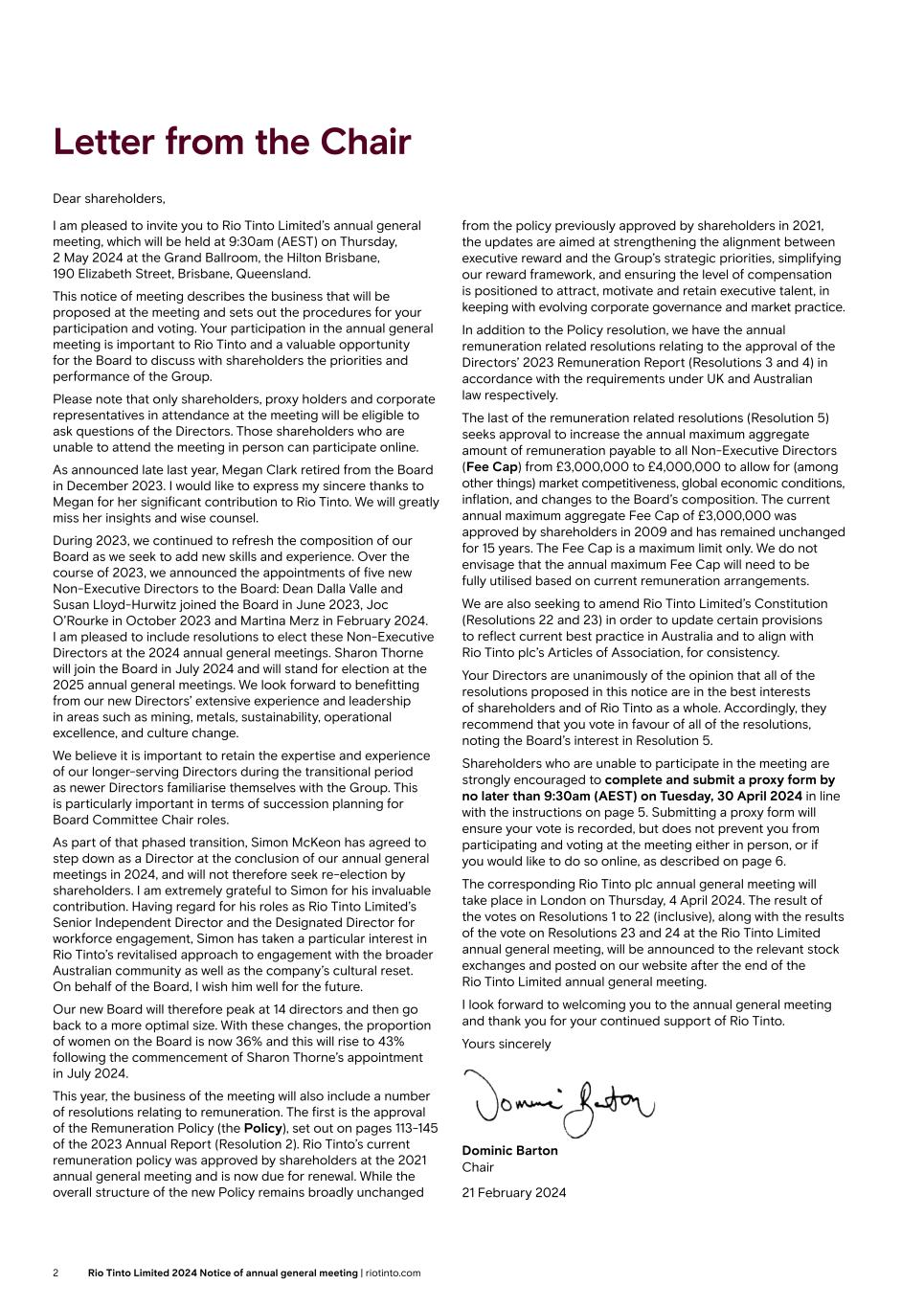 Letter from the Chair Dear shareholders, I am pleased to invite you to Rio Tinto Limited’s annual general meeting, which will be held at 9:30am (AEST) on Thursday, 2 May 2024 at the Grand Ballroom, the Hilton Brisbane, 190 Elizabeth Street, Brisbane, Queensland. This notice of meeting describes the business that will be proposed at the meeting and sets out the procedures for your participation and voting. Your participation in the annual general meeting is important to Rio Tinto and a valuable opportunity for the Board to discuss with shareholders the priorities and performance of the Group. Please note that only shareholders, proxy holders and corporate representatives in attendance at the meeting will be eligible to ask questions of the Directors. Those shareholders who are unable to attend the meeting in person can participate online. As announced late last year, Megan Clark retired from the Board in December 2023. I would like to express my sincere thanks to Megan for her significant contribution to Rio Tinto. We will greatly miss her insights and wise counsel. During 2023, we continued to refresh the composition of our Board as we seek to add new skills and experience. Over the course of 2023, we announced the appointments of five new Non-Executive Directors to the Board: Dean Dalla Valle and Susan Lloyd-Hurwitz joined the Board in June 2023, Joc O’Rourke in October 2023 and Martina Merz in February 2024. I am pleased to include resolutions to elect these Non-Executive Directors at the 2024 annual general meetings. Sharon Thorne will join the Board in July 2024 and will stand for election at the 2025 annual general meetings. We look forward to benefitting from our new Directors’ extensive experience and leadership in areas such as mining, metals, sustainability, operational excellence, and culture change. We believe it is important to retain the expertise and experience of our longer-serving Directors during the transitional period as newer Directors familiarise themselves with the Group. This is particularly important in terms of succession planning for Board Committee Chair roles. As part of that phased transition, Simon McKeon has agreed to step down as a Director at the conclusion of our annual general meetings in 2024, and will not therefore seek re-election by shareholders. I am extremely grateful to Simon for his invaluable contribution. Having regard for his roles as Rio Tinto Limited’s Senior Independent Director and the Designated Director for workforce engagement, Simon has taken a particular interest in Rio Tinto’s revitalised approach to engagement with the broader Australian community as well as the company’s cultural reset. On behalf of the Board, I wish him well for the future. Our new Board will therefore peak at 14 directors and then go back to a more optimal size. With these changes, the proportion of women on the Board is now 36% and this will rise to 43% following the commencement of Sharon Thorne’s appointment in July 2024. This year, the business of the meeting will also include a number of resolutions relating to remuneration. The first is the approval of the Remuneration Policy (the Policy), set out on pages 113-145 of the 2023 Annual Report (Resolution 2). Rio Tinto’s current remuneration policy was approved by shareholders at the 2021 annual general meeting and is now due for renewal. While the overall structure of the new Policy remains broadly unchanged from the policy previously approved by shareholders in 2021, the updates are aimed at strengthening the alignment between executive reward and the Group’s strategic priorities, simplifying our reward framework, and ensuring the level of compensation is positioned to attract, motivate and retain executive talent, in keeping with evolving corporate governance and market practice. In addition to the Policy resolution, we have the annual remuneration related resolutions relating to the approval of the Directors’ 2023 Remuneration Report (Resolutions 3 and 4) in accordance with the requirements under UK and Australian law respectively. The last of the remuneration related resolutions (Resolution 5) seeks approval to increase the annual maximum aggregate amount of remuneration payable to all Non-Executive Directors (Fee Cap) from £3,000,000 to £4,000,000 to allow for (among other things) market competitiveness, global economic conditions, inflation, and changes to the Board’s composition. The current annual maximum aggregate Fee Cap of £3,000,000 was approved by shareholders in 2009 and has remained unchanged for 15 years. The Fee Cap is a maximum limit only. We do not envisage that the annual maximum Fee Cap will need to be fully utilised based on current remuneration arrangements. We are also seeking to amend Rio Tinto Limited’s Constitution (Resolutions 22 and 23) in order to update certain provisions to reflect current best practice in Australia and to align with Rio Tinto plc’s Articles of Association, for consistency. Your Directors are unanimously of the opinion that all of the resolutions proposed in this notice are in the best interests of shareholders and of Rio Tinto as a whole. Accordingly, they recommend that you vote in favour of all of the resolutions, noting the Board’s interest in Resolution 5. Shareholders who are unable to participate in the meeting are strongly encouraged to complete and submit a proxy form by no later than 9:30am (AEST) on Tuesday, 30 April 2024 in line with the instructions on page 5. Submitting a proxy form will ensure your vote is recorded, but does not prevent you from participating and voting at the meeting either in person, or if you would like to do so online, as described on page 6. The corresponding Rio Tinto plc annual general meeting will take place in London on Thursday, 4 April 2024. The result of the votes on Resolutions 1 to 22 (inclusive), along with the results of the vote on Resolutions 23 and 24 at the Rio Tinto Limited an