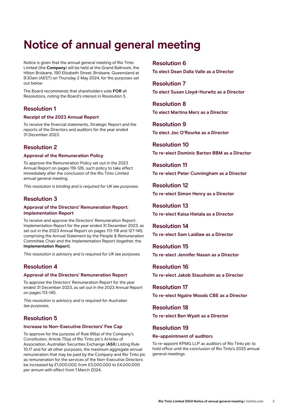 Notice of annual general meeting Notice is given that the annual general meeting of Rio Tinto Limited (the Company) will be held at the Grand Ballroom, the Hilton Brisbane, 190 Elizabeth Street, Brisbane, Queensland at 9:30am (AEST) on Thursday 2 May 2024, for the purposes set out below: The Board recommends that shareholders vote FOR all Resolutions, noting the Board’s interest in Resolution 5. Resolution 1 Receipt of the 2023 Annual Report To receive the financial statements, Strategic Report and the reports of the Directors and auditors for the year ended 31 December 2023. Resolution 2 Approval of the Remuneration Policy To approve the Remuneration Policy set out in the 2023 Annual Report on pages 119-126, such policy to take effect immediately after the conclusion of the Rio Tinto Limited annual general meeting. This resolution is binding and is required for UK law purposes. Resolution 3 Approval of the Directors’ Remuneration Report: Implementation Report To receive and approve the Directors’ Remuneration Report: Implementation Report for the year ended 31 December 2023, as set out in the 2023 Annual Report on pages 113-118 and 127-145, comprising the Annual Statement by the People & Remuneration Committee Chair and the Implementation Report (together, the Implementation Report). This resolution is advisory and is required for UK law purposes. Resolution 4 Approval of the Directors’ Remuneration Report To approve the Directors’ Remuneration Report for the year ended 31 December 2023, as set out in the 2023 Annual Report on pages 113-145. This resolution is advisory and is required for Australian law purposes. Resolution 5 Increase to Non-Executive Directors’ Fee Cap To approve for the purpose of Rule 89(a) of the Company’s Constitution, Article 75(a) of Rio Tinto plc’s Articles of Association, Australian Securities Exchange (ASX) Listing Rule 10.17 and for all other purposes, the maximum aggregate annual remuneration that may be paid by the Company and Rio Tinto plc as remuneration for the services of the Non-Executive Directors be increased by £1,000,000, from £3,000,000 to £4,000,000 per annum with effect from 1 March 2024. Resolution 6 To elect Dean Dalla Valle as a Director Resolution 7 To elect Susan Lloyd-Hurwitz as a Director Resolution 8 To elect Martina Merz as a Director Resolution 9 To elect Joc O’Rourke as a Director Resolution 10 To re-elect Dominic Barton BBM as a Director Resolution 11 To re-elect Peter Cunningham as a Director Resolution 12 To re-elect Simon Henry as a Director Resolution 13 To re-elect Kaisa Hietala as a Director Resolution 14 To re-elect Sam Laidlaw as a Director Resolution 15 To re-elect Jennifer Nason as a Director Resolution 16 To re-elect Jakob Stausholm as a Director Resolution 17 To re-elect Ngaire Woods CBE as a Director Resolution 18 To re-elect Ben Wyatt as a Director Resolution 19 Re-appointment of auditors To re-appoint KPMG LLP as auditors of Rio Tinto plc to hold office until the conclusion of Rio Tinto’s 2025 annual general meetings. 3Rio Tinto Limited 2024 Notice of annual general meeting | riotinto.com