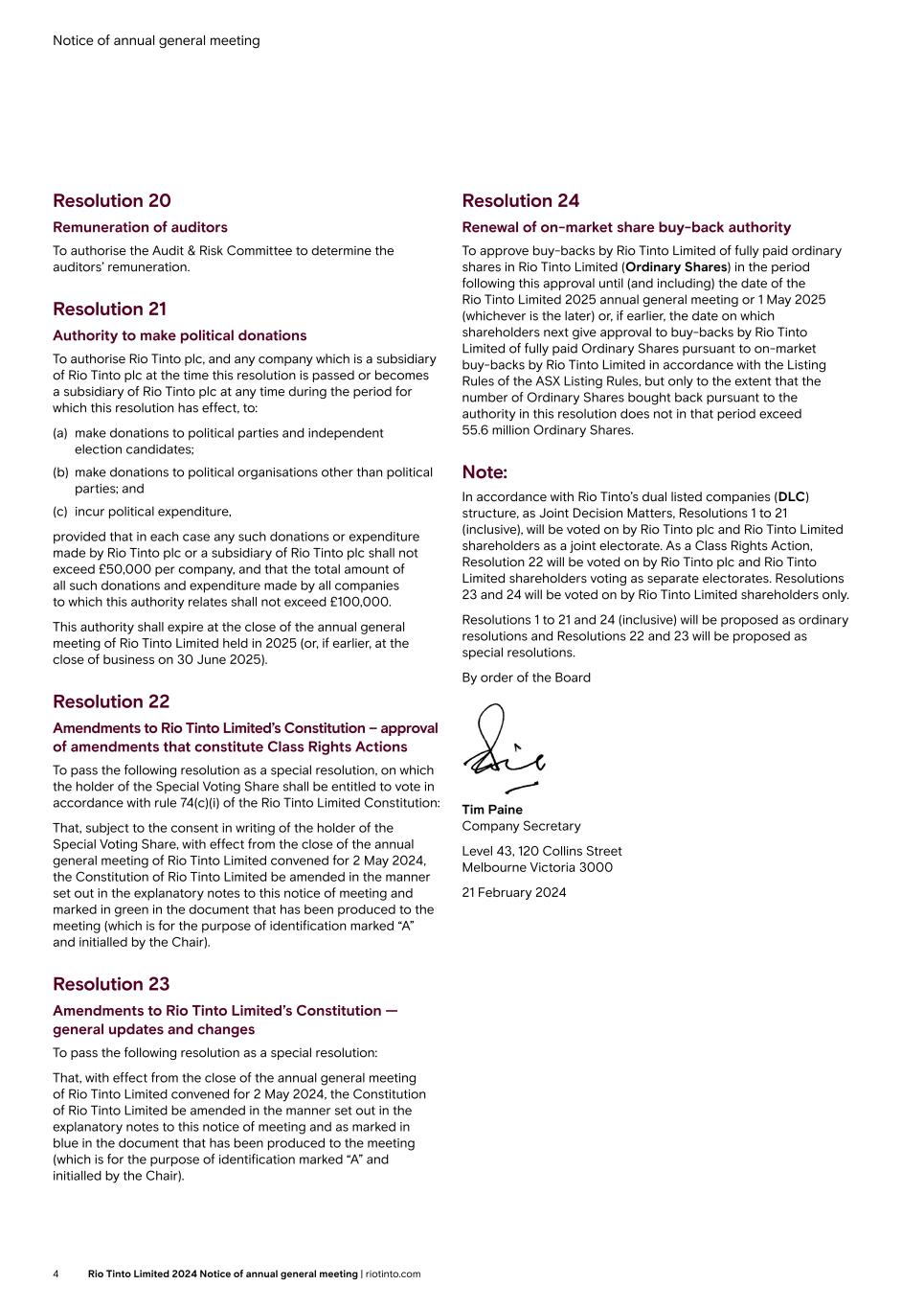 Notice of annual general meeting Resolution 20 Remuneration of auditors To authorise the Audit & Risk Committee to determine the auditors’ remuneration. Resolution 21 Authority to make political donations To authorise Rio Tinto plc, and any company which is a subsidiary of Rio Tinto plc at the time this resolution is passed or becomes a subsidiary of Rio Tinto plc at any time during the period for which this resolution has effect, to: (a) make donations to political parties and independent election candidates; (b) make donations to political organisations other than political parties; and (c) incur political expenditure, provided that in each case any such donations or expenditure made by Rio Tinto plc or a subsidiary of Rio Tinto plc shall not exceed £50,000 per company, and that the total amount of all such donations and expenditure made by all companies to which this authority relates shall not exceed £100,000. This authority shall expire at the close of the annual general meeting of Rio Tinto Limited held in 2025 (or, if earlier, at the close of business on 30 June 2025). Resolution 22 Amendments to Rio Tinto Limited’s Constitution – approval of amendments that constitute Class Rights Actions To pass the following resolution as a special resolution, on which the holder of the Special Voting Share shall be entitled to vote in accordance with rule 74(c)(i) of the Rio Tinto Limited Constitution: That, subject to the consent in writing of the holder of the Special Voting Share, with effect from the close of the annual general meeting of Rio Tinto Limited convened for 2 May 2024, the Constitution of Rio Tinto Limited be amended in the manner set out in the explanatory notes to this notice of meeting and marked in green in the document that has been produced to the meeting (which is for the purpose of identification marked “A” and initialled by the Chair). Resolution 23 Amendments to Rio Tinto Limited’s Constitution — general updates and changes To pass the following resolution as a special resolution: That, with effect from the close of the annual general meeting of Rio Tinto Limited convened for 2 May 2024, the Constitution of Rio Tinto Limited be amended in the manner set out in the explanatory notes to this notice of meeting and as marked in blue in the document that has been produced to the meeting (which is for the purpose of identification marked “A” and initialled by the Chair). Resolution 24 Renewal of on-market share buy-back authority To approve buy-backs by Rio Tinto Limited of fully paid ordinary shares in Rio Tinto Limited (Ordinary Shares) in the period following this approval until (and including) the date of the Rio Tinto Limited 2025 annual general meeting or 1 May 2025 (whichever is the later) or, if earlier, the date on which shareholders next give approval to buy-backs by Rio Tinto Limited of fully paid Ordinary Shares pursuant to on-market buy-backs by Rio Tinto Limited in accordance with the Listing Rules of the ASX Listing Rules, but only to the extent that the number of Ordinary Shares bought back pursuant to the authority in this resolution does not in that period exceed 55.6 million Ordinary Shares. Note: In accordance with Rio Tinto’s dual listed companies (DLC) structure, as Joint Decision Matters, Resolutions 1 to 21 (inclusive), will be voted on by Rio Tinto plc and Rio Tinto Limited shareholders as a joint electorate. As a Class Rights Action, Resolution 22 will be voted on by Rio Tinto plc and Rio Tinto Limited shareholders voting as separate electorates. Resolutions 23 and 24 will be voted on by Rio Tinto Limited shareholders only. Resolutions 1 to 21 and 24 (inclusive) will be proposed as ordinary resolutions and Resolutions 22 and 23 will be proposed as special resolutions. By order of the Board Tim Paine Company Secretary Level 43, 120 Collins Street Melbourne Victoria 3000 21 February 2024 4 Rio Tinto Limited 2024 Notice of annual general meeting | riotinto.com