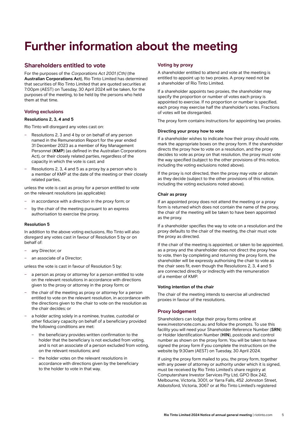 Further information about the meeting Shareholders entitled to vote For the purposes of the Corporations Act 2001 (Cth) (the Australian Corporations Act), Rio Tinto Limited has determined that securities of Rio Tinto Limited that are quoted securities at 7:00pm (AEST) on Tuesday, 30 April 2024 will be taken, for the purposes of the meeting, to be held by the persons who held them at that time. Voting exclusions Resolutions 2, 3, 4 and 5 Rio Tinto will disregard any votes cast on: – Resolutions 2, 3 and 4 by or on behalf of any person named in the Remuneration Report for the year ended 31 December 2023 as a member of Key Management Personnel (KMP) (as defined in the Australian Corporations Act), or their closely related parties, regardless of the capacity in which the vote is cast; and – Resolutions 2, 3, 4 and 5 as a proxy by a person who is a member of KMP at the date of the meeting or their closely related parties, unless the vote is cast as proxy for a person entitled to vote on the relevant resolutions (as applicable): – in accordance with a direction in the proxy form; or – by the chair of the meeting pursuant to an express authorisation to exercise the proxy. Resolution 5 In addition to the above voting exclusions, Rio Tinto will also disregard any votes cast in favour of Resolution 5 by or on behalf of: – any Director; or – an associate of a Director; unless the vote is cast in favour of Resolution 5 by: – a person as proxy or attorney for a person entitled to vote on the relevant resolutions in accordance with directions given to the proxy or attorney in the proxy form; or – the chair of the meeting as proxy or attorney for a person entitled to vote on the relevant resolution, in accordance with the directions given to the chair to vote on the resolution as the chair decides; or – a holder acting solely in a nominee, trustee, custodial or other fiduciary capacity on behalf of a beneficiary provided the following conditions are met: – the beneficiary provides written confirmation to the holder that the beneficiary is not excluded from voting, and is not an associate of a person excluded from voting, on the relevant resolutions; and – the holder votes on the relevant resolutions in accordance with directions given by the beneficiary to the holder to vote in that way. Voting by proxy A shareholder entitled to attend and vote at the meeting is entitled to appoint up to two proxies. A proxy need not be a shareholder of Rio Tinto Limited. If a shareholder appoints two proxies, the shareholder may specify the proportion or number of votes each proxy is appointed to exercise. If no proportion or number is specified, each proxy may exercise half the shareholder’s votes. Fractions of votes will be disregarded. The proxy form contains instructions for appointing two proxies. Directing your proxy how to vote If a shareholder wishes to indicate how their proxy should vote, mark the appropriate boxes on the proxy form. If the shareholder directs the proxy how to vote on a resolution, and the proxy decides to vote as proxy on that resolution, the proxy must vote the way specified (subject to the other provisions of this notice, including the voting exclusions noted above). If the proxy is not directed, then the proxy may vote or abstain as they decide (subject to the other provisions of this notice, including the voting exclusions noted above). Chair as proxy If an appointed proxy does not attend the meeting or a proxy form is returned which does not contain the name of the proxy, the chair of the meeting will be taken to have been appointed as the proxy. If a shareholder specifies the way to vote on a resolution and the proxy defaults to the chair of the meeting, the chair must vote the proxy as directed. If the chair of the meeting is appointed, or taken to be appointed, as a proxy and the shareholder does not direct the proxy how to vote, then by completing and returning the proxy form, the shareholder will be expressly authorising the chair to vote as the chair sees fit, even though the Resolutions 2, 3, 4 and 5 are connected directly or indirectly with the remuneration of a member of KMP. Voting intention of the chair The chair of the meeting intends to exercise all undirected proxies in favour of the resolutions. Proxy lodgement Shareholders can lodge their proxy forms online at www.investorvote.com.au and follow the prompts. To use this facility you will need your Shareholder Reference Number (SRN) or Holder Identification Number (HIN), postcode and control number as shown on the proxy form. You will be taken to have signed the proxy form if you complete the instructions on the website by 9:30am (AEST) on Tuesday, 30 April 2024. If using the proxy form mailed to you, the proxy form, together with any power of attorney or authority under which it is signed, must be received by Rio Tinto Limited’s share registry at Computershare Investor Services Pty Ltd, GPO Box 242, Melbourne, Victoria, 3001, or Yarra Falls, 452 Johnston Street, Abbotsford, Victoria, 3067 or at Rio Tinto Limited’s registered 5Rio Tinto Limited 2024 Notice of annual general meeting | riotinto.com