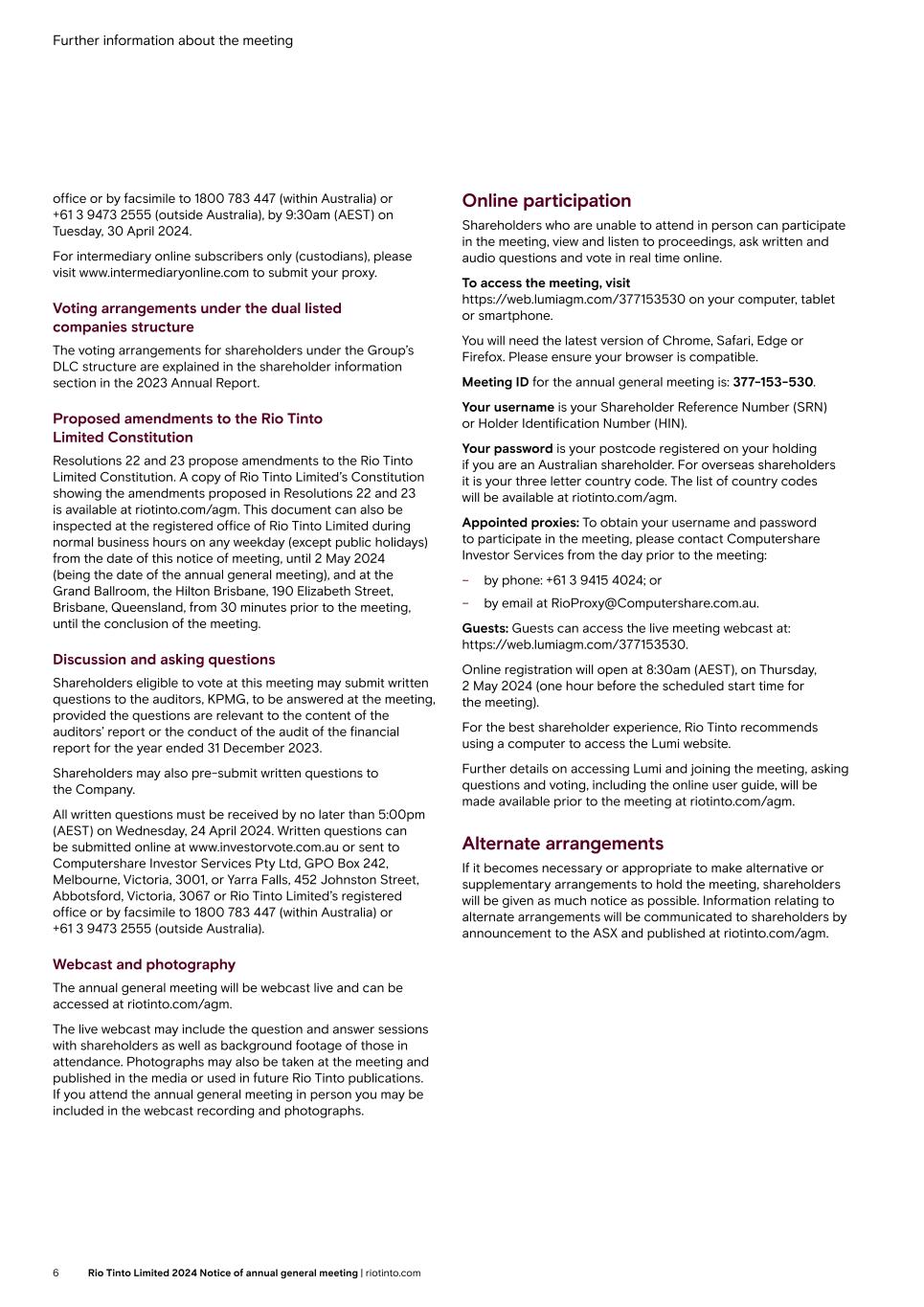 Further information about the meeting office or by facsimile to 1800 783 447 (within Australia) or +61 3 9473 2555 (outside Australia), by 9:30am (AEST) on Tuesday, 30 April 2024. For intermediary online subscribers only (custodians), please visit www.intermediaryonline.com to submit your proxy. Voting arrangements under the dual listed companies structure The voting arrangements for shareholders under the Group’s DLC structure are explained in the shareholder information section in the 2023 Annual Report. Proposed amendments to the Rio Tinto Limited Constitution Resolutions 22 and 23 propose amendments to the Rio Tinto Limited Constitution. A copy of Rio Tinto Limited’s Constitution showing the amendments proposed in Resolutions 22 and 23 is available at riotinto.com/agm. This document can also be inspected at the registered office of Rio Tinto Limited during normal business hours on any weekday (except public holidays) from the date of this notice of meeting, until 2 May 2024 (being the date of the annual general meeting), and at the Grand Ballroom, the Hilton Brisbane, 190 Elizabeth Street, Brisbane, Queensland, from 30 minutes prior to the meeting, until the conclusion of the meeting. Discussion and asking questions Shareholders eligible to vote at this meeting may submit written questions to the auditors, KPMG, to be answered at the meeting, provided the questions are relevant to the content of the auditors’ report or the conduct of the audit of the financial report for the year ended 31 December 2023. Shareholders may also pre-submit written questions to the Company. All written questions must be received by no later than 5:00pm (AEST) on Wednesday, 24 April 2024. Written questions can be submitted online at www.investorvote.com.au or sent to Computershare Investor Services Pty Ltd, GPO Box 242, Melbourne, Victoria, 3001, or Yarra Falls, 452 Johnston Street, Abbotsford, Victoria, 3067 or Rio Tinto Limited’s registered office or by facsimile to 1800 783 447 (within Australia) or +61 3 9473 2555 (outside Australia). Webcast and photography The annual general meeting will be webcast live and can be accessed at riotinto.com/agm. The live webcast may include the question and answer sessions with shareholders as well as background footage of those in attendance. Photographs may also be taken at the meeting and published in the media or used in future Rio Tinto publications. If you attend the annual general meeting in person you may be included in the webcast recording and photographs. Online participation Shareholders who are unable to attend in person can participate in the meeting, view and listen to proceedings, ask written and audio questions and vote in real time online. To access the meeting, visit https://web.lumiagm.com/377153530 on your computer, tablet or smartphone. You will need the latest version of Chrome, Safari, Edge or Firefox. Please ensure your browser is compatible. Meeting ID for the annual general meeting is: 377-153-530. Your username is your Shareholder Reference Number (SRN) or Holder Identification Number (HIN). Your password is your postcode registered on your holding if you are an Australian shareholder. For overseas shareholders it is your three letter country code. The list of country codes will be available at riotinto.com/agm. Appointed proxies: To obtain your username and password to participate in the meeting, please contact Computershare Investor Services from the day prior to the meeting: – by phone: +61 3 9415 4024; or – by email at RioProxy@Computershare.com.au. Guests: Guests can access the live meeting webcast at: https://web.lumiagm.com/377153530. Online registration will open at 8:30am (AEST), on Thursday, 2 May 2024 (one hour before the scheduled start time for the meeting). For the best shareholder experience, Rio Tinto recommends using a computer to access the Lumi website. Further details on accessing Lumi and joining the meeting, asking questions and voting, including the online user guide, will be made available prior to the meeting at riotinto.com/agm. Alternate arrangements If it becomes necessary or appropriate to make alternative or supplementary arrangements to hold the meeting, shareholders will be given as much notice as possible. Information relating to alternate arrangements will be communicated to shareholders by announcement to the ASX and published at riotinto.com/agm. 6 Rio Tinto Limited 2024 Notice of annual general meeting | riotinto.com