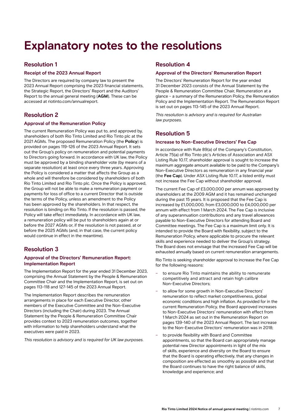 Explanatory notes to the resolutions Resolution 1 Receipt of the 2023 Annual Report The Directors are required by company law to present the 2023 Annual Report comprising the 2023 financial statements, the Strategic Report, the Directors’ Report and the Auditors’ Report to the annual general meeting (AGM). These can be accessed at riotinto.com/annualreport. Resolution 2 Approval of the Remuneration Policy The current Remuneration Policy was put to, and approved by, shareholders of both Rio Tinto Limited and Rio Tinto plc at the 2021 AGMs. The proposed Remuneration Policy (the Policy) is provided on pages 119-126 of the 2023 Annual Report. It sets out the Group’s policy on remuneration and potential payments to Directors going forward. In accordance with UK law, the Policy must be approved by a binding shareholder vote (by means of a separate resolution) at least once every three years. Approving the Policy is considered a matter that affects the Group as a whole and will therefore be considered by shareholders of both Rio Tinto Limited and Rio Tinto plc. Once the Policy is approved, the Group will not be able to make a remuneration payment or payments for loss of office to a current Director that is outside the terms of the Policy, unless an amendment to the Policy has been approved by the shareholders. In that respect, the resolution is binding on Rio Tinto. If the resolution is passed, the Policy will take effect immediately. In accordance with UK law, a remuneration policy will be put to shareholders again at or before the 2027 AGMs or, if the resolution is not passed, at or before the 2025 AGMs (and, in that case, the current policy would continue in effect in the meantime). Resolution 3 Approval of the Directors’ Remuneration Report: Implementation Report The Implementation Report for the year ended 31 December 2023, comprising the Annual Statement by the People & Remuneration Committee Chair and the Implementation Report, is set out on pages 113-118 and 127-145 of the 2023 Annual Report. The Implementation Report describes the remuneration arrangements in place for each Executive Director, other members of the Executive Committee and the Non-Executive Directors (including the Chair) during 2023. The Annual Statement by the People & Remuneration Committee Chair provides context to 2023 remuneration outcomes, together with information to help shareholders understand what the executives were paid in 2023. This resolution is advisory and is required for UK law purposes. Resolution 4 Approval of the Directors’ Remuneration Report The Directors’ Remuneration Report for the year ended 31 December 2023 consists of the Annual Statement by the People & Remuneration Committee Chair, Remuneration at a glance – a summary of the Remuneration Policy, the Remuneration Policy and the Implementation Report. The Remuneration Report is set out on pages 113-145 of the 2023 Annual Report. This resolution is advisory and is required for Australian law purposes. Resolution 5 Increase to Non-Executive Directors’ Fee Cap In accordance with Rule 89(a) of the Company’s Constitution, Article 75(a) of Rio Tinto plc’s Articles of Association and ASX Listing Rule 10.17, shareholder approval is sought to increase the maximum aggregate amount available to be paid to the Company’s Non-Executive Directors as remuneration in any financial year (the Fee Cap). Under ASX Listing Rule 10.17, a listed entity must not increase the Fee Cap without shareholder approval. The current Fee Cap of £3,000,000 per annum was approved by shareholders at the 2009 AGM and it has remained unchanged during the past 15 years. It is proposed that the Fee Cap is increased by £1,000,000, from £3,000,000 to £4,000,000 per annum with effect from 1 March 2024. The Fee Cap is inclusive of any superannuation contributions and any travel allowances payable to Non-Executive Directors for attending Board and Committee meetings. The Fee Cap is a maximum limit only. It is intended to provide the Board with flexibility, subject to the Remuneration Policy, where applicable to procure the relevant skills and experience needed to deliver the Group’s strategy. The Board does not envisage that the increased Fee Cap will be exhausted annually based on current remuneration arrangements. Rio Tinto is seeking shareholder approval to increase the Fee Cap for the following reasons: – to ensure Rio Tinto maintains the ability to remunerate competitively and attract and retain high calibre Non-Executive Directors; – to allow for some growth in Non-Executive Directors’ remuneration to reflect market competitiveness, global economic conditions and high inflation. As provided for in the current Remuneration Policy, the Board approved increases to Non-Executive Directors’ remuneration with effect from 1 March 2024 as set out in the Remuneration Report on pages 139-140 of the 2023 Annual Report. The last increase to the Non-Executive Directors’ remuneration was in 2018; – to provide flexibility with Board and Committee appointments, so that the Board can appropriately manage potential new Director appointments in light of the mix of skills, experience and diversity on the Board to ensure that the Board is operating effectively, that any changes in composition are effected as smoothly as possible and that the Board continues to have the right balance of skills, knowledge and experience; and 7Rio Tinto Limited 2024 Notice of annual general meeting | riotinto.com