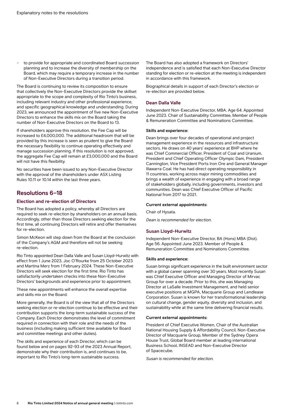 Explanatory notes to the resolutions – to provide for appropriate and coordinated Board succession planning and to increase the diversity of membership on the Board, which may require a temporary increase in the number of Non-Executive Directors during a transition period. The Board is continuing to review its composition to ensure that collectively the Non-Executive Directors provide the skillset appropriate to the scope and complexity of Rio Tinto’s business, including relevant industry and other professional experience, and specific geographical knowledge and understanding. During 2023, we announced the appointment of five new Non-Executive Directors to enhance the skills mix on the Board taking the number of Non-Executive Directors on the Board to 13. If shareholders approve this resolution, the Fee Cap will be increased to £4,000,000. The additional headroom that will be provided by this increase is seen as prudent to give the Board the necessary flexibility to continue operating effectively and manage succession planning. If this resolution is not approved, the aggregate Fee Cap will remain at £3,000,000 and the Board will not have this flexibility. No securities have been issued to any Non-Executive Director with the approval of the shareholders under ASX Listing Rules 10.11 or 10.14 within the last three years. Resolutions 6–18 Election and re-election of Directors The Board has adopted a policy, whereby all Directors are required to seek re-election by shareholders on an annual basis. Accordingly, other than those Directors seeking election for the first time, all continuing Directors will retire and offer themselves for re-election. Simon McKeon will step down from the Board at the conclusion of the Company’s AGM and therefore will not be seeking re-election. Rio Tinto appointed Dean Dalla Valle and Susan Lloyd-Hurwitz with effect from 1 June 2023, Joc O’Rourke from 25 October 2023 and Martina Merz from 1 February 2024. These Non-Executive Directors will seek election for the first time. Rio Tinto has satisfactorily undertaken checks into these Non-Executive Directors’ backgrounds and experience prior to appointment. These new appointments will enhance the overall expertise and skills mix on the Board. More generally, the Board is of the view that all of the Directors seeking election or re-election continue to be effective and their contribution supports the long-term sustainable success of the Company. Each Director demonstrates the level of commitment required in connection with their role and the needs of the business (including making sufficient time available for Board and committee meetings and other duties). The skills and experience of each Director, which can be found below and on pages 92-93 of the 2023 Annual Report, demonstrate why their contribution is, and continues to be, important to Rio Tinto’s long-term sustainable success. The Board has also adopted a framework on Directors’ independence and is satisfied that each Non-Executive Director standing for election or re-election at the meeting is independent in accordance with this framework. Biographical details in support of each Director’s election or re-election are provided below. Dean Dalla Valle Independent Non-Executive Director, MBA. Age 64. Appointed June 2023. Chair of Sustainability Committee, Member of People & Remuneration Committee and Nominations Committee. Skills and experience: Dean brings over four decades of operational and project management experience in the resources and infrastructure sectors. He draws on 40 years’ experience at BHP where he was Chief Commercial Officer, President of Coal and Uranium, President and Chief Operating Officer Olympic Dam, President Cannington, Vice President Ports Iron Ore and General Manager Illawarra Coal. He has had direct operating responsibility in 11 countries, working across major mining commodities and brings a wealth of experience in engaging with a broad range of stakeholders globally, including governments, investors and communities. Dean was Chief Executive Officer of Pacific National from 2017 to 2021. Current external appointments: Chair of Hysata. Dean is recommended for election. Susan Lloyd-Hurwitz Independent Non-Executive Director, BA (Hons) MBA (Dist). Age 56. Appointed June 2023. Member of People & Remuneration Committee and Nominations Committee. Skills and experience: Susan brings significant experience in the built environment sector with a global career spanning over 30 years. Most recently Susan was Chief Executive Officer and Managing Director of Mirvac Group for over a decade. Prior to this, she was Managing Director at LaSalle Investment Management, and held senior executive positions at MGPA, Macquarie Group and Lendlease Corporation. Susan is known for her transformational leadership on cultural change, gender equity, diversity and inclusion, and sustainability while at the same time delivering financial results. Current external appointments: President of Chief Executive Women, Chair of the Australian National Housing Supply & Affordability Council, Non-Executive Director of Macquarie Group, Member of the Sydney Opera House Trust, Global Board member at leading international Business School, INSEAD and Non-Executive Director of Spacecube. Susan is recommended for election. 8 Rio Tinto Limited 2024 Notice of annual general meeting | riotinto.com