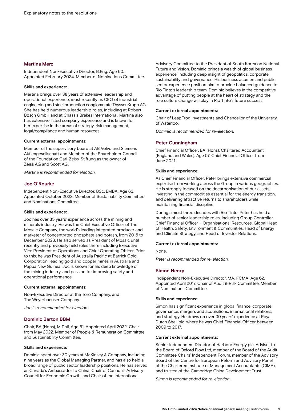 Explanatory notes to the resolutions Martina Merz Independent Non-Executive Director, B.Eng. Age 60. Appointed February 2024. Member of Nominations Committee. Skills and experience: Martina brings over 38 years of extensive leadership and operational experience, most recently as CEO of industrial engineering and steel production conglomerate ThyssenKrupp AG. She has held numerous leadership roles, including at Robert Bosch GmbH and at Chassis Brakes International. Martina also has extensive listed company experience and is known for her expertise in the areas of strategy, risk management, legal/compliance and human resources. Current external appointments: Member of the supervisory board at AB Volvo and Siemens Aktiengesellschaft and Member of the Shareholder Council of the Foundation Carl-Zeiss-Stiftung as the owner of Zeiss AG and Scott AG. Martina is recommended for election. Joc O’Rourke Independent Non-Executive Director, BSc, EMBA. Age 63. Appointed October 2023. Member of Sustainability Committee and Nominations Committee. Skills and experience: Joc has over 35 years’ experience across the mining and minerals industry. He was the Chief Executive Officer of The Mosaic Company, the world’s leading integrated producer and marketer of concentrated phosphate and potash, from 2015 to December 2023. He also served as President of Mosaic until recently and previously held roles there including Executive Vice President of Operations and Chief Operating Officer. Prior to this, he was President of Australia Pacific at Barrick Gold Corporation, leading gold and copper mines in Australia and Papua New Guinea. Joc is known for his deep knowledge of the mining industry, and passion for improving safety and operational performance. Current external appointments: Non-Executive Director at the Toro Company, and The Weyerhaeuser Company. Joc is recommended for election. Dominic Barton BBM Chair, BA (Hons), M.Phil, Age 61. Appointed April 2022. Chair from May 2022. Member of People & Remuneration Committee and Sustainability Committee. Skills and experience: Dominic spent over 30 years at McKinsey & Company, including nine years as the Global Managing Partner, and has also held a broad range of public sector leadership positions. He has served as Canada’s Ambassador to China, Chair of Canada’s Advisory Council for Economic Growth, and Chair of the International Advisory Committee to the President of South Korea on National Future and Vision. Dominic brings a wealth of global business experience, including deep insight of geopolitics, corporate sustainability and governance. His business acumen and public sector experience position him to provide balanced guidance to Rio Tinto’s leadership team. Dominic believes in the competitive advantage of putting people at the heart of strategy and the role culture change will play in Rio Tinto’s future success. Current external appointments: Chair of LeapFrog Investments and Chancellor of the University of Waterloo. Dominic is recommended for re-election. Peter Cunningham Chief Financial Officer, BA (Hons), Chartered Accountant (England and Wales). Age 57. Chief Financial Officer from June 2021. Skills and experience: As Chief Financial Officer, Peter brings extensive commercial expertise from working across the Group in various geographies. He is strongly focused on the decarbonisation of our assets, investing in the commodities essential for the energy transition, and delivering attractive returns to shareholders while maintaining financial discipline. During almost three decades with Rio Tinto, Peter has held a number of senior leadership roles, including Group Controller, Chief Financial Officer – Organisational Resources, Global Head of Health, Safety, Environment & Communities, Head of Energy and Climate Strategy, and Head of Investor Relations. Current external appointments: None. Peter is recommended for re-election. Simon Henry Independent Non-Executive Director, MA, FCMA. Age 62. Appointed April 2017. Chair of Audit & Risk Committee. Member of Nominations Committee. Skills and experience: Simon has significant experience in global finance, corporate governance, mergers and acquisitions, international relations, and strategy. He draws on over 30 years’ experience at Royal Dutch Shell plc, where he was Chief Financial Officer between 2009 to 2017. Current external appointments: Senior Independent Director of Harbour Energy plc, Adviser to the Board of Oxford Flow Ltd, member of the Board of the Audit Committee Chairs’ Independent Forum, member of the Advisory Board of the Centre for European Reform and Advisory Panel of the Chartered Institute of Management Accountants (CIMA), and trustee of the Cambridge China Development Trust. Simon is recommended for re-election. 9Rio Tinto Limited 2024 Notice of annual general meeting | riotinto.com