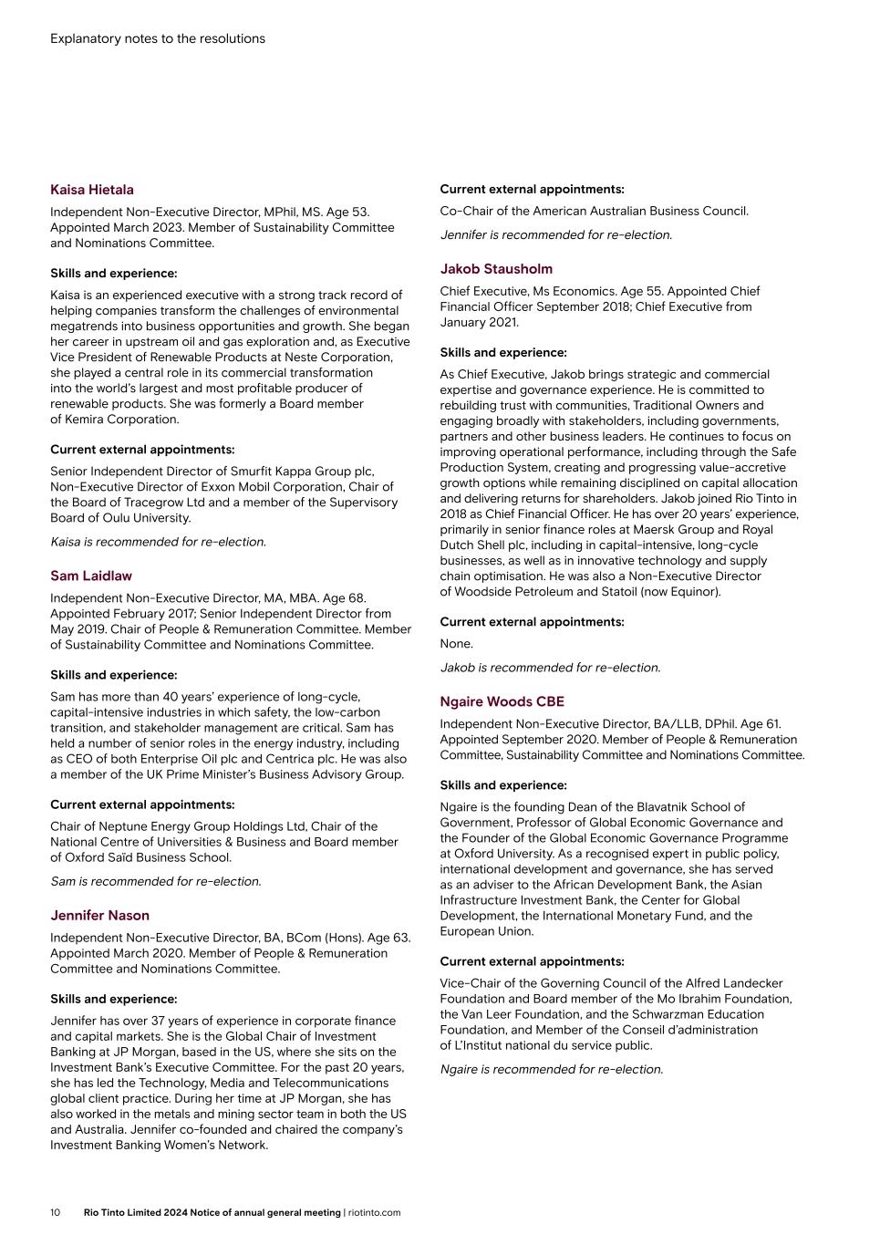 Explanatory notes to the resolutions Kaisa Hietala Independent Non-Executive Director, MPhil, MS. Age 53. Appointed March 2023. Member of Sustainability Committee and Nominations Committee. Skills and experience: Kaisa is an experienced executive with a strong track record of helping companies transform the challenges of environmental megatrends into business opportunities and growth. She began her career in upstream oil and gas exploration and, as Executive Vice President of Renewable Products at Neste Corporation, she played a central role in its commercial transformation into the world’s largest and most profitable producer of renewable products. She was formerly a Board member of Kemira Corporation. Current external appointments: Senior Independent Director of Smurfit Kappa Group plc, Non-Executive Director of Exxon Mobil Corporation, Chair of the Board of Tracegrow Ltd and a member of the Supervisory Board of Oulu University. Kaisa is recommended for re-election. Sam Laidlaw Independent Non-Executive Director, MA, MBA. Age 68. Appointed February 2017; Senior Independent Director from May 2019. Chair of People & Remuneration Committee. Member of Sustainability Committee and Nominations Committee. Skills and experience: Sam has more than 40 years’ experience of long-cycle, capital-intensive industries in which safety, the low-carbon transition, and stakeholder management are critical. Sam has held a number of senior roles in the energy industry, including as CEO of both Enterprise Oil plc and Centrica plc. He was also a member of the UK Prime Minister’s Business Advisory Group. Current external appointments: Chair of Neptune Energy Group Holdings Ltd, Chair of the National Centre of Universities & Business and Board member of Oxford Saïd Business School. Sam is recommended for re-election. Jennifer Nason Independent Non-Executive Director, BA, BCom (Hons). Age 63. Appointed March 2020. Member of People & Remuneration Committee and Nominations Committee. Skills and experience: Jennifer has over 37 years of experience in corporate finance and capital markets. She is the Global Chair of Investment Banking at JP Morgan, based in the US, where she sits on the Investment Bank’s Executive Committee. For the past 20 years, she has led the Technology, Media and Telecommunications global client practice. During her time at JP Morgan, she has also worked in the metals and mining sector team in both the US and Australia. Jennifer co-founded and chaired the company’s Investment Banking Women’s Network. Current external appointments: Co-Chair of the American Australian Business Council. Jennifer is recommended for re-election. Jakob Stausholm Chief Executive, Ms Economics. Age 55. Appointed Chief Financial Officer September 2018; Chief Executive from January 2021. Skills and experience: As Chief Executive, Jakob brings strategic and commercial expertise and governance experience. He is committed to rebuilding trust with communities, Traditional Owners and engaging broadly with stakeholders, including governments, partners and other business leaders. He continues to focus on improving operational performance, including through the Safe Production System, creating and progressing value-accretive growth options while remaining disciplined on capital allocation and delivering returns for shareholders. Jakob joined Rio Tinto in 2018 as Chief Financial Officer. He has over 20 years’ experience, primarily in senior finance roles at Maersk Group and Royal Dutch Shell plc, including in capital-intensive, long-cycle businesses, as well as in innovative technology and supply chain optimisation. He was also a Non-Executive Director of Woodside Petroleum and Statoil (now Equinor). Current external appointments: None. Jakob is recommended for re-election. Ngaire Woods CBE Independent Non-Executive Director, BA/LLB, DPhil. Age 61. Appointed September 2020. Member of People & Remuneration Committee, Sustainability Committee and Nominations Committee. Skills and experience: Ngaire is the founding Dean of the Blavatnik School of Government, Professor of Global Economic Governance and the Founder of the Global Economic Governance Programme at Oxford University. As a recognised expert in public policy, international development and governance, she has served as an adviser to the African Development Bank, the Asian Infrastructure Investment Bank, the Center for Global Development, the International Monetary Fund, and the European Union. Current external appointments: Vice-Chair of the Governing Council of the Alfred Landecker Foundation and Board member of the Mo Ibrahim Foundation, the Van Leer Foundation, and the Schwarzman Education Foundation, and Member of the Conseil d’administration of L’Institut national du service public. Ngaire is recommended for re-election. 10 Rio Tinto Limited 2024 Notice of annual general meeting | riotinto.com
