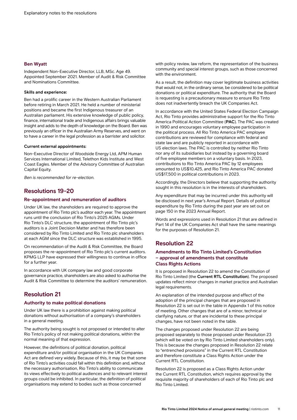 Explanatory notes to the resolutions Ben Wyatt Independent Non-Executive Director, LLB, MSc. Age 49. Appointed September 2021. Member of Audit & Risk Committee and Nominations Committee. Skills and experience: Ben had a prolific career in the Western Australian Parliament before retiring in March 2021. He held a number of ministerial positions and became the first Indigenous treasurer of an Australian parliament. His extensive knowledge of public policy, finance, international trade and Indigenous affairs brings valuable insight and adds to the depth of knowledge on the Board. Ben was previously an officer in the Australian Army Reserves, and went on to have a career in the legal profession as a barrister and solicitor. Current external appointments: Non-Executive Director of Woodside Energy Ltd, APM Human Services International Limited, Telethon Kids Institute and West Coast Eagles. Member of the Advisory Committee of Australian Capital Equity. Ben is recommended for re-election. Resolutions 19-20 Re-appointment and remuneration of auditors Under UK law, the shareholders are required to approve the appointment of Rio Tinto plc’s auditor each year. The appointment runs until the conclusion of Rio Tinto’s 2025 AGMs. Under Rio Tinto’s DLC structure, the appointment of Rio Tinto plc’s auditors is a Joint Decision Matter and has therefore been considered by Rio Tinto Limited and Rio Tinto plc shareholders at each AGM since the DLC structure was established in 1995. On recommendation of the Audit & Risk Committee, the Board proposes the re-appointment of Rio Tinto plc’s current auditors. KPMG LLP have expressed their willingness to continue in office for a further year. In accordance with UK company law and good corporate governance practice, shareholders are also asked to authorise the Audit & Risk Committee to determine the auditors’ remuneration. Resolution 21 Authority to make political donations Under UK law there is a prohibition against making political donations without authorisation of a company’s shareholders in a general meeting. The authority being sought is not proposed or intended to alter Rio Tinto’s policy of not making political donations, within the normal meaning of that expression. However, the definitions of political donation, political expenditure and/or political organisation in the UK Companies Act are defined very widely. Because of this, it may be that some of Rio Tinto’s activities could fall within this definition and, without the necessary authorisation, Rio Tinto’s ability to communicate its views effectively to political audiences and to relevant interest groups could be inhibited. In particular, the definition of political organisations may extend to bodies such as those concerned with policy review, law reform, the representation of the business community and special interest groups, such as those concerned with the environment. As a result, the definition may cover legitimate business activities that would not, in the ordinary sense, be considered to be political donations or political expenditure. The authority that the Board is requesting is a precautionary measure to ensure Rio Tinto does not inadvertently breach the UK Companies Act. In accordance with the United States Federal Election Campaign Act, Rio Tinto provides administrative support for the Rio Tinto America Political Action Committee (PAC). The PAC was created in 1990 and encourages voluntary employee participation in the political process. All Rio Tinto America PAC employee contributions are reviewed for compliance with federal and state law and are publicly reported in accordance with US election laws. The PAC is controlled by neither Rio Tinto nor any of its subsidiaries but instead by a governing board of five employee members on a voluntary basis. In 2023, contributions to Rio Tinto America PAC by 12 employees amounted to US$10,425, and Rio Tinto America PAC donated US$17,500 in political contributions in 2023. Accordingly, the Directors believe that supporting the authority sought in this resolution is in the interests of shareholders. Any expenditure that may be incurred under this authority will be disclosed in next year’s Annual Report. Details of political expenditure by Rio Tinto during the past year are set out on page 150 in the 2023 Annual Report. Words and expressions used in Resolution 21 that are defined in Part 14 of the UK Companies Act shall have the same meanings for the purposes of Resolution 21. Resolution 22 Amendments to Rio Tinto Limited’s Constitution – approval of amendments that constitute Class Rights Actions It is proposed in Resolution 22 to amend the Constitution of Rio Tinto Limited (the Current RTL Constitution). The proposed updates reflect minor changes in market practice and Australian legal requirements. An explanation of the intended purpose and effect of the adoption of the principal changes that are proposed in Resolution 22 is set out in the table in Appendix 1 of this notice of meeting. Other changes that are of a minor, technical or clarifying nature, or that are incidental to these principal changes, have not been noted in the table. The changes proposed under Resolution 22 are being proposed separately to those proposed under Resolution 23 (which will be voted on by Rio Tinto Limited shareholders only). This is because the changes proposed in Resolution 22 relate to “entrenched provisions” in the Current RTL Constitution and therefore constitute a Class Rights Action under the Current RTL Constitution. Resolution 22 is proposed as a Class Rights Action under the Current RTL Constitution, which requires approval by the requisite majority of shareholders of each of Rio Tinto plc and Rio Tinto Limited. 11Rio Tinto Limited 2024 Notice of annual general meeting | riotinto.com