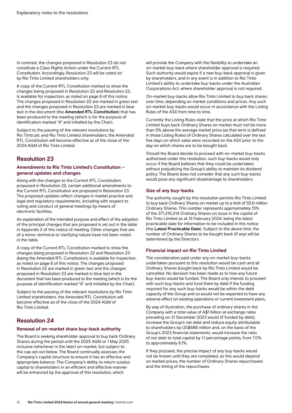 Explanatory notes to the resolutions In contrast, the changes proposed in Resolution 23 do not constitute a Class Rights Action under the Current RTL Constitution. Accordingly, Resolution 23 will be voted on by Rio Tinto Limited shareholders only. A copy of the Current RTL Constitution marked to show the changes being proposed in Resolution 22 and Resolution 23, is available for inspection, as noted on page 6 of this notice. The changes proposed in Resolution 22 are marked in green text and the changes proposed in Resolution 23 are marked in blue text in the document (the Amended RTL Constitution) that has been produced to the meeting (which is for the purpose of identification marked “A” and initialled by the Chair). Subject to the passing of the relevant resolutions by Rio Tinto plc and Rio Tinto Limited shareholders, the Amended RTL Constitution will become effective as of the close of the 2024 AGM of Rio Tinto Limited. Resolution 23 Amendments to Rio Tinto Limited’s Constitution – general updates and changes Along with the changes to the Current RTL Constitution proposed in Resolution 22, certain additional amendments to the Current RTL Constitution are proposed in Resolution 23. The proposed updates reflect changes in market practice and legal and regulatory requirements, including with respect to voting and conduct of general meetings by means of electronic facilities. An explanation of the intended purpose and effect of the adoption of the principal changes that are proposed is set out in the table in Appendix 2 of this notice of meeting. Other changes that are of a minor, technical or clarifying nature have not been noted in the table. A copy of the Current RTL Constitution marked to show the changes being proposed in Resolution 22 and Resolution 23 (being the Amended RTL Constitution), is available for inspection, as noted on page 6 of this notice. The changes proposed in Resolution 22 are marked in green text and the changes proposed in Resolution 23 are marked in blue text in the document that has been produced to the meeting (which is for the purpose of identification marked “A” and initialled by the Chair). Subject to the passing of the relevant resolutions by Rio Tinto Limited shareholders, the Amended RTL Constitution will become effective as of the close of the 2024 AGM of Rio Tinto Limited. Resolution 24 Renewal of on-market share buy-back authority The Board is seeking shareholder approval to buy back Ordinary Shares during the period until the 2025 AGM or 1 May 2025 inclusive (whichever is the later) on-market, but subject to the cap set out below. The Board continually assesses the Company’s capital structure to ensure it has an effective and appropriate balance. The Company’s ability to return surplus capital to shareholders in an efficient and effective manner will be enhanced by the approval of this resolution, which will provide the Company with the flexibility to undertake an on-market buy-back where shareholder approval is required. Such authority would expire if a new buy-back approval is given by shareholders, and in any event is in addition to Rio Tinto Limited’s ability to undertake buy-backs under the Australian Corporations Act, where shareholder approval is not required. On-market buy-backs allow Rio Tinto Limited to buy back shares over time, depending on market conditions and prices. Any such on-market buy-backs would occur in accordance with the Listing Rules of the ASX from time to time. Currently the Listing Rules state that the price at which Rio Tinto Limited buys back Ordinary Shares on market must not be more than 5% above the average market price (as that term is defined in those Listing Rules) of Ordinary Shares calculated over the last five days on which sales were recorded on the ASX prior to the day on which shares are to be bought back. Should the Board decide to proceed with on-market buy-backs authorised under this resolution, such buy-backs would only occur if the Board believes that they could be undertaken without prejudicing the Group’s ability to maintain its dividend policy. The Board does not consider that any such buy-backs would pose any significant disadvantage to shareholders. Size of any buy-backs The authority sought by this resolution permits Rio Tinto Limited to buy back Ordinary Shares on market up to a limit of 55.6 million Ordinary Shares. This number represents approximately 15% of the 371,216,214 Ordinary Shares on issue in the capital of Rio Tinto Limited as at 13 February 2024, being the latest practicable date for information to be included in this notice (the Latest Practicable Date). Subject to the above limit, the number of Ordinary Shares to be bought back (if any) will be determined by the Directors. Financial impact on Rio Tinto Limited The consideration paid under any on-market buy-backs undertaken pursuant to this resolution would be cash and all Ordinary Shares bought back by Rio Tinto Limited would be cancelled. No decision has been made as to how any future buy-backs would be funded. The Board only intends to proceed with such buy-backs and fund them by debt if the funding required for any such buy-backs would be within the debt capacity of the Group and so would not be expected to have any adverse effect on existing operations or current investment plans. By way of illustration, the purchase of ordinary shares in the Company with a total value of A$1 billion at exchange rates prevailing on 31 December 2023 would (if funded by debt), increase the Group’s net debt and reduce equity attributable to shareholders by US$686 million and, on the basis of the Group’s 2023 financial statements, would increase the ratio of net debt to total capital by 1.1 percentage points, from 7.0% to approximately 8.1%. If they proceed, the precise impact of any buy-backs would not be known until they are completed, as this would depend on market prices, the number of Ordinary Shares repurchased and the t