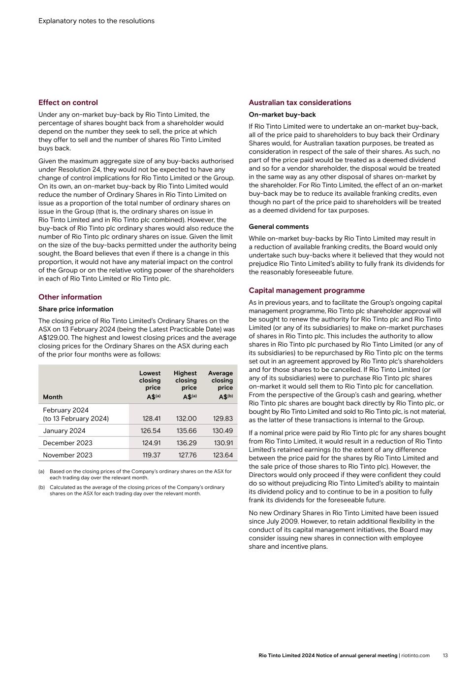 Explanatory notes to the resolutions Effect on control Under any on-market buy-back by Rio Tinto Limited, the percentage of shares bought back from a shareholder would depend on the number they seek to sell, the price at which they offer to sell and the number of shares Rio Tinto Limited buys back. Given the maximum aggregate size of any buy-backs authorised under Resolution 24, they would not be expected to have any change of control implications for Rio Tinto Limited or the Group. On its own, an on-market buy-back by Rio Tinto Limited would reduce the number of Ordinary Shares in Rio Tinto Limited on issue as a proportion of the total number of ordinary shares on issue in the Group (that is, the ordinary shares on issue in Rio Tinto Limited and in Rio Tinto plc combined). However, the buy-back of Rio Tinto plc ordinary shares would also reduce the number of Rio Tinto plc ordinary shares on issue. Given the limit on the size of the buy-backs permitted under the authority being sought, the Board believes that even if there is a change in this proportion, it would not have any material impact on the control of the Group or on the relative voting power of the shareholders in each of Rio Tinto Limited or Rio Tinto plc. Other information Share price information The closing price of Rio Tinto Limited’s Ordinary Shares on the ASX on 13 February 2024 (being the Latest Practicable Date) was A$129.00. The highest and lowest closing prices and the average closing prices for the Ordinary Shares on the ASX during each of the prior four months were as follows: Month Lowest closing price A$(a) Highest closing price A$(a) Average closing price A$(b) February 2024 (to 13 February 2024) 128.41 132.00 129.83 January 2024 126.54 135.66 130.49 December 2023 124.91 136.29 130.91 November 2023 119.37 127.76 123.64 (a) Based on the closing prices of the Company’s ordinary shares on the ASX for each trading day over the relevant month. (b) Calculated as the average of the closing prices of the Company’s ordinary shares on the ASX for each trading day over the relevant month. Australian tax considerations On-market buy-back If Rio Tinto Limited were to undertake an on-market buy-back, all of the price paid to shareholders to buy back their Ordinary Shares would, for Australian taxation purposes, be treated as consideration in respect of the sale of their shares. As such, no part of the price paid would be treated as a deemed dividend and so for a vendor shareholder, the disposal would be treated in the same way as any other disposal of shares on-market by the shareholder. For Rio Tinto Limited, the effect of an on-market buy-back may be to reduce its available franking credits, even though no part of the price paid to shareholders will be treated as a deemed dividend for tax purposes. General comments While on-market buy-backs by Rio Tinto Limited may result in a reduction of available franking credits, the Board would only undertake such buy-backs where it believed that they would not prejudice Rio Tinto Limited’s ability to fully frank its dividends for the reasonably foreseeable future. Capital management programme As in previous years, and to facilitate the Group’s ongoing capital management programme, Rio Tinto plc shareholder approval will be sought to renew the authority for Rio Tinto plc and Rio Tinto Limited (or any of its subsidiaries) to make on-market purchases of shares in Rio Tinto plc. This includes the authority to allow shares in Rio Tinto plc purchased by Rio Tinto Limited (or any of its subsidiaries) to be repurchased by Rio Tinto plc on the terms set out in an agreement approved by Rio Tinto plc’s shareholders and for those shares to be cancelled. If Rio Tinto Limited (or any of its subsidiaries) were to purchase Rio Tinto plc shares on-market it would sell them to Rio Tinto plc for cancellation. From the perspective of the Group’s cash and gearing, whether Rio Tinto plc shares are bought back directly by Rio Tinto plc, or bought by Rio Tinto Limited and sold to Rio Tinto plc, is not material, as the latter of these transactions is internal to the Group. If a nominal price were paid by Rio Tinto plc for any shares bought from Rio Tinto Limited, it would result in a reduction of Rio Tinto Limited’s retained earnings (to the extent of any difference between the price paid for the shares by Rio Tinto Limited and the sale price of those shares to Rio Tinto plc). However, the Directors would only proceed if they were confident they could do so without prejudicing Rio Tinto Limited’s ability to maintain its dividend policy and to continue to be in a position to fully frank its dividends for the foreseeable future. No new Ordinary Shares in Rio Tinto Limited have been issued since July 2009. However, to retain additional flexibility in the conduct of its capital management initiatives, the Board may consider issuing new shares in connection with employee share and incentive plans. 13Rio Tinto Limited 2024 Notice of annual general meeting | riotinto.com