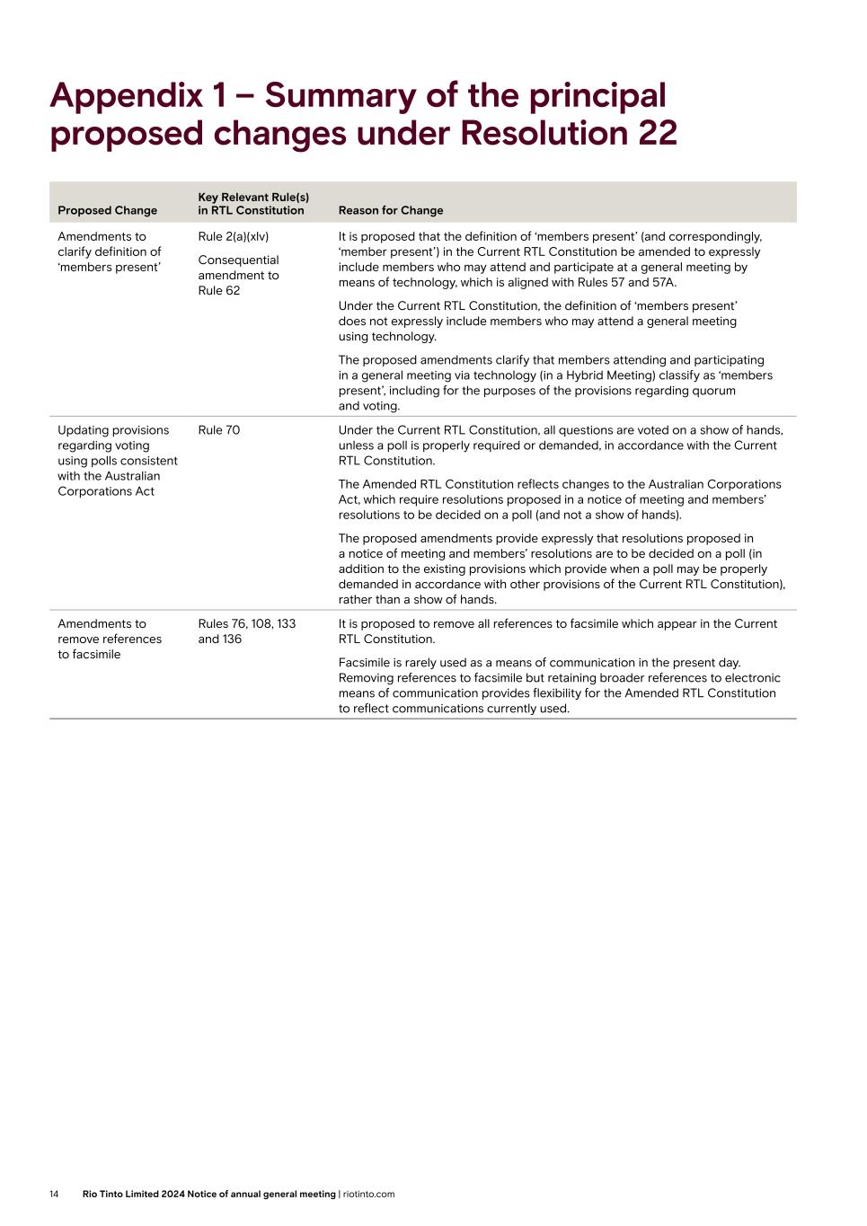 Appendix 1 – Summary of the principal proposed changes under Resolution 22 Proposed Change Key Relevant Rule(s) in RTL Constitution Reason for Change Amendments to clarify definition of ‘members present’ Rule 2(a)(xlv) Consequential amendment to Rule 62 It is proposed that the definition of ‘members present’ (and correspondingly, ‘member present’) in the Current RTL Constitution be amended to expressly include members who may attend and participate at a general meeting by means of technology, which is aligned with Rules 57 and 57A. Under the Current RTL Constitution, the definition of ‘members present’ does not expressly include members who may attend a general meeting using technology. The proposed amendments clarify that members attending and participating in a general meeting via technology (in a Hybrid Meeting) classify as ‘members present’, including for the purposes of the provisions regarding quorum and voting. Updating provisions regarding voting using polls consistent with the Australian Corporations Act Rule 70 Under the Current RTL Constitution, all questions are voted on a show of hands, unless a poll is properly required or demanded, in accordance with the Current RTL Constitution. The Amended RTL Constitution reflects changes to the Australian Corporations Act, which require resolutions proposed in a notice of meeting and members’ resolutions to be decided on a poll (and not a show of hands). The proposed amendments provide expressly that resolutions proposed in a notice of meeting and members’ resolutions are to be decided on a poll (in addition to the existing provisions which provide when a poll may be properly demanded in accordance with other provisions of the Current RTL Constitution), rather than a show of hands. Amendments to remove references to facsimile Rules 76, 108, 133 and 136 It is proposed to remove all references to facsimile which appear in the Current RTL Constitution. Facsimile is rarely used as a means of communication in the present day. Removing references to facsimile but retaining broader references to electronic means of communication provides flexibility for the Amended RTL Constitution to reflect communications currently used. 14 Rio Tinto Limited 2024 Notice of annual general meeting | riotinto.com