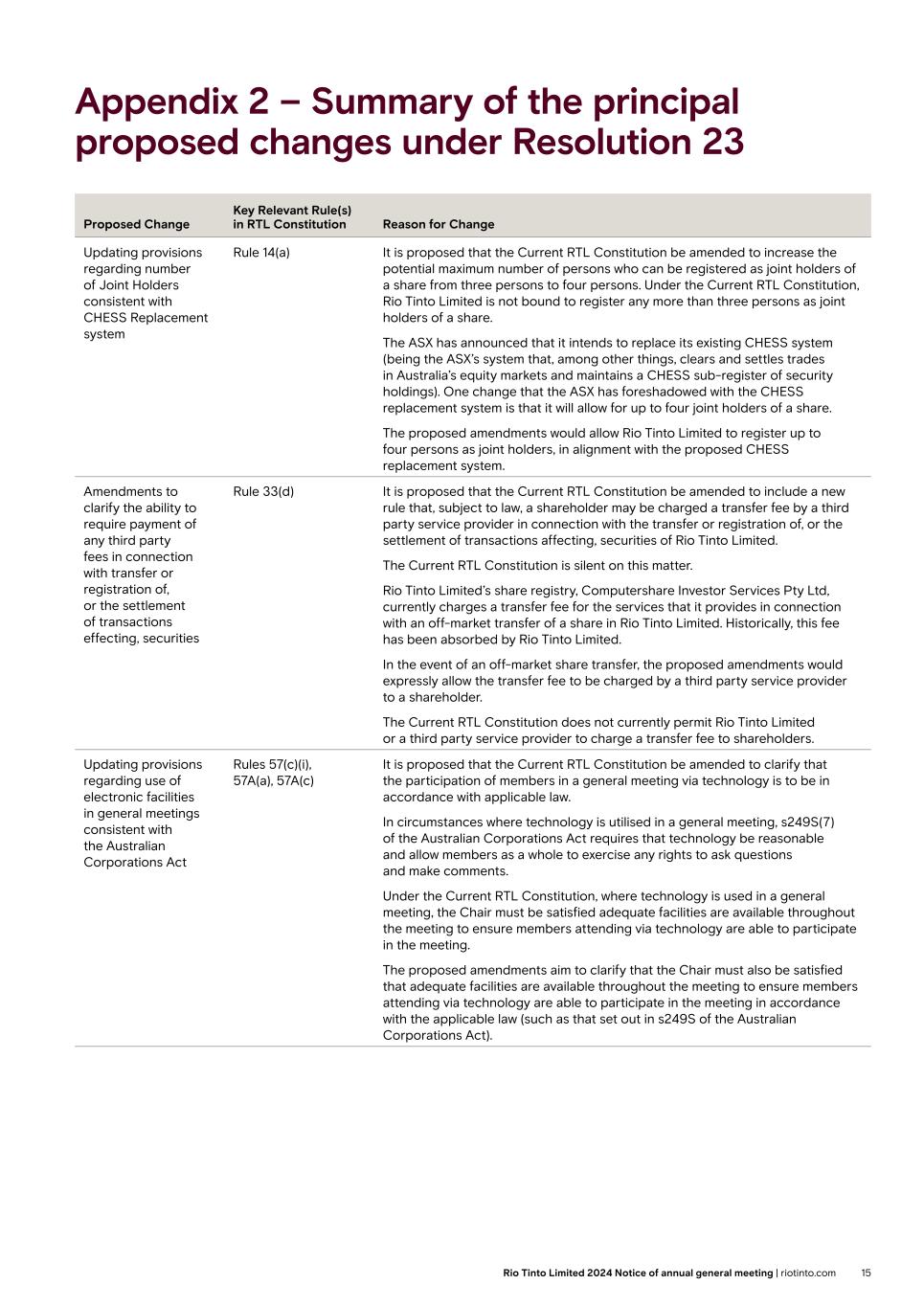 Appendix 2 – Summary of the principal proposed changes under Resolution 23 Proposed Change Key Relevant Rule(s) in RTL Constitution Reason for Change Updating provisions regarding number of Joint Holders consistent with CHESS Replacement system Rule 14(a) It is proposed that the Current RTL Constitution be amended to increase the potential maximum number of persons who can be registered as joint holders of a share from three persons to four persons. Under the Current RTL Constitution, Rio Tinto Limited is not bound to register any more than three persons as joint holders of a share. The ASX has announced that it intends to replace its existing CHESS system (being the ASX’s system that, among other things, clears and settles trades in Australia’s equity markets and maintains a CHESS sub-register of security holdings). One change that the ASX has foreshadowed with the CHESS replacement system is that it will allow for up to four joint holders of a share. The proposed amendments would allow Rio Tinto Limited to register up to four persons as joint holders, in alignment with the proposed CHESS replacement system. Amendments to clarify the ability to require payment of any third party fees in connection with transfer or registration of, or the settlement of transactions effecting, securities Rule 33(d) It is proposed that the Current RTL Constitution be amended to include a new rule that, subject to law, a shareholder may be charged a transfer fee by a third party service provider in connection with the transfer or registration of, or the settlement of transactions affecting, securities of Rio Tinto Limited. The Current RTL Constitution is silent on this matter. Rio Tinto Limited’s share registry, Computershare Investor Services Pty Ltd, currently charges a transfer fee for the services that it provides in connection with an off-market transfer of a share in Rio Tinto Limited. Historically, this fee has been absorbed by Rio Tinto Limited. In the event of an off-market share transfer, the proposed amendments would expressly allow the transfer fee to be charged by a third party service provider to a shareholder. The Current RTL Constitution does not currently permit Rio Tinto Limited or a third party service provider to charge a transfer fee to shareholders. Updating provisions regarding use of electronic facilities in general meetings consistent with the Australian Corporations Act Rules 57(c)(i), 57A(a), 57A(c) It is proposed that the Current RTL Constitution be amended to clarify that the participation of members in a general meeting via technology is to be in accordance with applicable law. In circumstances where technology is utilised in a general meeting, s249S(7) of the Australian Corporations Act requires that technology be reasonable and allow members as a whole to exercise any rights to ask questions and make comments. Under the Current RTL Constitution, where technology is used in a general meeting, the Chair must be satisfied adequate facilities are available throughout the meeting to ensure members attending via technology are able to participate in the meeting. The proposed amendments aim to clarify that the Chair must also be satisfied that adequate facilities are available throughout the meeting to ensure members attending via technology are able to participate in the meeting in accordance with the applicable law (such as that set out in s249S of the Australian Corporations Act). 15Rio Tinto Limited 2024 Notice of annual general meeting | riotinto.com