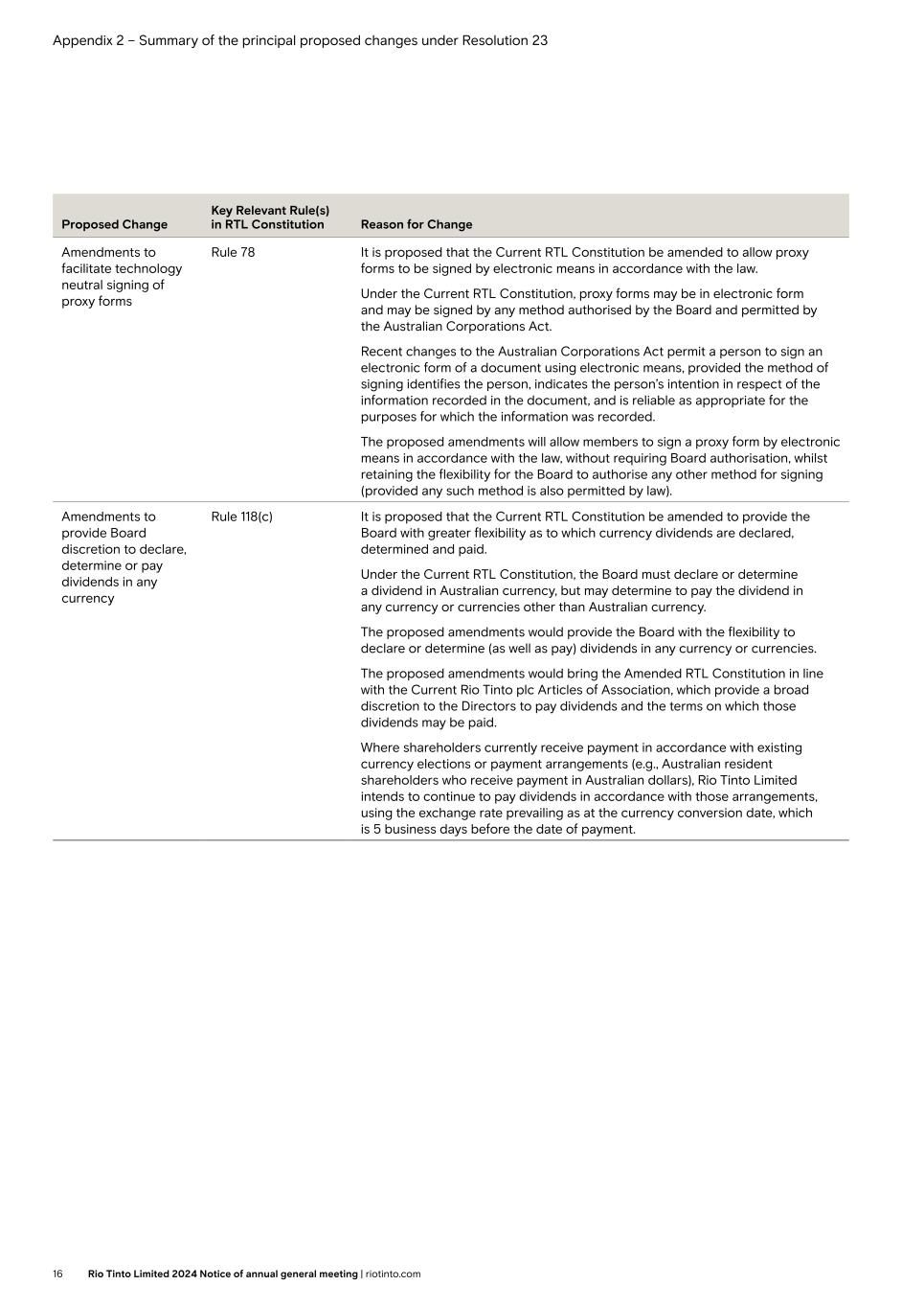 Appendix 2 – Summary of the principal proposed changes under Resolution 23 Proposed Change Key Relevant Rule(s) in RTL Constitution Reason for Change Amendments to facilitate technology neutral signing of proxy forms Rule 78 It is proposed that the Current RTL Constitution be amended to allow proxy forms to be signed by electronic means in accordance with the law. Under the Current RTL Constitution, proxy forms may be in electronic form and may be signed by any method authorised by the Board and permitted by the Australian Corporations Act. Recent changes to the Australian Corporations Act permit a person to sign an electronic form of a document using electronic means, provided the method of signing identifies the person, indicates the person’s intention in respect of the information recorded in the document, and is reliable as appropriate for the purposes for which the information was recorded. The proposed amendments will allow members to sign a proxy form by electronic means in accordance with the law, without requiring Board authorisation, whilst retaining the flexibility for the Board to authorise any other method for signing (provided any such method is also permitted by law). Amendments to provide Board discretion to declare, determine or pay dividends in any currency Rule 118(c) It is proposed that the Current RTL Constitution be amended to provide the Board with greater flexibility as to which currency dividends are declared, determined and paid. Under the Current RTL Constitution, the Board must declare or determine a dividend in Australian currency, but may determine to pay the dividend in any currency or currencies other than Australian currency. The proposed amendments would provide the Board with the flexibility to declare or determine (as well as pay) dividends in any currency or currencies. The proposed amendments would bring the Amended RTL Constitution in line with the Current Rio Tinto plc Articles of Association, which provide a broad discretion to the Directors to pay dividends and the terms on which those dividends may be paid. Where shareholders currently receive payment in accordance with existing currency elections or payment arrangements (e.g., Australian resident shareholders who receive payment in Australian dollars), Rio Tinto Limited intends to continue to pay dividends in accordance with those arrangements, using the exchange rate prevailing as at the currency conversion date, which is 5 business days before the date of payment. 16 Rio Tinto Limited 2024 Notice of annual general meeting | riotinto.com