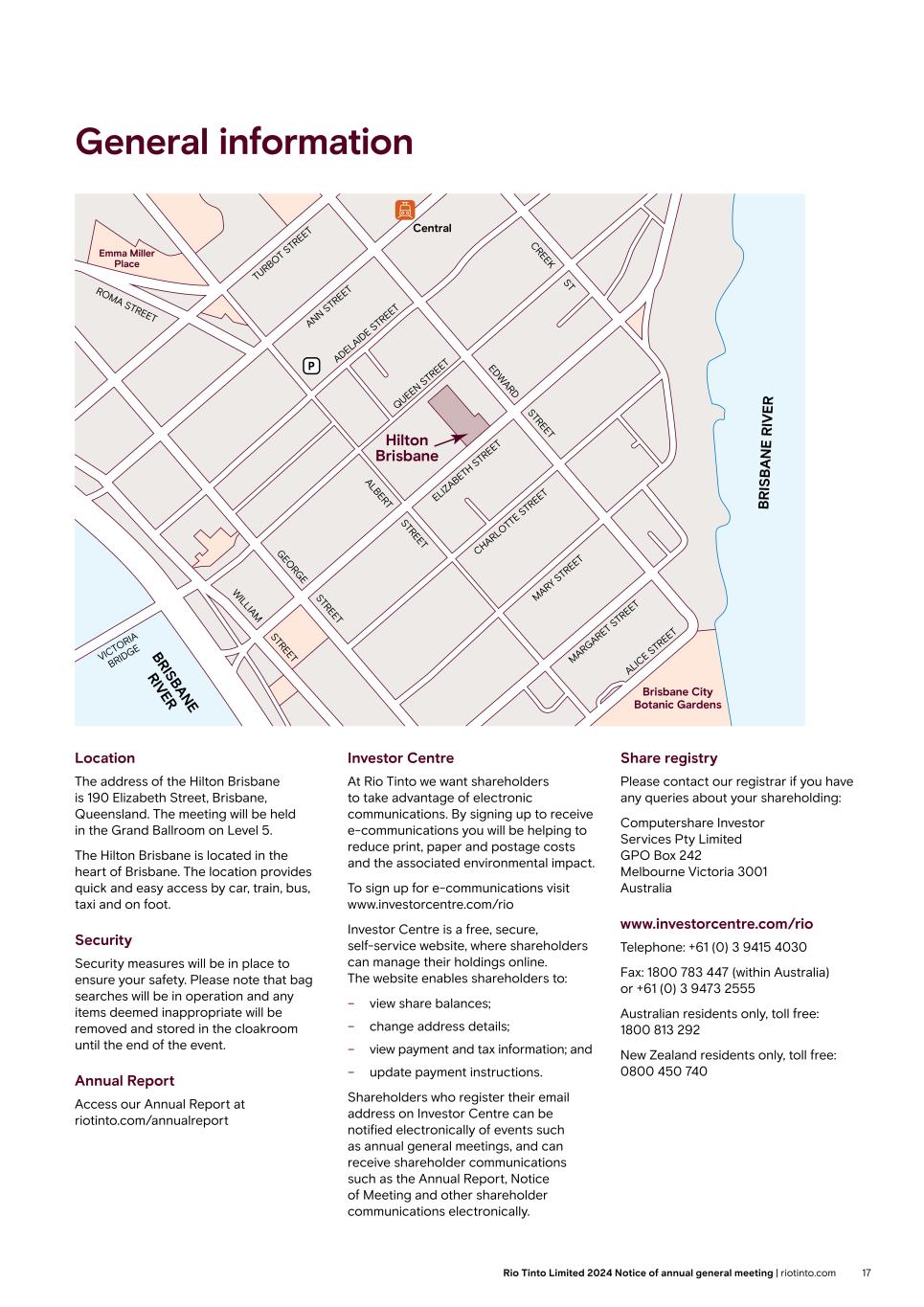 General information Location The address of the Hilton Brisbane is 190 Elizabeth Street, Brisbane, Queensland. The meeting will be held in the Grand Ballroom on Level 5. The Hilton Brisbane is located in the heart of Brisbane. The location provides quick and easy access by car, train, bus, taxi and on foot. Security Security measures will be in place to ensure your safety. Please note that bag searches will be in operation and any items deemed inappropriate will be removed and stored in the cloakroom until the end of the event. Annual Report Access our Annual Report at riotinto.com/annualreport Investor Centre At Rio Tinto we want shareholders to take advantage of electronic communications. By signing up to receive e-communications you will be helping to reduce print, paper and postage costs and the associated environmental impact. To sign up for e-communications visit www.investorcentre.com/rio Investor Centre is a free, secure, self-service website, where shareholders can manage their holdings online. The website enables shareholders to: – view share balances; – change address details; – view payment and tax information; and – update payment instructions. Shareholders who register their email address on Investor Centre can be notified electronically of events such as annual general meetings, and can receive shareholder communications such as the Annual Report, Notice of Meeting and other shareholder communications electronically. Share registry Please contact our registrar if you have any queries about your shareholding: Computershare Investor Services Pty Limited GPO Box 242 Melbourne Victoria 3001 Australia www.investorcentre.com/rio Telephone: +61 (0) 3 9415 4030 Fax: 1800 783 447 (within Australia) or +61 (0) 3 9473 2555 Australian residents only, toll free: 1800 813 292 New Zealand residents only, toll free: 0800 450 740 Hilton Brisbane Central ELIZABETH STR EET EDW ARD STREET CREEK ST ALBERT STREET ROMA STREET GEORGE STREET W ILLIAM STREET CHARLOTT E STR EET MARY S TR EET MARGARET S TR EET ALIC E STR EET QUEEN STR EETADELAIDE STR EET ANN STR EET TU RBOT S TR EET VICTORIA BRIDGE Brisbane City Botanic Gardens Emma Miller Place BRISBANE RIVER B R IS B A N E R IV ER 17Rio Tinto Limited 2024 Notice of annual general meeting | riotinto.com