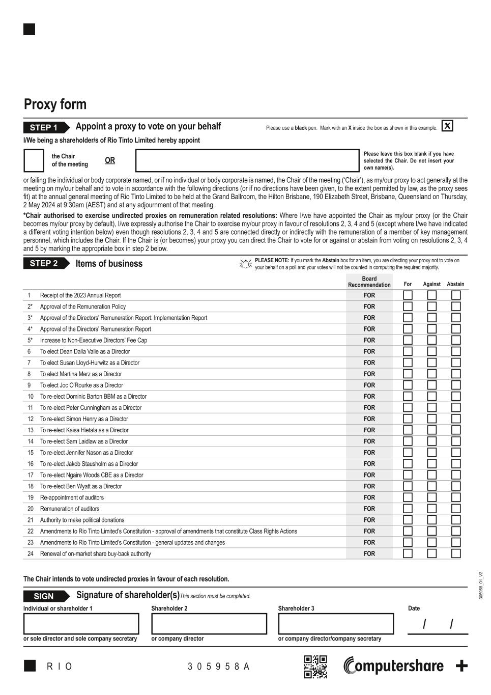 30 59 58 _0 1_ V2 Items of businessSTEP 2 Appoint a proxy to vote on your behalf Signature of shareholder(s)This section must be completed.SIGN STEP 1 PLEASE NOTE: If you mark the Abstain box for an item, you are directing your proxy not to vote on your behalf on a poll and your votes will not be counted in computing the required majority. Date / / Individual or shareholder 1 or sole director and sole company secretary Shareholder 2 or company director Shareholder 3 or company director/company secretary Please use a black pen. Mark with an X inside the box as shown in this example. X the Chair of the meeting Please leave this box blank if you have selected the Chair. Do not insert your own name(s). OR R I O 3 0 5 9 5 8 A Proxy form I/We being a shareholder/s of Rio Tinto Limited hereby appoint or failing the individual or body corporate named, or if no individual or body corporate is named, the Chair of the meeting (‘Chair’), as my/our proxy to act generally at the meeting on my/our behalf and to vote in accordance with the following directions (or if no directions have been given, to the extent permitted by law, as the proxy sees fit) at the annual general meeting of Rio Tinto Limited to be held at the Grand Ballroom, the Hilton Brisbane, 190 Elizabeth Street, Brisbane, Queensland on Thursday, 2 May 2024 at 9:30am (AEST) and at any adjournment of that meeting. *Chair authorised to exercise undirected proxies on remuneration related resolutions: Where I/we have appointed the Chair as my/our proxy (or the Chair becomes my/our proxy by default), I/we expressly authorise the Chair to exercise my/our proxy in favour of resolutions 2, 3, 4 and 5 (except where I/we have indicated a different voting intention below) even though resolutions 2, 3, 4 and 5 are connected directly or indirectly with the remuneration of a member of key management personnel, which includes the Chair. If the Chair is (or becomes) your proxy you can direct the Chair to vote for or against or abstain from voting on resolutions 2, 3, 4 and 5 by marking the appropriate box in step 2 below. Board Recommendation For Against Abstain 1 Receipt of the 2023 Annual Report FOR 2* Approval of the Remuneration Policy FOR 3* Approval of the Directors’ Remuneration Report: Implementation Report FOR 4* Approval of the Directors’ Remuneration Report FOR 5* Increase to Non-Executive Directors’ Fee Cap FOR 6 To elect Dean Dalla Valle as a Director FOR 7 To elect Susan Lloyd-Hurwitz as a Director FOR 8 To elect Martina Merz as a Director FOR 9 To elect Joc O’Rourke as a Director FOR 10 To re-elect Dominic Barton BBM as a Director FOR 11 To re-elect Peter Cunningham as a Director FOR 12 To re-elect Simon Henry as a Director FOR 13 To re-elect Kaisa Hietala as a Director FOR 14 To re-elect Sam Laidlaw as a Director FOR 15 To re-elect Jennifer Nason as a Director FOR 16 To re-elect Jakob Stausholm as a Director FOR 17 To re-elect Ngaire Woods CBE as a Director FOR 18 To re-elect Ben Wyatt as a Director FOR 19 Re-appointment of auditors FOR 20 Remuneration of auditors FOR 21 Authority to make political donations FOR 22 Amendments to Rio Tinto Limited’s Constitution - approval of amendments that constitute Class Rights Actions FOR 23 Amendments to Rio Tinto Limited’s Constitution - general updates and changes FOR 24 Renewal of on-market share buy-back authority FOR The Chair intends to vote undirected proxies in favour of each resolution.