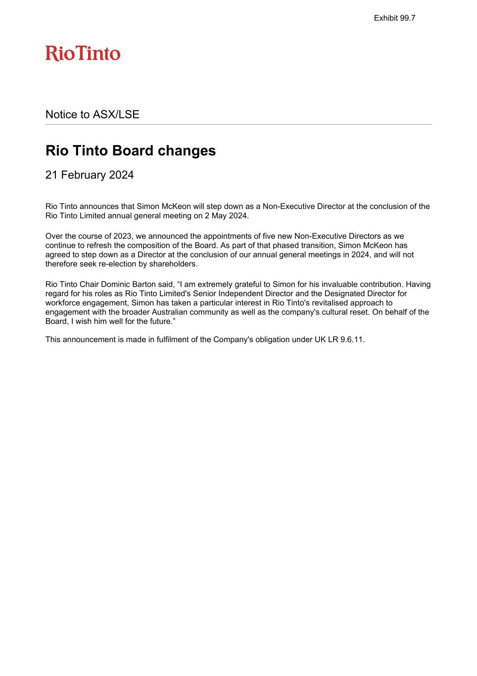 Notice to ASX/LSE Rio Tinto Board changes 21 February 2024 Rio Tinto announces that Simon McKeon will step down as a Non-Executive Director at the conclusion of the Rio Tinto Limited annual general meeting on 2 May 2024. Over the course of 2023, we announced the appointments of five new Non-Executive Directors as we continue to refresh the composition of the Board. As part of that phased transition, Simon McKeon has agreed to step down as a Director at the conclusion of our annual general meetings in 2024, and will not therefore seek re-election by shareholders. Rio Tinto Chair Dominic Barton said, “I am extremely grateful to Simon for his invaluable contribution. Having regard for his roles as Rio Tinto Limited's Senior Independent Director and the Designated Director for workforce engagement, Simon has taken a particular interest in Rio Tinto's revitalised approach to engagement with the broader Australian community as well as the company's cultural reset. On behalf of the Board, I wish him well for the future.” This announcement is made in fulfilment of the Company's obligation under UK LR 9.6.11. Exhibit 99.7