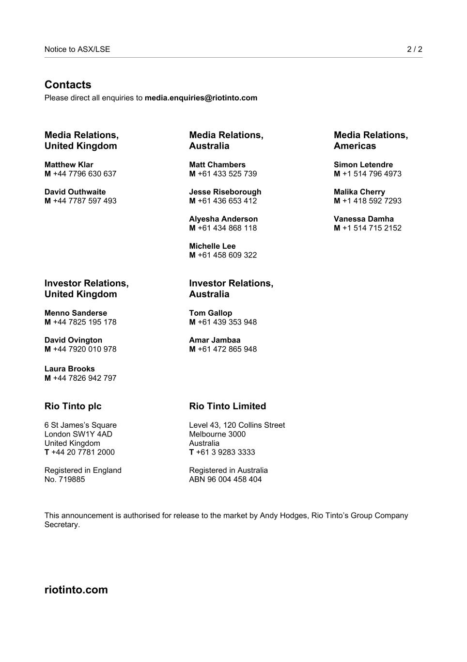 Notice to ASX/LSE 2 / 2 Contacts Please direct all enquiries to media.enquiries@riotinto.com Media Relations, United Kingdom Matthew Klar M +44 7796 630 637 David Outhwaite M +44 7787 597 493 Media Relations, Australia Matt Chambers M +61 433 525 739 Jesse Riseborough M +61 436 653 412 Alyesha Anderson M +61 434 868 118 Michelle Lee M +61 458 609 322 Media Relations, Americas Simon Letendre M +1 514 796 4973 Malika Cherry M +1 418 592 7293 Vanessa Damha M +1 514 715 2152 Investor Relations, United Kingdom Menno Sanderse M +44 7825 195 178 David Ovington M +44 7920 010 978 Laura Brooks M +44 7826 942 797 Investor Relations, Australia Tom Gallop M +61 439 353 948 Amar Jambaa M +61 472 865 948 Rio Tinto plc 6 St James’s Square London SW1Y 4AD United Kingdom T +44 20 7781 2000 Registered in England No. 719885 Rio Tinto Limited Level 43, 120 Collins Street Melbourne 3000 Australia T +61 3 9283 3333 Registered in Australia ABN 96 004 458 404 This announcement is authorised for release to the market by Andy Hodges, Rio Tinto’s Group Company Secretary. riotinto.com