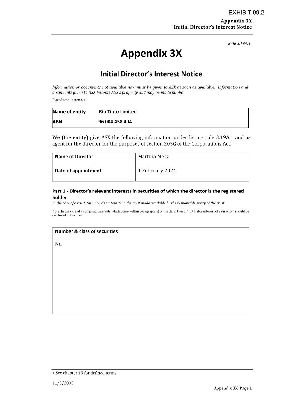 Appendix 3X Initial Director’s Interest Notice + See chapter 19 for defined terms. 11/3/2002 Appendix 3X Page 1 Rule 3.19A.1 Appendix 3X Initial Director’s Interest Notice Information or documents not available now must be given to ASX as soon as available. Information and documents given to ASX become ASX’s property and may be made public. Introduced 30/9/2001. Name of entity Rio Tinto Limited ABN 96 004 458 404 We (the entity) give ASX the following information under listing rule 3.19A.1 and as agent for the director for the purposes of section 205G of the Corporations Act. Name of Director Martina Merz Date of appointment 1 February 2024 Part 1 - Director’s relevant interests in securities of which the director is the registered holder In the case of a trust, this includes interests in the trust made available by the responsible entity of the trust Note: In the case of a company, interests which come within paragraph (i) of the definition of “notifiable interest of a director” should be disclosed in this part. Number & class of securities Nil EXHIBIT 99.2