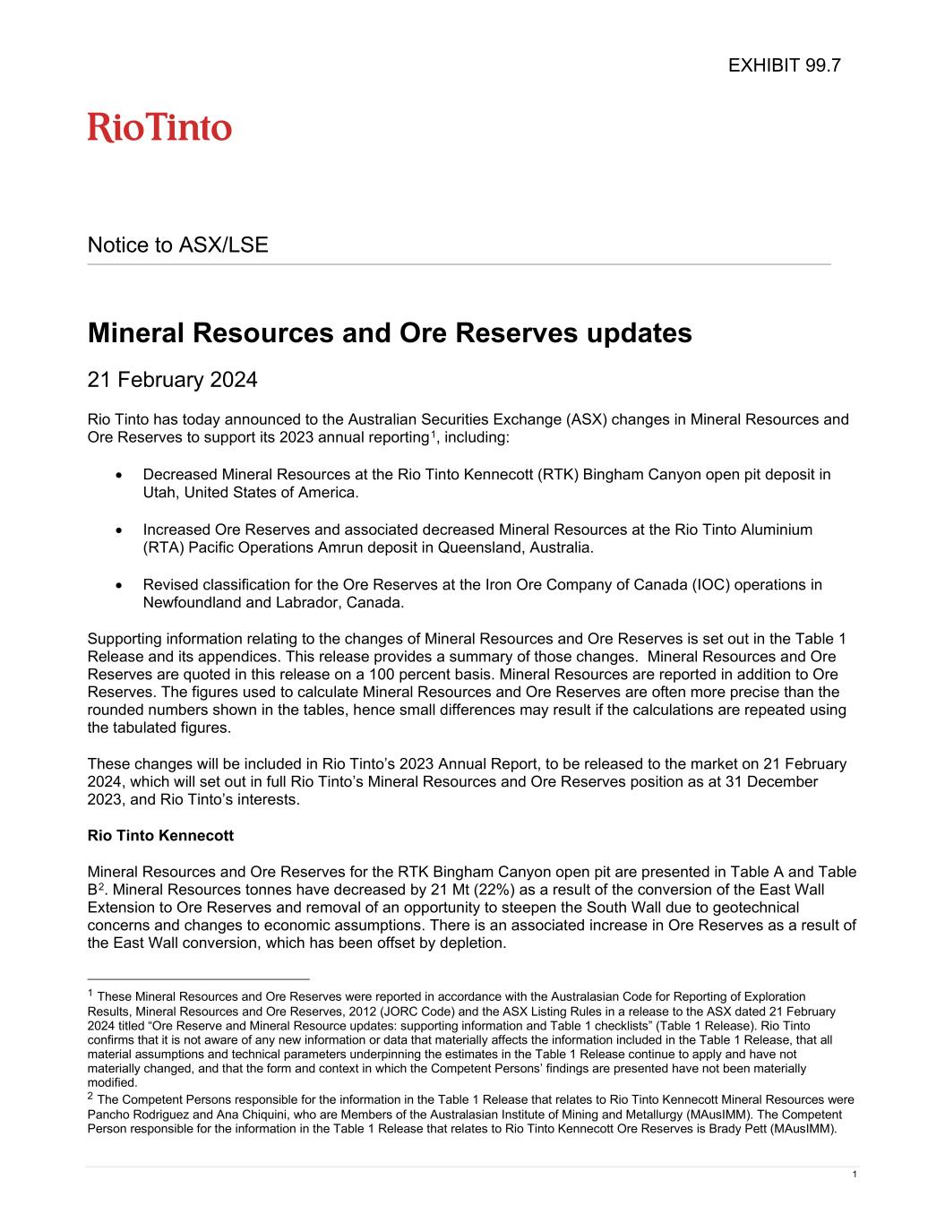 1 Notice to ASX/LSE Mineral Resources and Ore Reserves updates 21 February 2024 Rio Tinto has today announced to the Australian Securities Exchange (ASX) changes in Mineral Resources and Ore Reserves to support its 2023 annual reporting1, including: • Decreased Mineral Resources at the Rio Tinto Kennecott (RTK) Bingham Canyon open pit deposit in Utah, United States of America. • Increased Ore Reserves and associated decreased Mineral Resources at the Rio Tinto Aluminium (RTA) Pacific Operations Amrun deposit in Queensland, Australia. • Revised classification for the Ore Reserves at the Iron Ore Company of Canada (IOC) operations in Newfoundland and Labrador, Canada. Supporting information relating to the changes of Mineral Resources and Ore Reserves is set out in the Table 1 Release and its appendices. This release provides a summary of those changes. Mineral Resources and Ore Reserves are quoted in this release on a 100 percent basis. Mineral Resources are reported in addition to Ore Reserves. The figures used to calculate Mineral Resources and Ore Reserves are often more precise than the rounded numbers shown in the tables, hence small differences may result if the calculations are repeated using the tabulated figures. These changes will be included in Rio Tinto’s 2023 Annual Report, to be released to the market on 21 February 2024, which will set out in full Rio Tinto’s Mineral Resources and Ore Reserves position as at 31 December 2023, and Rio Tinto’s interests. Rio Tinto Kennecott Mineral Resources and Ore Reserves for the RTK Bingham Canyon open pit are presented in Table A and Table B2. Mineral Resources tonnes have decreased by 21 Mt (22%) as a result of the conversion of the East Wall Extension to Ore Reserves and removal of an opportunity to steepen the South Wall due to geotechnical concerns and changes to economic assumptions. There is an associated increase in Ore Reserves as a result of the East Wall conversion, which has been offset by depletion. 1 These Mineral Resources and Ore Reserves were reported in accordance with the Australasian Code for Reporting of Exploration Results, Mineral Resources and Ore Reserves, 2012 (JORC Code) and the ASX Listing Rules in a release to the ASX dated 21 February 2024 titled “Ore Reserve and Mineral Resource updates: supporting information and Table 1 checklists” (Table 1 Release). Rio Tinto confirms that it is not aware of any new information or data that materially affects the information included in the Table 1 Release, that all material assumptions and technical parameters underpinning the estimates in the Table 1 Release continue to apply and have not materially changed, and that the form and context in which the Competent Persons’ findings are presented have not been materially modified. 2 The Competent Persons responsible for the information in the Table 1 Release that relates to Rio Tinto Kennecott Mineral Resources were Pancho Rodriguez and Ana Chiquini, who are Members of the Australasian Institute of Mining and Metallurgy (MAusIMM). The Competent Person responsible for the information in the Table 1 Release that relates to Rio Tinto Kennecott Ore Reserves is Brady Pett (MAusIMM). EXHIBIT 99.7