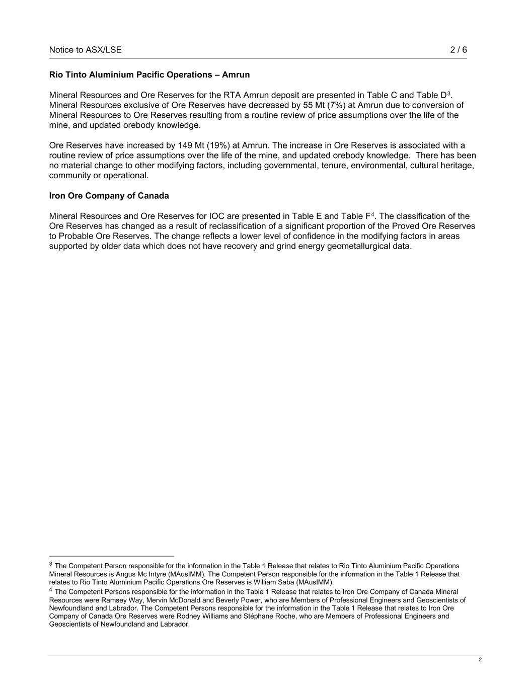 Notice to ASX/LSE 2 / 6 2 Rio Tinto Aluminium Pacific Operations – Amrun Mineral Resources and Ore Reserves for the RTA Amrun deposit are presented in Table C and Table D3. Mineral Resources exclusive of Ore Reserves have decreased by 55 Mt (7%) at Amrun due to conversion of Mineral Resources to Ore Reserves resulting from a routine review of price assumptions over the life of the mine, and updated orebody knowledge. Ore Reserves have increased by 149 Mt (19%) at Amrun. The increase in Ore Reserves is associated with a routine review of price assumptions over the life of the mine, and updated orebody knowledge. There has been no material change to other modifying factors, including governmental, tenure, environmental, cultural heritage, community or operational. Iron Ore Company of Canada Mineral Resources and Ore Reserves for IOC are presented in Table E and Table F4. The classification of the Ore Reserves has changed as a result of reclassification of a significant proportion of the Proved Ore Reserves to Probable Ore Reserves. The change reflects a lower level of confidence in the modifying factors in areas supported by older data which does not have recovery and grind energy geometallurgical data. 3 The Competent Person responsible for the information in the Table 1 Release that relates to Rio Tinto Aluminium Pacific Operations Mineral Resources is Angus Mc Intyre (MAusIMM). The Competent Person responsible for the information in the Table 1 Release that relates to Rio Tinto Aluminium Pacific Operations Ore Reserves is William Saba (MAusIMM). 4 The Competent Persons responsible for the information in the Table 1 Release that relates to Iron Ore Company of Canada Mineral Resources were Ramsey Way, Mervin McDonald and Beverly Power, who are Members of Professional Engineers and Geoscientists of Newfoundland and Labrador. The Competent Persons responsible for the information in the Table 1 Release that relates to Iron Ore Company of Canada Ore Reserves were Rodney Williams and Stéphane Roche, who are Members of Professional Engineers and Geoscientists of Newfoundland and Labrador.