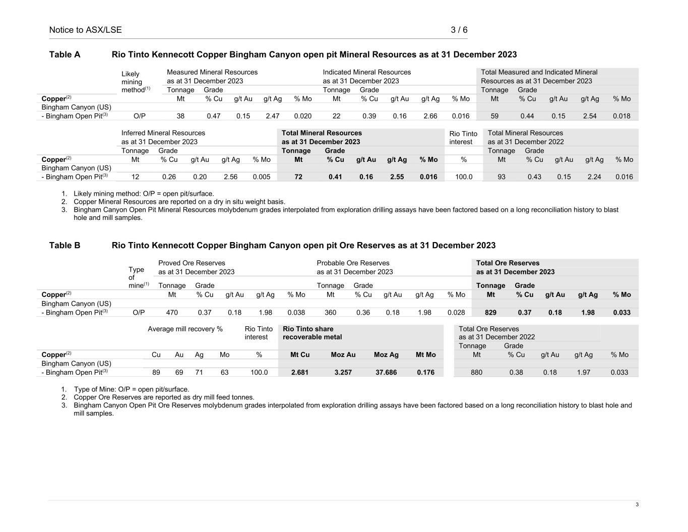Notice to ASX/LSE 3 / 6 3 Table A Rio Tinto Kennecott Copper Bingham Canyon open pit Mineral Resources as at 31 December 2023 Likely mining method(1) Measured Mineral Resources Indicated Mineral Resources Total Measured and Indicated Mineral as at 31 December 2023 as at 31 December 2023 Resources as at 31 December 2023 Tonnage Grade Tonnage Grade Tonnage Grade Copper(2) Mt % Cu g/t Au g/t Ag % Mo Mt % Cu g/t Au g/t Ag % Mo Mt % Cu g/t Au g/t Ag % Mo Bingham Canyon (US) - Bingham Open Pit(3) O/P 38 0.47 0.15 2.47 0.020 22 0.39 0.16 2.66 0.016 59 0.44 0.15 2.54 0.018 Inferred Mineral Resources Total Mineral Resources Rio Tinto interest Total Mineral Resources as at 31 December 2023 as at 31 December 2023 as at 31 December 2022 Tonnage Grade Tonnage Grade Tonnage Grade Copper(2) Mt % Cu g/t Au g/t Ag % Mo Mt % Cu g/t Au g/t Ag % Mo % Mt % Cu g/t Au g/t Ag % Mo Bingham Canyon (US) - Bingham Open Pit(3) 12 0.26 0.20 2.56 0.005 72 0.41 0.16 2.55 0.016 100.0 93 0.43 0.15 2.24 0.016 1. Likely mining method: O/P = open pit/surface. 2. Copper Mineral Resources are reported on a dry in situ weight basis. 3. Bingham Canyon Open Pit Mineral Resources molybdenum grades interpolated from exploration drilling assays have been factored based on a long reconciliation history to blast hole and mill samples. Table B Rio Tinto Kennecott Copper Bingham Canyon open pit Ore Reserves as at 31 December 2023 Type of mine(1) Proved Ore Reserves Probable Ore Reserves Total Ore Reserves as at 31 December 2023 as at 31 December 2023 as at 31 December 2023 Tonnage Grade Tonnage Grade Tonnage Grade Copper(2) Mt % Cu g/t Au g/t Ag % Mo Mt % Cu g/t Au g/t Ag % Mo Mt % Cu g/t Au g/t Ag % Mo Bingham Canyon (US) - Bingham Open Pit(3) O/P 470 0.37 0.18 1.98 0.038 360 0.36 0.18 1.98 0.028 829 0.37 0.18 1.98 0.033 Average mill recovery % Rio Tinto interest Rio Tinto share Total Ore Reserves recoverable metal as at 31 December 2022 Tonnage Grade Copper(2) Cu Au Ag Mo % Mt Cu Moz Au Moz Ag Mt Mo Mt % Cu g/t Au g/t Ag % Mo Bingham Canyon (US) - Bingham Open Pit(3) 89 69 71 63 100.0 2.681 3.257 37.686 0.176 880 0.38 0.18 1.97 0.033 1. Type of Mine: O/P = open pit/surface. 2. Copper Ore Reserves are reported as dry mill feed tonnes. 3. Bingham Canyon Open Pit Ore Reserves molybdenum grades interpolated from exploration drilling assays have been factored based on a long reconciliation history to blast hole and mill samples.