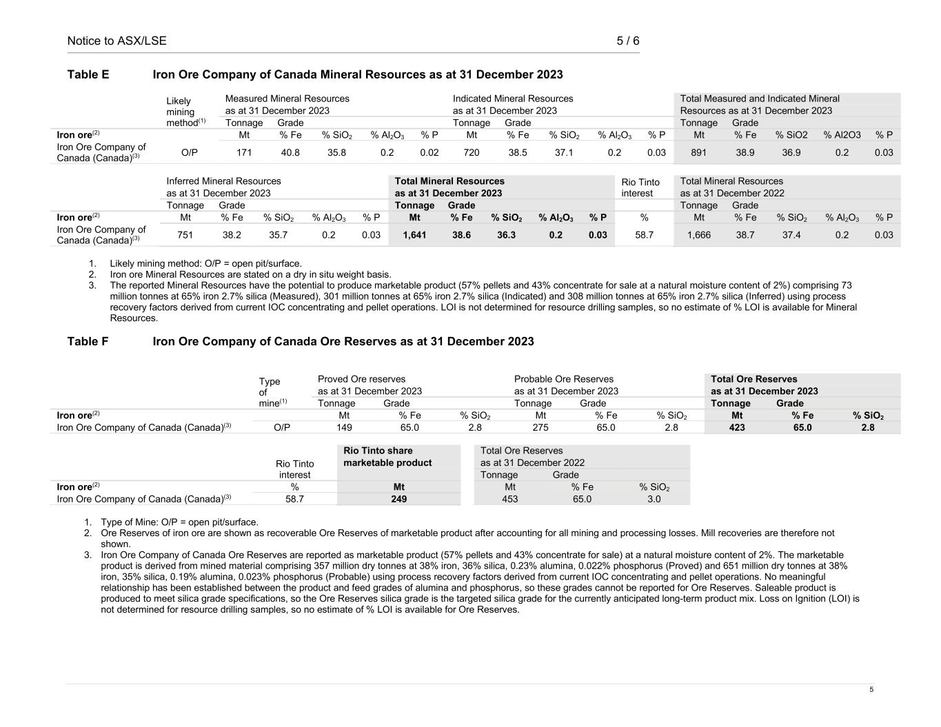 Notice to ASX/LSE 5 / 6 5 Table E Iron Ore Company of Canada Mineral Resources as at 31 December 2023 Likely mining method(1) Measured Mineral Resources Indicated Mineral Resources Total Measured and Indicated Mineral as at 31 December 2023 as at 31 December 2023 Resources as at 31 December 2023 Tonnage Grade Tonnage Grade Tonnage Grade Iron ore(2) Mt % Fe % SiO2 % Al2O3 % P Mt % Fe % SiO2 % Al2O3 % P Mt % Fe % SiO2 % Al2O3 % P Iron Ore Company of Canada (Canada)(3) O/P 171 40.8 35.8 0.2 0.02 720 38.5 37.1 0.2 0.03 891 38.9 36.9 0.2 0.03 Inferred Mineral Resources Total Mineral Resources Rio Tinto interest Total Mineral Resources as at 31 December 2023 as at 31 December 2023 as at 31 December 2022 Tonnage Grade Tonnage Grade Tonnage Grade Iron ore(2) Mt % Fe % SiO2 % Al2O3 % P Mt % Fe % SiO2 % Al2O3 % P % Mt % Fe % SiO2 % Al2O3 % P Iron Ore Company of Canada (Canada)(3) 751 38.2 35.7 0.2 0.03 1,641 38.6 36.3 0.2 0.03 58.7 1,666 38.7 37.4 0.2 0.03 1. Likely mining method: O/P = open pit/surface. 2. Iron ore Mineral Resources are stated on a dry in situ weight basis. 3. The reported Mineral Resources have the potential to produce marketable product (57% pellets and 43% concentrate for sale at a natural moisture content of 2%) comprising 73 million tonnes at 65% iron 2.7% silica (Measured), 301 million tonnes at 65% iron 2.7% silica (Indicated) and 308 million tonnes at 65% iron 2.7% silica (Inferred) using process recovery factors derived from current IOC concentrating and pellet operations. LOI is not determined for resource drilling samples, so no estimate of % LOI is available for Mineral Resources. Table F Iron Ore Company of Canada Ore Reserves as at 31 December 2023 Type of mine(1) Proved Ore reserves Probable Ore Reserves Total Ore Reserves as at 31 December 2023 as at 31 December 2023 as at 31 December 2023 Tonnage Grade Tonnage Grade Tonnage Grade Iron ore(2) Mt % Fe % SiO2 Mt % Fe % SiO2 Mt % Fe % SiO2 Iron Ore Company of Canada (Canada)(3) O/P 149 65.0 2.8 275 65.0 2.8 423 65.0 2.8 Rio Tinto interest Rio Tinto share Total Ore Reserves marketable product as at 31 December 2022 Tonnage Grade Iron ore(2) % Mt Mt % Fe % SiO2 Iron Ore Company of Canada (Canada)(3) 58.7 249 453 65.0 3.0 1. Type of Mine: O/P = open pit/surface. 2. Ore Reserves of iron ore are shown as recoverable Ore Reserves of marketable product after accounting for all mining and processing losses. Mill recoveries are therefore not shown. 3. Iron Ore Company of Canada Ore Reserves are reported as marketable product (57% pellets and 43% concentrate for sale) at a natural moisture content of 2%. The marketable product is derived from mined material comprising 357 million dry tonnes at 38% iron, 36% silica, 0.23% alumina, 0.022% phosphorus (Proved) and 651 million dry tonnes at 38% iron, 35% silica, 0.19% alumina, 0.023% phosphorus (Probable) using process recovery factors derived from current IOC concentrating and pellet operations. No meaningful relationship has been established between the product and feed grades of alumina and phosphorus, so these grades cannot be reported for Ore Reserves. Saleable product is produced to meet silica grade specifications, so the Ore Reserves silica grade is the targeted silica grade for the currently anticipated long-term product mix. Loss on Ignition (LOI) is not determined for resource drilling samples, so no estimate of % LOI is available for Ore Reserves.