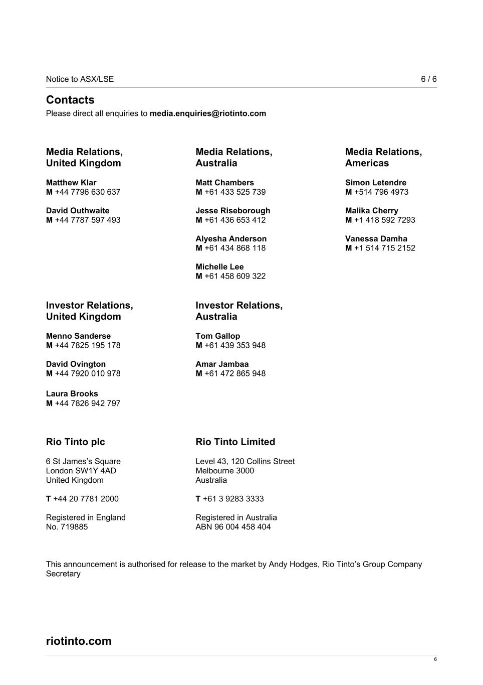 Notice to ASX/LSE 6 / 6 6 Contacts Please direct all enquiries to media.enquiries@riotinto.com Media Relations, United Kingdom Matthew Klar M +44 7796 630 637 David Outhwaite M +44 7787 597 493 Media Relations, Australia Matt Chambers M +61 433 525 739 Jesse Riseborough M +61 436 653 412 Alyesha Anderson M +61 434 868 118 Michelle Lee M +61 458 609 322 Media Relations, Americas Simon Letendre M +514 796 4973 Malika Cherry M +1 418 592 7293 Vanessa Damha M +1 514 715 2152 Investor Relations, United Kingdom Menno Sanderse M +44 7825 195 178 David Ovington M +44 7920 010 978 Laura Brooks   M +44 7826 942 797  Investor Relations, Australia Tom Gallop M +61 439 353 948 Amar Jambaa M +61 472 865 948 Rio Tinto plc 6 St James’s Square London SW1Y 4AD United Kingdom T +44 20 7781 2000 Registered in England No. 719885 Rio Tinto Limited Level 43, 120 Collins Street Melbourne 3000 Australia T +61 3 9283 3333 Registered in Australia ABN 96 004 458 404 This announcement is authorised for release to the market by Andy Hodges, Rio Tinto’s Group Company Secretary riotinto.com