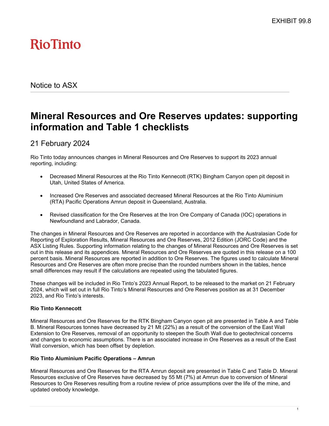 1 Notice to ASX Mineral Resources and Ore Reserves updates: supporting information and Table 1 checklists 21 February 2024 Rio Tinto today announces changes in Mineral Resources and Ore Reserves to support its 2023 annual reporting, including: • Decreased Mineral Resources at the Rio Tinto Kennecott (RTK) Bingham Canyon open pit deposit in Utah, United States of America. • Increased Ore Reserves and associated decreased Mineral Resources at the Rio Tinto Aluminium (RTA) Pacific Operations Amrun deposit in Queensland, Australia. • Revised classification for the Ore Reserves at the Iron Ore Company of Canada (IOC) operations in Newfoundland and Labrador, Canada. The changes in Mineral Resources and Ore Reserves are reported in accordance with the Australasian Code for Reporting of Exploration Results, Mineral Resources and Ore Reserves, 2012 Edition (JORC Code) and the ASX Listing Rules. Supporting information relating to the changes of Mineral Resources and Ore Reserves is set out in this release and its appendices. Mineral Resources and Ore Reserves are quoted in this release on a 100 percent basis. Mineral Resources are reported in addition to Ore Reserves. The figures used to calculate Mineral Resources and Ore Reserves are often more precise than the rounded numbers shown in the tables, hence small differences may result if the calculations are repeated using the tabulated figures. These changes will be included in Rio Tinto’s 2023 Annual Report, to be released to the market on 21 February 2024, which will set out in full Rio Tinto’s Mineral Resources and Ore Reserves position as at 31 December 2023, and Rio Tinto’s interests. Rio Tinto Kennecott Mineral Resources and Ore Reserves for the RTK Bingham Canyon open pit are presented in Table A and Table B. Mineral Resources tonnes have decreased by 21 Mt (22%) as a result of the conversion of the East Wall Extension to Ore Reserves, removal of an opportunity to steepen the South Wall due to geotechnical concerns and changes to economic assumptions. There is an associated increase in Ore Reserves as a result of the East Wall conversion, which has been offset by depletion. Rio Tinto Aluminium Pacific Operations – Amrun Mineral Resources and Ore Reserves for the RTA Amrun deposit are presented in Table C and Table D. Mineral Resources exclusive of Ore Reserves have decreased by 55 Mt (7%) at Amrun due to conversion of Mineral Resources to Ore Reserves resulting from a routine review of price assumptions over the life of the mine, and updated orebody knowledge. EXHIBIT 99.8