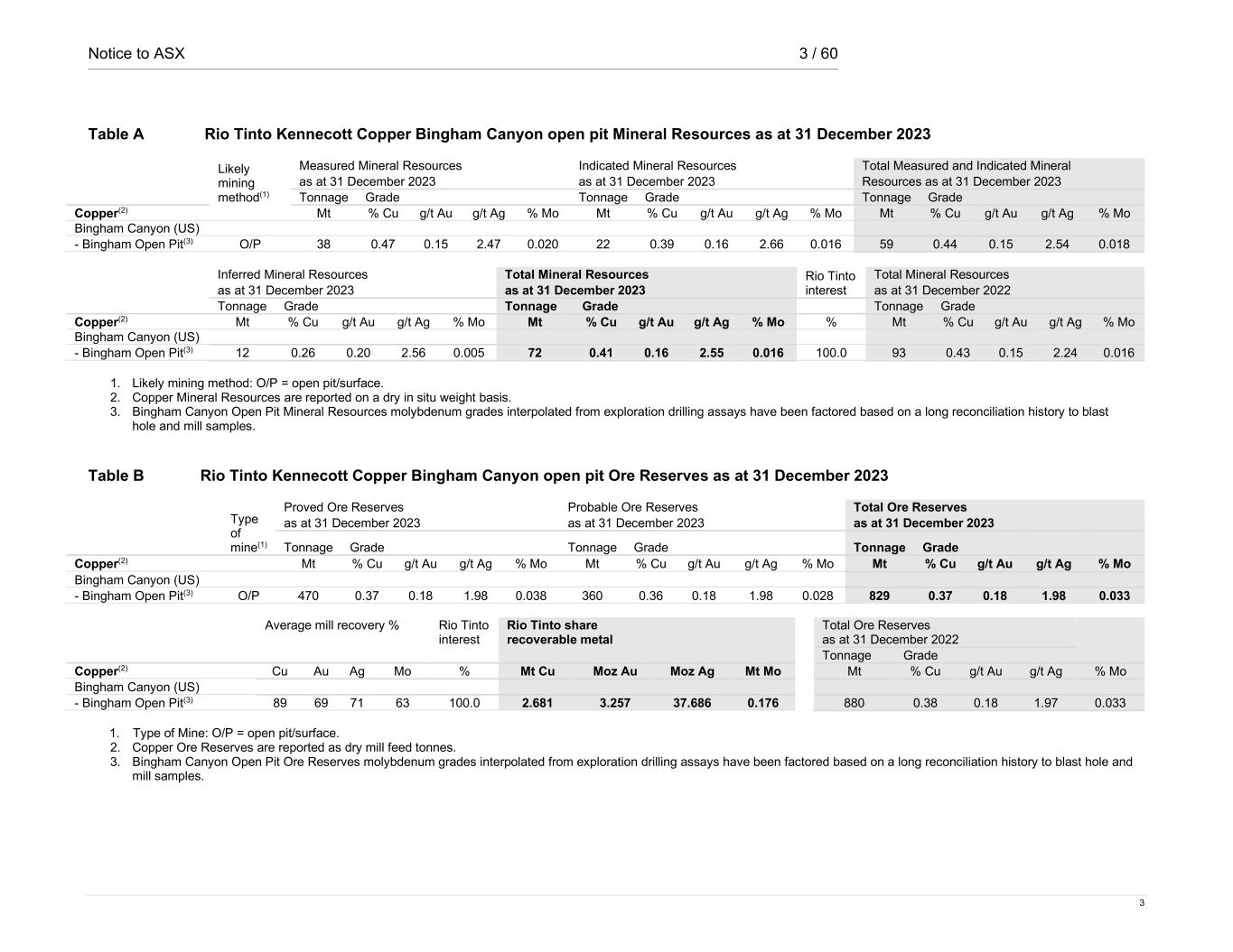 Notice to ASX 3 / 60 3 Table A Rio Tinto Kennecott Copper Bingham Canyon open pit Mineral Resources as at 31 December 2023 Likely mining method(1) Measured Mineral Resources Indicated Mineral Resources Total Measured and Indicated Mineral as at 31 December 2023 as at 31 December 2023 Resources as at 31 December 2023 Tonnage Grade Tonnage Grade Tonnage Grade Copper(2) Mt % Cu g/t Au g/t Ag % Mo Mt % Cu g/t Au g/t Ag % Mo Mt % Cu g/t Au g/t Ag % Mo Bingham Canyon (US) - Bingham Open Pit(3) O/P 38 0.47 0.15 2.47 0.020 22 0.39 0.16 2.66 0.016 59 0.44 0.15 2.54 0.018 Inferred Mineral Resources Total Mineral Resources Rio Tinto interest Total Mineral Resources as at 31 December 2023 as at 31 December 2023 as at 31 December 2022 Tonnage Grade Tonnage Grade Tonnage Grade Copper(2) Mt % Cu g/t Au g/t Ag % Mo Mt % Cu g/t Au g/t Ag % Mo % Mt % Cu g/t Au g/t Ag % Mo Bingham Canyon (US) - Bingham Open Pit(3) 12 0.26 0.20 2.56 0.005 72 0.41 0.16 2.55 0.016 100.0 93 0.43 0.15 2.24 0.016 1. Likely mining method: O/P = open pit/surface. 2. Copper Mineral Resources are reported on a dry in situ weight basis. 3. Bingham Canyon Open Pit Mineral Resources molybdenum grades interpolated from exploration drilling assays have been factored based on a long reconciliation history to blast hole and mill samples. Table B Rio Tinto Kennecott Copper Bingham Canyon open pit Ore Reserves as at 31 December 2023 Type of mine(1) Proved Ore Reserves Probable Ore Reserves Total Ore Reserves as at 31 December 2023 as at 31 December 2023 as at 31 December 2023 Tonnage Grade Tonnage Grade Tonnage Grade Copper(2) Mt % Cu g/t Au g/t Ag % Mo Mt % Cu g/t Au g/t Ag % Mo Mt % Cu g/t Au g/t Ag % Mo Bingham Canyon (US) - Bingham Open Pit(3) O/P 470 0.37 0.18 1.98 0.038 360 0.36 0.18 1.98 0.028 829 0.37 0.18 1.98 0.033 Average mill recovery % Rio Tinto interest Rio Tinto share Total Ore Reserves recoverable metal as at 31 December 2022 Tonnage Grade Copper(2) Cu Au Ag Mo % Mt Cu Moz Au Moz Ag Mt Mo Mt % Cu g/t Au g/t Ag % Mo Bingham Canyon (US) - Bingham Open Pit(3) 89 69 71 63 100.0 2.681 3.257 37.686 0.176 880 0.38 0.18 1.97 0.033 1. Type of Mine: O/P = open pit/surface. 2. Copper Ore Reserves are reported as dry mill feed tonnes. 3. Bingham Canyon Open Pit Ore Reserves molybdenum grades interpolated from exploration drilling assays have been factored based on a long reconciliation history to blast hole and mill samples.