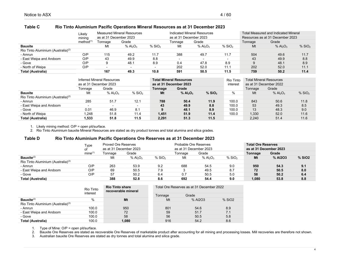 Notice to ASX 4 / 60 4 Table C Rio Tinto Aluminium Pacific Operations Mineral Resources as at 31 December 2023 Likely mining method(1) Measured Mineral Resources Indicated Mineral Resources Total Measured and Indicated Mineral as at 31 December 2023 as at 31 December 2023 Resources as at 31 December 2023 Tonnage Grade Tonnage Grade Tonnage Grade Bauxite Mt % Al2O3 % SiO2 Mt % Al2O3 % SiO2 Mt % Al2O3 % SiO2 Rio Tinto Aluminium (Australia)(2) - Amrun O/P 115 49.2 11.7 388 49.7 11.7 504 49.6 11.7 - East Weipa and Andoom O/P 43 49.9 8.8 - - - 43 49.9 8.8 - Gove O/P 9 48.1 8.9 0.4 47.8 8.9 9 48.1 8.9 - North of Weipa O/P - - - 202 52.0 11.1 202 52.0 11.1 Total (Australia) 167 49.3 10.8 591 50.5 11.5 759 50.2 11.4 Inferred Mineral Resources Total Mineral Resources Rio Tinto interest Total Mineral Resources as at 31 December 2023 as at 31 December 2023 as at 31 December 2022 Tonnage Grade Tonnage Grade Tonnage Grade Bauxite Mt % Al2O3 % SiO2 Mt % Al2O3 % SiO2 % Mt % Al2O3 % SiO2 Rio Tinto Aluminium (Australia)(2) - Amrun 285 51.7 12.1 788 50.4 11.9 100.0 843 50.6 11.8 - East Weipa and Andoom - - - 43 49.9 8.8 100.0 53 49.3 8.5 - Gove 0.01 46.9 8.1 9 48.1 8.9 100.0 13 48.3 9.0 - North of Weipa 1,248 51.8 11.4 1,451 51.9 11.4 100.0 1,330 52.0 11.6 Total (Australia) 1,533 51.8 11.5 2,291 51.3 11.5 2,240 51.4 11.6 1. Likely mining method: O/P = open pit/surface. 2. Rio Tinto Aluminium bauxite Mineral Resources are stated as dry product tonnes and total alumina and silica grades. Table D Rio Tinto Aluminium Pacific Operations Ore Reserves as at 31 December 2023 Type of mine(1) Proved Ore Reserves Probable Ore Reserves Total Ore Reserves as at 31 December 2023 as at 31 December 2023 as at 31 December 2023 Tonnage Grade Tonnage Grade Tonnage Grade Bauxite(2) Mt % Al2O3 % SiO2 Mt % Al2O3 % SiO2 Mt % Al2O3 % SiO2 Rio Tinto Aluminium (Australia)(3) - Amrun O/P 263 53.9 9.2 688 54.5 9.0 950 54.3 9.1 - East Weipa and Andoom O/P 69 50.5 7.9 3 49.5 8.7 72 50.5 8.0 - Gove O/P 57 50.2 6.4 0.7 50.5 5.0 58 50.2 6.4 Total (Australia) 388 52.8 8.6 692 54.4 9.0 1,080 53.8 8.8 Rio Tinto interest Rio Tinto share recoverable mineral Total Ore Reserves as at 31 December 2022 Tonnage Grade Bauxite(2) % Mt Mt % Al2O3 % SiO2 Rio Tinto Aluminium (Australia)(3) - Amrun 100.0 950 801 54.6 8.9 - East Weipa and Andoom 100.0 72 59 51.7 7.1 - Gove 100.0 58 56 50.5 5.8 Total (Australia) 100.0 1,080 916 54.2 8.6 1. Type of Mine: O/P = open pit/surface. 2. Bauxite Ore Reserves are stated as recoverable Ore Reserves of marketable product after accounting for all mining and processing losses. Mill recoveries are therefore not shown. 3. Australian bauxite Ore Reserves are stated as dry tonnes and total alumina and silica grade.