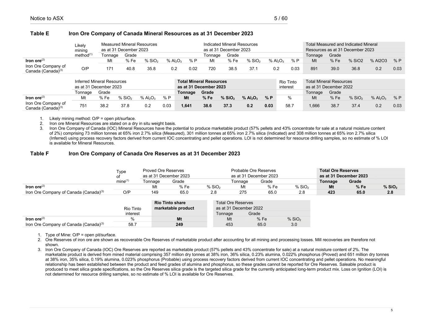 Notice to ASX 5 / 60 5 Table E Iron Ore Company of Canada Mineral Resources as at 31 December 2023 Likely mining method(1) Measured Mineral Resources Indicated Mineral Resources Total Measured and Indicated Mineral as at 31 December 2023 as at 31 December 2023 Resources as at 31 December 2023 Tonnage Grade Tonnage Grade Tonnage Grade Iron ore(2) Mt % Fe % SiO2 % Al2O3 % P Mt % Fe % SiO2 % Al2O3 % P Mt % Fe % SiO2 % Al2O3 % P Iron Ore Company of Canada (Canada)(3) O/P 171 40.8 35.8 0.2 0.02 720 38.5 37.1 0.2 0.03 891 39.0 36.8 0.2 0.03 Inferred Mineral Resources Total Mineral Resources Rio Tinto interest Total Mineral Resources as at 31 December 2023 as at 31 December 2023 as at 31 December 2022 Tonnage Grade Tonnage Grade Tonnage Grade Iron ore(2) Mt % Fe % SiO2 % Al2O3 % P Mt % Fe % SiO2 % Al2O3 % P % Mt % Fe % SiO2 % Al2O3 % P Iron Ore Company of Canada (Canada)(3) 751 38.2 37.8 0.2 0.03 1,641 38.6 37.3 0.2 0.03 58.7 1,666 38.7 37.4 0.2 0.03 1. Likely mining method: O/P = open pit/surface. 2. Iron ore Mineral Resources are stated on a dry in situ weight basis. 3. Iron Ore Company of Canada (IOC) Mineral Resources have the potential to produce marketable product (57% pellets and 43% concentrate for sale at a natural moisture content of 2%) comprising 73 million tonnes at 65% iron 2.7% silica (Measured), 301 million tonnes at 65% iron 2.7% silica (Indicated) and 308 million tonnes at 65% iron 2.7% silica (Inferred) using process recovery factors derived from current IOC concentrating and pellet operations. LOI is not determined for resource drilling samples, so no estimate of % LOI is available for Mineral Resources. Table F Iron Ore Company of Canada Ore Reserves as at 31 December 2023 Type of mine(1) Proved Ore Reserves Probable Ore Reserves Total Ore Reserves as at 31 December 2023 as at 31 December 2023 as at 31 December 2023 Tonnage Grade Tonnage Grade Tonnage Grade Iron ore(2) Mt % Fe % SiO2 Mt % Fe % SiO2 Mt % Fe % SiO2 Iron Ore Company of Canada (Canada)(3) O/P 149 65.0 2.8 275 65.0 2.8 423 65.0 2.8 Rio Tinto interest Rio Tinto share Total Ore Reserves marketable product as at 31 December 2022 Tonnage Grade Iron ore(2) % Mt Mt % Fe % SiO2 Iron Ore Company of Canada (Canada)(3) 58.7 249 453 65.0 3.0 1. Type of Mine: O/P = open pit/surface. 2. Ore Reserves of iron ore are shown as recoverable Ore Reserves of marketable product after accounting for all mining and processing losses. Mill recoveries are therefore not shown. 3. Iron Ore Company of Canada (IOC) Ore Reserves are reported as marketable product (57% pellets and 43% concentrate for sale) at a natural moisture content of 2%. The marketable product is derived from mined material comprising 357 million dry tonnes at 38% iron, 36% silica, 0.23% alumina, 0.022% phosphorus (Proved) and 651 million dry tonnes at 38% iron, 35% silica, 0.19% alumina, 0.023% phosphorus (Probable) using process recovery factors derived from current IOC concentrating and pellet operations. No meaningful relationship has been established between the product and feed grades of alumina and phosphorus, so these grades cannot be reported for Ore Reserves. Saleable product is produced to meet silica grade specifications, so the Ore Reserves silica grade is the targeted silica grade for the currently anticipated long-term product mix. Loss on Ignition (LOI) is not determined for resource drilling samples, so no estimate of % LOI is available for Ore Reserves.
