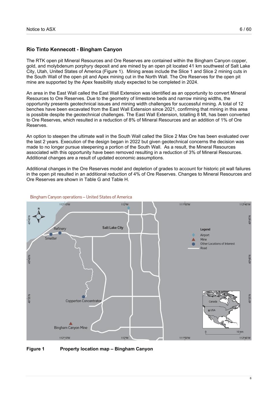 Notice to ASX 6 / 60 6 Rio Tinto Kennecott - Bingham Canyon The RTK open pit Mineral Resources and Ore Reserves are contained within the Bingham Canyon copper, gold, and molybdenum porphyry deposit and are mined by an open pit located 41 km southwest of Salt Lake City, Utah, United States of America (Figure 1). Mining areas include the Slice 1 and Slice 2 mining cuts in the South Wall of the open pit and Apex mining cut in the North Wall. The Ore Reserves for the open pit mine are supported by the Apex feasibility study expected to be completed in 2024. An area in the East Wall called the East Wall Extension was identified as an opportunity to convert Mineral Resources to Ore Reserves. Due to the geometry of limestone beds and narrow mining widths, the opportunity presents geotechnical issues and mining width challenges for successful mining. A total of 12 benches have been excavated from the East Wall Extension since 2021, confirming that mining in this area is possible despite the geotechnical challenges. The East Wall Extension, totalling 8 Mt, has been converted to Ore Reserves, which resulted in a reduction of 8% of Mineral Resources and an addition of 1% of Ore Reserves. An option to steepen the ultimate wall in the South Wall called the Slice 2 Max Ore has been evaluated over the last 2 years. Execution of the design began in 2022 but given geotechnical concerns the decision was made to no longer pursue steepening a portion of the South Wall. As a result, the Mineral Resources associated with this opportunity have been removed resulting in a reduction of 3% of Mineral Resources. Additional changes are a result of updated economic assumptions. Additional changes in the Ore Reserves model and depletion of grades to account for historic pit wall failures in the open pit resulted in an additional reduction of 4% of Ore Reserves. Changes to Mineral Resources and Ore Reserves are shown in Table G and Table H. Figure 1 Property location map – Bingham Canyon