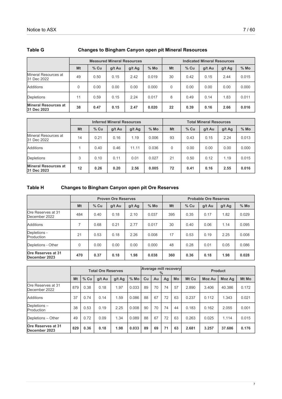 Notice to ASX 7 / 60 7 Table G Changes to Bingham Canyon open pit Mineral Resources Measured Mineral Resources Indicated Mineral Resources Mt % Cu g/t Au g/t Ag % Mo Mt % Cu g/t Au g/t Ag % Mo Mineral Resources at 31 Dec 2022 49 0.50 0.15 2.42 0.019 30 0.42 0.15 2.44 0.015 Additions 0 0.00 0.00 0.00 0.000 0 0.00 0.00 0.00 0.000 Depletions 11 0.59 0.15 2.24 0.017 8 0.49 0.14 1.83 0.011 Mineral Resources at 31 Dec 2023 38 0.47 0.15 2.47 0.020 22 0.39 0.16 2.66 0.016 Inferred Mineral Resources Total Mineral Resources Mt % Cu g/t Au g/t Ag % Mo Mt % Cu g/t Au g/t Ag % Mo Mineral Resources at 31 Dec 2022 14 0.21 0.16 1.19 0.006 93 0.43 0.15 2.24 0.013 Additions 1 0.40 0.46 11.11 0.036 0 0.00 0.00 0.00 0.000 Depletions 3 0.10 0.11 0.01 0.027 21 0.50 0.12 1.19 0.015 Mineral Resources at 31 Dec 2023 12 0.26 0.20 2.56 0.005 72 0.41 0.16 2.55 0.016 Table H Changes to Bingham Canyon open pit Ore Reserves Proven Ore Reserves Probable Ore Reserves Mt % Cu g/t Au g/t Ag % Mo Mt % Cu g/t Au g/t Ag % Mo Ore Reserves at 31 December 2022 484 0.40 0.18 2.10 0.037 395 0.35 0.17 1.82 0.029 Additions 7 0.68 0.21 2.77 0.017 30 0.40 0.06 1.14 0.095 Depletions - Production 21 0.53 0.18 2.26 0.008 17 0.53 0.19 2.25 0.008 Depletions - Other 0 0.00 0.00 0.00 0.000 48 0.28 0.01 0.05 0.086 Ore Reserves at 31 December 2023 470 0.37 0.18 1.98 0.038 360 0.36 0.18 1.98 0.028 Total Ore Reserves Average mill recovery % Product Mt % Cu g/t Au g/t Ag % Mo Cu Au Ag Mo Mt Cu Moz Au Moz Ag Mt Mo Ore Reserves at 31 December 2022 879 0.38 0.18 1.97 0.033 89 70 74 57 2.890 3.406 40.386 0.172 Additions 37 0.74 0.14 1.59 0.086 88 67 72 63 0.237 0.112 1.343 0.021 Depletions – Production 38 0.53 0.19 2.25 0.008 90 70 74 44 0.183 0.162 2.055 0.001 Depletions – Other 49 0.72 0.09 1.34 0.089 88 67 72 63 0.263 0.025 1.114 0.015 Ore Reserves at 31 December 2023 829 0.36 0.18 1.98 0.033 89 69 71 63 2.681 3.257 37.686 0.176