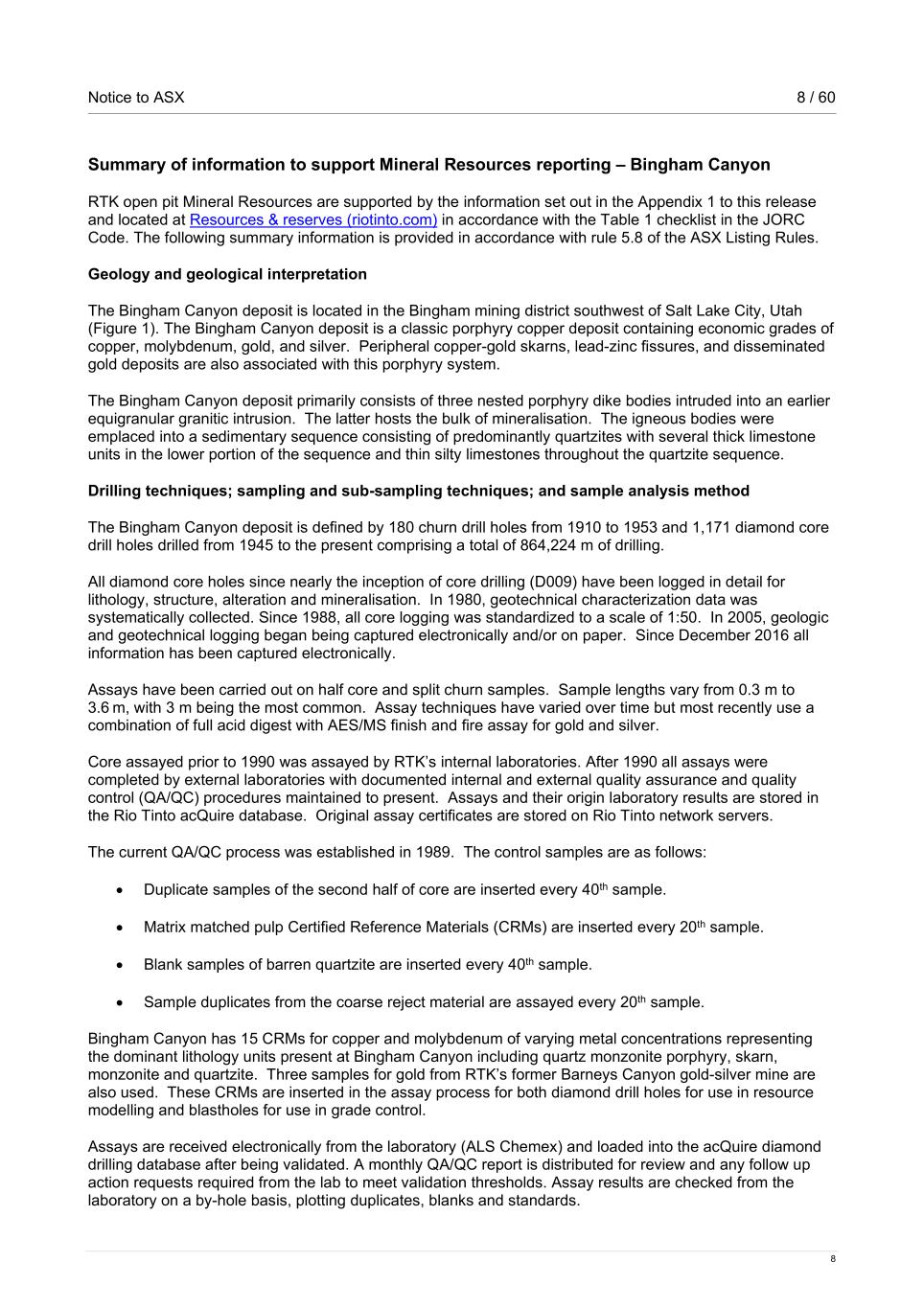 Notice to ASX 8 / 60 8 Summary of information to support Mineral Resources reporting – Bingham Canyon RTK open pit Mineral Resources are supported by the information set out in the Appendix 1 to this release and located at Resources & reserves (riotinto.com) in accordance with the Table 1 checklist in the JORC Code. The following summary information is provided in accordance with rule 5.8 of the ASX Listing Rules. Geology and geological interpretation The Bingham Canyon deposit is located in the Bingham mining district southwest of Salt Lake City, Utah (Figure 1). The Bingham Canyon deposit is a classic porphyry copper deposit containing economic grades of copper, molybdenum, gold, and silver. Peripheral copper-gold skarns, lead-zinc fissures, and disseminated gold deposits are also associated with this porphyry system. The Bingham Canyon deposit primarily consists of three nested porphyry dike bodies intruded into an earlier equigranular granitic intrusion. The latter hosts the bulk of mineralisation. The igneous bodies were emplaced into a sedimentary sequence consisting of predominantly quartzites with several thick limestone units in the lower portion of the sequence and thin silty limestones throughout the quartzite sequence. Drilling techniques; sampling and sub-sampling techniques; and sample analysis method The Bingham Canyon deposit is defined by 180 churn drill holes from 1910 to 1953 and 1,171 diamond core drill holes drilled from 1945 to the present comprising a total of 864,224 m of drilling. All diamond core holes since nearly the inception of core drilling (D009) have been logged in detail for lithology, structure, alteration and mineralisation. In 1980, geotechnical characterization data was systematically collected. Since 1988, all core logging was standardized to a scale of 1:50. In 2005, geologic and geotechnical logging began being captured electronically and/or on paper. Since December 2016 all information has been captured electronically. Assays have been carried out on half core and split churn samples. Sample lengths vary from 0.3 m to 3.6 m, with 3 m being the most common. Assay techniques have varied over time but most recently use a combination of full acid digest with AES/MS finish and fire assay for gold and silver. Core assayed prior to 1990 was assayed by RTK’s internal laboratories. After 1990 all assays were completed by external laboratories with documented internal and external quality assurance and quality control (QA/QC) procedures maintained to present. Assays and their origin laboratory results are stored in the Rio Tinto acQuire database. Original assay certificates are stored on Rio Tinto network servers. The current QA/QC process was established in 1989. The control samples are as follows: • Duplicate samples of the second half of core are inserted every 40th sample. • Matrix matched pulp Certified Reference Materials (CRMs) are inserted every 20th sample. • Blank samples of barren quartzite are inserted every 40th sample. • Sample duplicates from the coarse reject material are assayed every 20th sample. Bingham Canyon has 15 CRMs for copper and molybdenum of varying metal concentrations representing the dominant lithology units present at Bingham Canyon including quartz monzonite porphyry, skarn, monzonite and quartzite. Three samples for gold from RTK’s former Barneys Canyon gold-silver mine are also used. These CRMs are inserted in the assay process for both diamond drill holes for use in resource modelling and blastholes for use in grade control. Assays are received electronically from the laboratory (ALS Chemex) and loaded into the acQuire diamond drilling database after being validated. A monthly QA/QC report is distributed for review and any follow up action requests required from the lab to meet validation thresholds. Assay results are checked from the laboratory on a by-hole basis, plotting duplicates, blanks and standards.