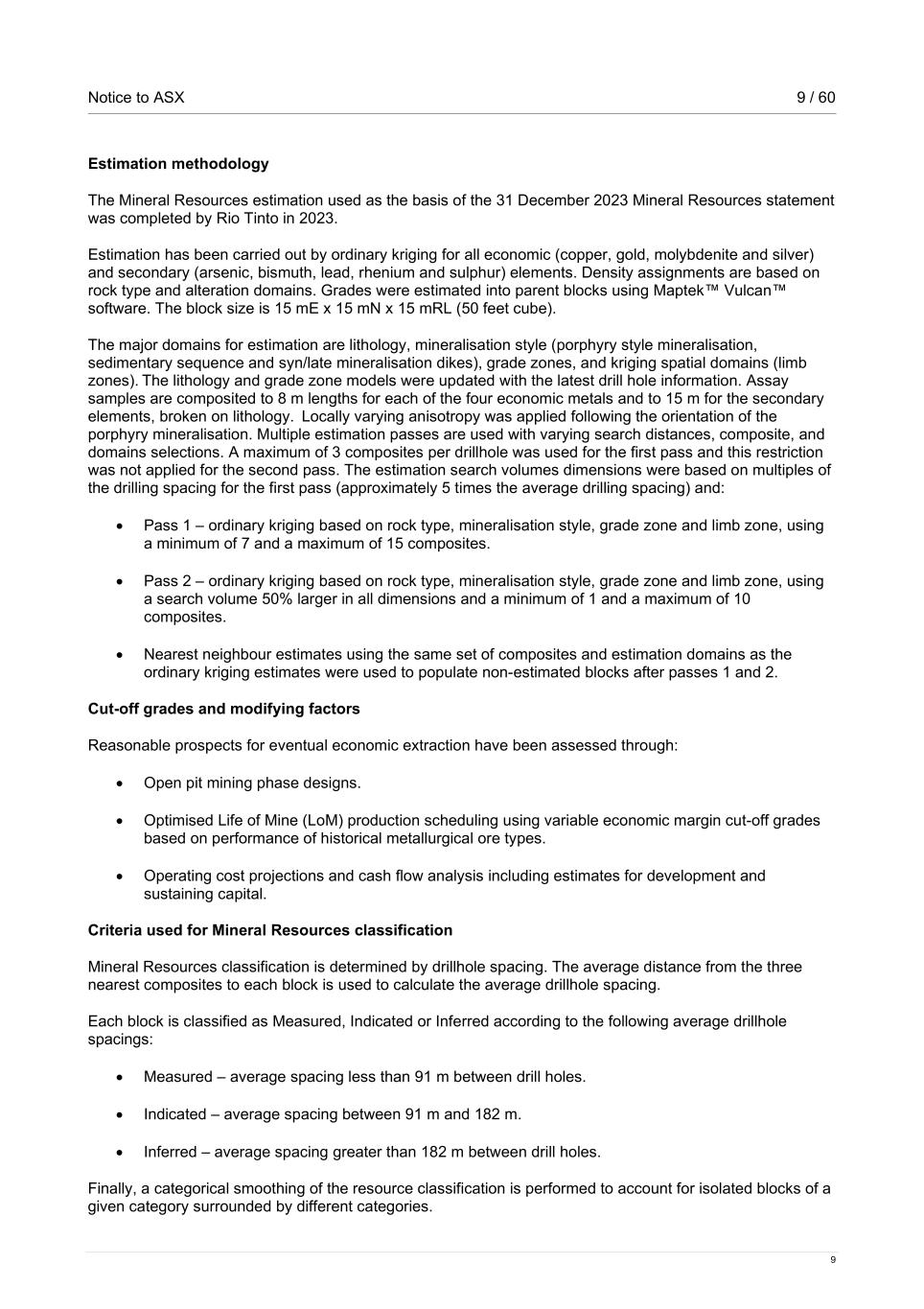 Notice to ASX 9 / 60 9 Estimation methodology The Mineral Resources estimation used as the basis of the 31 December 2023 Mineral Resources statement was completed by Rio Tinto in 2023. Estimation has been carried out by ordinary kriging for all economic (copper, gold, molybdenite and silver) and secondary (arsenic, bismuth, lead, rhenium and sulphur) elements. Density assignments are based on rock type and alteration domains. Grades were estimated into parent blocks using Maptek™ Vulcan™ software. The block size is 15 mE x 15 mN x 15 mRL (50 feet cube).  The major domains for estimation are lithology, mineralisation style (porphyry style mineralisation, sedimentary sequence and syn/late mineralisation dikes), grade zones, and kriging spatial domains (limb zones). The lithology and grade zone models were updated with the latest drill hole information. Assay samples are composited to 8 m lengths for each of the four economic metals and to 15 m for the secondary elements, broken on lithology.  Locally varying anisotropy was applied following the orientation of the porphyry mineralisation. Multiple estimation passes are used with varying search distances, composite, and domains selections. A maximum of 3 composites per drillhole was used for the first pass and this restriction was not applied for the second pass. The estimation search volumes dimensions were based on multiples of the drilling spacing for the first pass (approximately 5 times the average drilling spacing) and: • Pass 1 – ordinary kriging based on rock type, mineralisation style, grade zone and limb zone, using a minimum of 7 and a maximum of 15 composites. • Pass 2 – ordinary kriging based on rock type, mineralisation style, grade zone and limb zone, using a search volume 50% larger in all dimensions and a minimum of 1 and a maximum of 10 composites. • Nearest neighbour estimates using the same set of composites and estimation domains as the ordinary kriging estimates were used to populate non-estimated blocks after passes 1 and 2. Cut-off grades and modifying factors Reasonable prospects for eventual economic extraction have been assessed through: • Open pit mining phase designs. • Optimised Life of Mine (LoM) production scheduling using variable economic margin cut-off grades based on performance of historical metallurgical ore types. • Operating cost projections and cash flow analysis including estimates for development and sustaining capital. Criteria used for Mineral Resources classification Mineral Resources classification is determined by drillhole spacing. The average distance from the three nearest composites to each block is used to calculate the average drillhole spacing. Each block is classified as Measured, Indicated or Inferred according to the following average drillhole spacings: • Measured – average spacing less than 91 m between drill holes. • Indicated – average spacing between 91 m and 182 m. • Inferred – average spacing greater than 182 m between drill holes. Finally, a categorical smoothing of the resource classification is performed to account for isolated blocks of a given category surrounded by different categories.