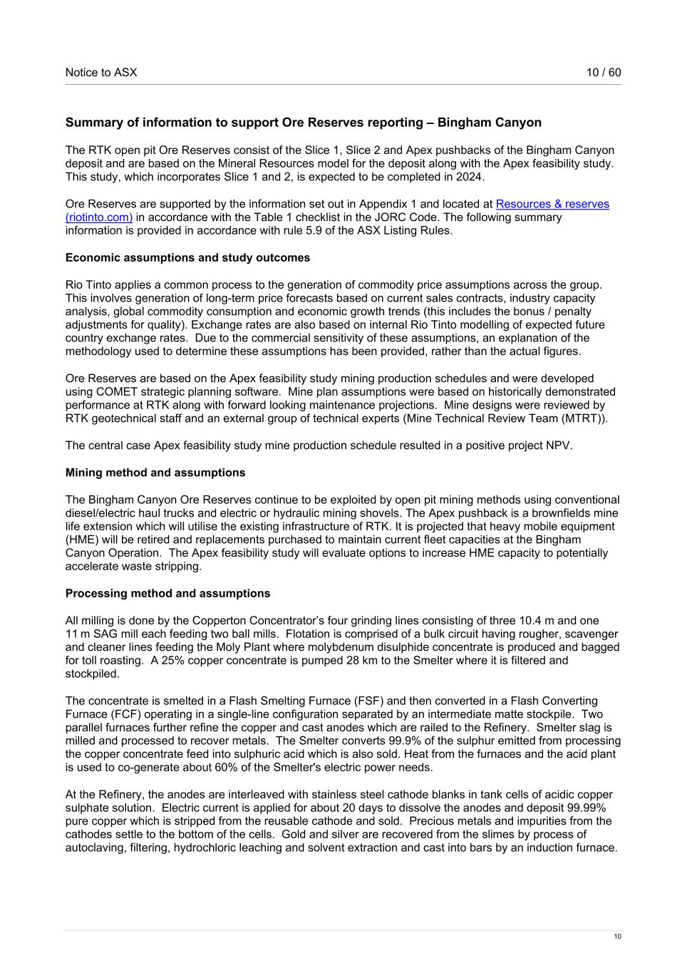 Notice to ASX 10 / 60 10 Summary of information to support Ore Reserves reporting – Bingham Canyon The RTK open pit Ore Reserves consist of the Slice 1, Slice 2 and Apex pushbacks of the Bingham Canyon deposit and are based on the Mineral Resources model for the deposit along with the Apex feasibility study. This study, which incorporates Slice 1 and 2, is expected to be completed in 2024. Ore Reserves are supported by the information set out in Appendix 1 and located at Resources & reserves (riotinto.com) in accordance with the Table 1 checklist in the JORC Code. The following summary information is provided in accordance with rule 5.9 of the ASX Listing Rules. Economic assumptions and study outcomes Rio Tinto applies a common process to the generation of commodity price assumptions across the group. This involves generation of long-term price forecasts based on current sales contracts, industry capacity analysis, global commodity consumption and economic growth trends (this includes the bonus / penalty adjustments for quality). Exchange rates are also based on internal Rio Tinto modelling of expected future country exchange rates. Due to the commercial sensitivity of these assumptions, an explanation of the methodology used to determine these assumptions has been provided, rather than the actual figures. Ore Reserves are based on the Apex feasibility study mining production schedules and were developed using COMET strategic planning software. Mine plan assumptions were based on historically demonstrated performance at RTK along with forward looking maintenance projections. Mine designs were reviewed by RTK geotechnical staff and an external group of technical experts (Mine Technical Review Team (MTRT)). The central case Apex feasibility study mine production schedule resulted in a positive project NPV. Mining method and assumptions The Bingham Canyon Ore Reserves continue to be exploited by open pit mining methods using conventional diesel/electric haul trucks and electric or hydraulic mining shovels. The Apex pushback is a brownfields mine life extension which will utilise the existing infrastructure of RTK. It is projected that heavy mobile equipment (HME) will be retired and replacements purchased to maintain current fleet capacities at the Bingham Canyon Operation. The Apex feasibility study will evaluate options to increase HME capacity to potentially accelerate waste stripping. Processing method and assumptions All milling is done by the Copperton Concentrator’s four grinding lines consisting of three 10.4 m and one 11 m SAG mill each feeding two ball mills. Flotation is comprised of a bulk circuit having rougher, scavenger and cleaner lines feeding the Moly Plant where molybdenum disulphide concentrate is produced and bagged for toll roasting. A 25% copper concentrate is pumped 28 km to the Smelter where it is filtered and stockpiled. The concentrate is smelted in a Flash Smelting Furnace (FSF) and then converted in a Flash Converting Furnace (FCF) operating in a single-line configuration separated by an intermediate matte stockpile. Two parallel furnaces further refine the copper and cast anodes which are railed to the Refinery. Smelter slag is milled and processed to recover metals. The Smelter converts 99.9% of the sulphur emitted from processing the copper concentrate feed into sulphuric acid which is also sold. Heat from the furnaces and the acid plant is used to co-generate about 60% of the Smelter's electric power needs. At the Refinery, the anodes are interleaved with stainless steel cathode blanks in tank cells of acidic copper sulphate solution. Electric current is applied for about 20 days to dissolve the anodes and deposit 99.99% pure copper which is stripped from the reusable cathode and sold. Precious metals and impurities from the cathodes settle to the bottom of the cells. Gold and silver are recovered from the slimes by process of autoclaving, filtering, hydrochloric leaching and solvent extraction and cast into bars by an induction furnace.