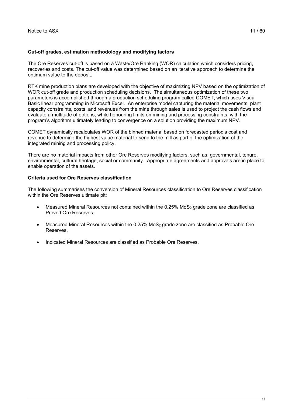 Notice to ASX 11 / 60 11 Cut-off grades, estimation methodology and modifying factors The Ore Reserves cut-off is based on a Waste/Ore Ranking (WOR) calculation which considers pricing, recoveries and costs. The cut-off value was determined based on an iterative approach to determine the optimum value to the deposit. RTK mine production plans are developed with the objective of maximizing NPV based on the optimization of WOR cut-off grade and production scheduling decisions. The simultaneous optimization of these two parameters is accomplished through a production scheduling program called COMET, which uses Visual Basic linear programming in Microsoft Excel. An enterprise model capturing the material movements, plant capacity constraints, costs, and revenues from the mine through sales is used to project the cash flows and evaluate a multitude of options, while honouring limits on mining and processing constraints, with the program’s algorithm ultimately leading to convergence on a solution providing the maximum NPV. COMET dynamically recalculates WOR of the binned material based on forecasted period’s cost and revenue to determine the highest value material to send to the mill as part of the optimization of the integrated mining and processing policy. There are no material impacts from other Ore Reserves modifying factors, such as: governmental, tenure, environmental, cultural heritage, social or community. Appropriate agreements and approvals are in place to enable operation of the assets. Criteria used for Ore Reserves classification The following summarises the conversion of Mineral Resources classification to Ore Reserves classification within the Ore Reserves ultimate pit: • Measured Mineral Resources not contained within the 0.25% MoS2 grade zone are classified as Proved Ore Reserves. • Measured Mineral Resources within the 0.25% MoS2 grade zone are classified as Probable Ore Reserves. • Indicated Mineral Resources are classified as Probable Ore Reserves.