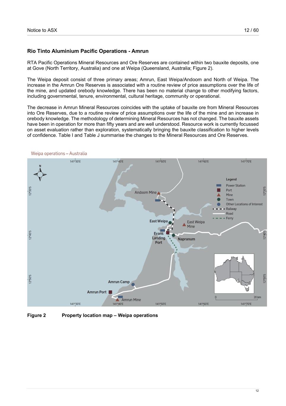 Notice to ASX 12 / 60 12 Rio Tinto Aluminium Pacific Operations - Amrun RTA Pacific Operations Mineral Resources and Ore Reserves are contained within two bauxite deposits, one at Gove (North Territory, Australia) and one at Weipa (Queensland, Australia; Figure 2). The Weipa deposit consist of three primary areas; Amrun, East Weipa/Andoom and North of Weipa. The increase in the Amrun Ore Reserves is associated with a routine review of price assumptions over the life of the mine, and updated orebody knowledge. There has been no material change to other modifying factors, including governmental, tenure, environmental, cultural heritage, community or operational. The decrease in Amrun Mineral Resources coincides with the uptake of bauxite ore from Mineral Resources into Ore Reserves, due to a routine review of price assumptions over the life of the mine and an increase in orebody knowledge. The methodology of determining Mineral Resources has not changed. The bauxite assets have been in operation for more than fifty years and are well understood. Resource work is currently focussed on asset evaluation rather than exploration, systematically bringing the bauxite classification to higher levels of confidence. Table I and Table J summarise the changes to the Mineral Resources and Ore Reserves. Figure 2 Property location map – Weipa operations