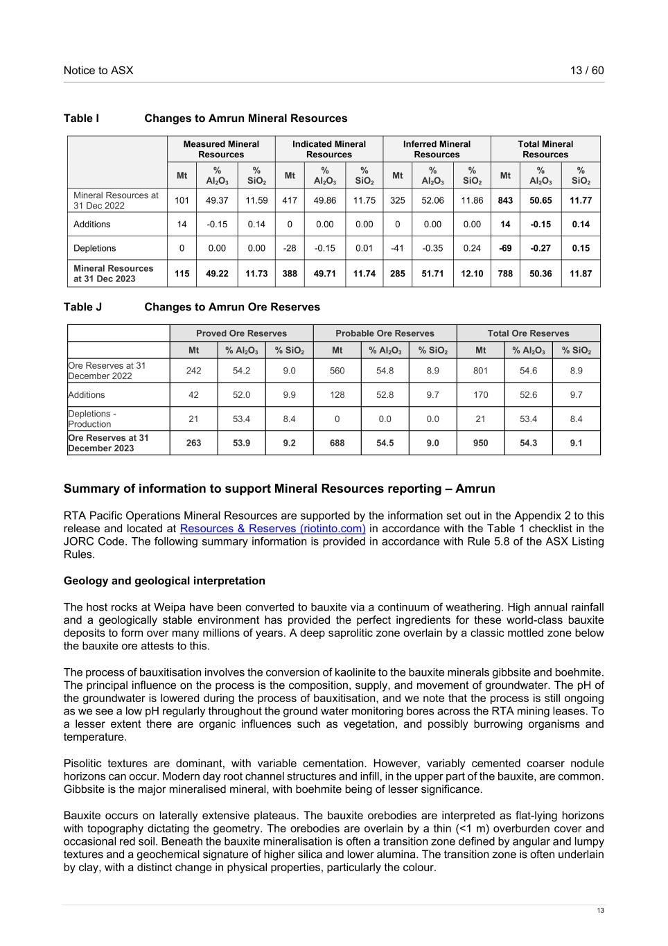 Notice to ASX 13 / 60 13 Table I Changes to Amrun Mineral Resources Measured Mineral Resources Indicated Mineral Resources Inferred Mineral Resources Total Mineral Resources Mt % Al2O3 % SiO2 Mt % Al2O3 % SiO2 Mt % Al2O3 % SiO2 Mt % Al2O3 % SiO2 Mineral Resources at 31 Dec 2022 101 49.37 11.59 417 49.86 11.75 325 52.06 11.86 843 50.65 11.77 Additions 14 -0.15 0.14 0 0.00 0.00 0 0.00 0.00 14 -0.15 0.14 Depletions 0 0.00 0.00 -28 -0.15 0.01 -41 -0.35 0.24 -69 -0.27 0.15 Mineral Resources at 31 Dec 2023 115 49.22 11.73 388 49.71 11.74 285 51.71 12.10 788 50.36 11.87 Table J Changes to Amrun Ore Reserves Proved Ore Reserves Probable Ore Reserves Total Ore Reserves Mt % Al2O3 % SiO2 Mt % Al2O3 % SiO2 Mt % Al2O3 % SiO2 Ore Reserves at 31 December 2022 242 54.2 9.0 560 54.8 8.9 801 54.6 8.9 Additions 42 52.0 9.9 128 52.8 9.7 170 52.6 9.7 Depletions - Production 21 53.4 8.4 0 0.0 0.0 21 53.4 8.4 Ore Reserves at 31 December 2023 263 53.9 9.2 688 54.5 9.0 950 54.3 9.1 Summary of information to support Mineral Resources reporting – Amrun RTA Pacific Operations Mineral Resources are supported by the information set out in the Appendix 2 to this release and located at Resources & Reserves (riotinto.com) in accordance with the Table 1 checklist in the JORC Code. The following summary information is provided in accordance with Rule 5.8 of the ASX Listing Rules. Geology and geological interpretation The host rocks at Weipa have been converted to bauxite via a continuum of weathering. High annual rainfall and a geologically stable environment has provided the perfect ingredients for these world-class bauxite deposits to form over many millions of years. A deep saprolitic zone overlain by a classic mottled zone below the bauxite ore attests to this. The process of bauxitisation involves the conversion of kaolinite to the bauxite minerals gibbsite and boehmite. The principal influence on the process is the composition, supply, and movement of groundwater. The pH of the groundwater is lowered during the process of bauxitisation, and we note that the process is still ongoing as we see a low pH regularly throughout the ground water monitoring bores across the RTA mining leases. To a lesser extent there are organic influences such as vegetation, and possibly burrowing organisms and temperature. Pisolitic textures are dominant, with variable cementation. However, variably cemented coarser nodule horizons can occur. Modern day root channel structures and infill, in the upper part of the bauxite, are common. Gibbsite is the major mineralised mineral, with boehmite being of lesser significance. Bauxite occurs on laterally extensive plateaus. The bauxite orebodies are interpreted as flat-lying horizons with topography dictating the geometry. The orebodies are overlain by a thin (<1 m) overburden cover and occasional red soil. Beneath the bauxite mineralisation is often a transition zone defined by angular and lumpy textures and a geochemical signature of higher silica and lower alumina. The transition zone is often underlain by clay, with a distinct change in physical properties, particularly the colour.