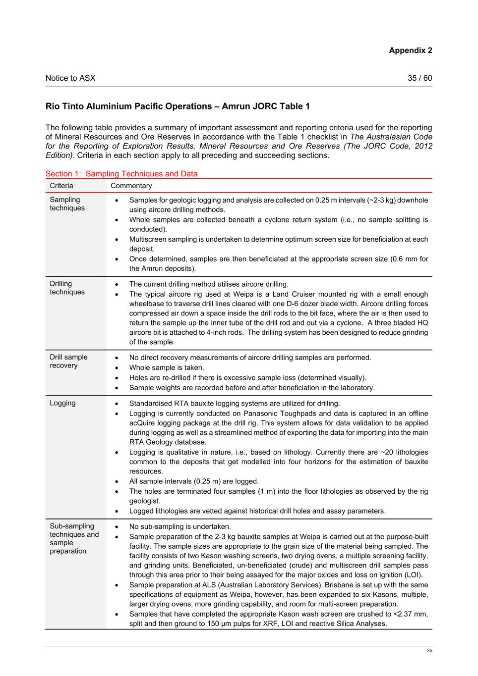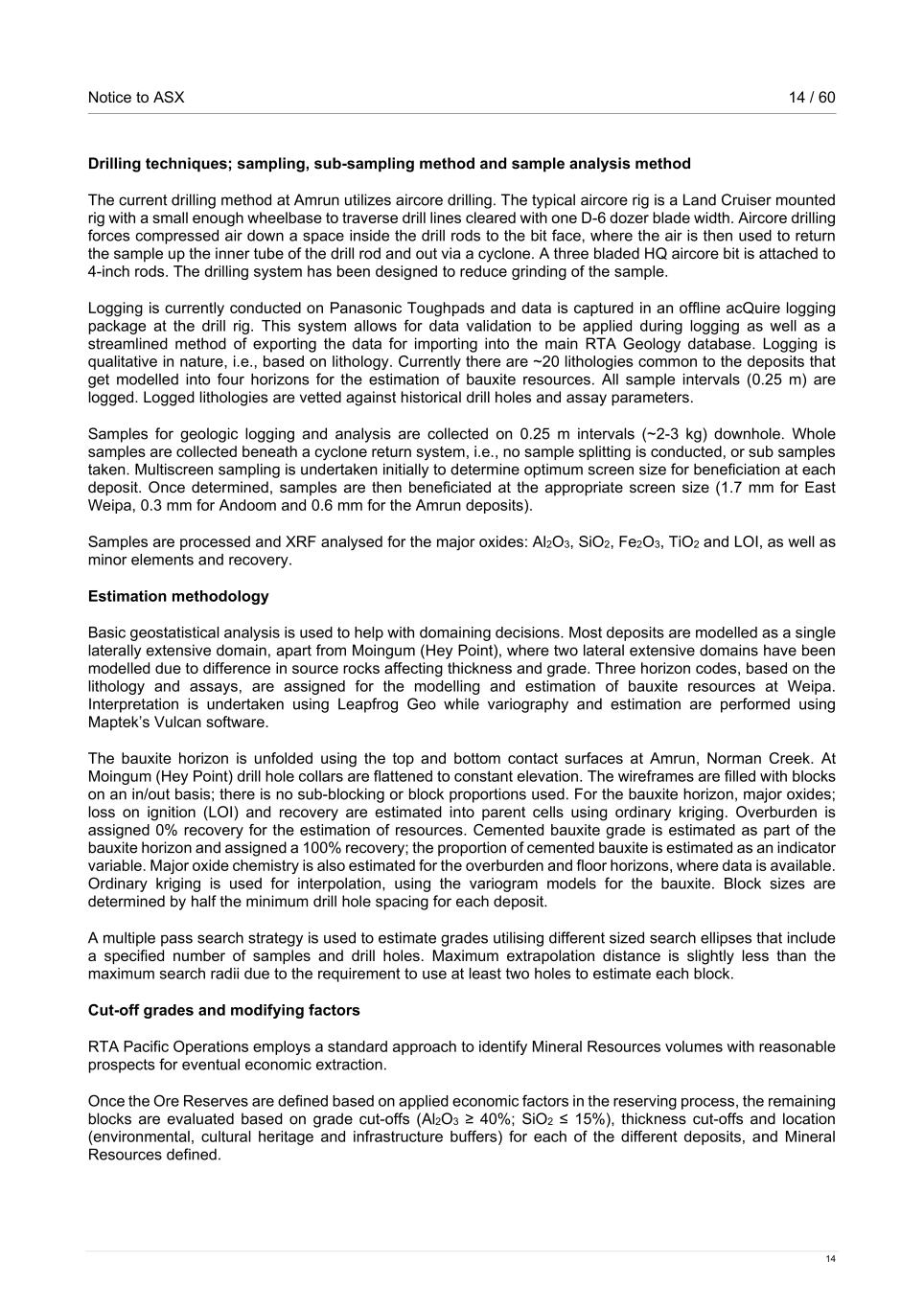 Notice to ASX 14 / 60 14 Drilling techniques; sampling, sub-sampling method and sample analysis method The current drilling method at Amrun utilizes aircore drilling. The typical aircore rig is a Land Cruiser mounted rig with a small enough wheelbase to traverse drill lines cleared with one D-6 dozer blade width. Aircore drilling forces compressed air down a space inside the drill rods to the bit face, where the air is then used to return the sample up the inner tube of the drill rod and out via a cyclone. A three bladed HQ aircore bit is attached to 4-inch rods. The drilling system has been designed to reduce grinding of the sample. Logging is currently conducted on Panasonic Toughpads and data is captured in an offline acQuire logging package at the drill rig. This system allows for data validation to be applied during logging as well as a streamlined method of exporting the data for importing into the main RTA Geology database. Logging is qualitative in nature, i.e., based on lithology. Currently there are ~20 lithologies common to the deposits that get modelled into four horizons for the estimation of bauxite resources. All sample intervals (0.25 m) are logged. Logged lithologies are vetted against historical drill holes and assay parameters. Samples for geologic logging and analysis are collected on 0.25 m intervals (~2-3 kg) downhole. Whole samples are collected beneath a cyclone return system, i.e., no sample splitting is conducted, or sub samples taken. Multiscreen sampling is undertaken initially to determine optimum screen size for beneficiation at each deposit. Once determined, samples are then beneficiated at the appropriate screen size (1.7 mm for East Weipa, 0.3 mm for Andoom and 0.6 mm for the Amrun deposits). Samples are processed and XRF analysed for the major oxides: Al2O3, SiO2, Fe2O3, TiO2 and LOI, as well as minor elements and recovery. Estimation methodology Basic geostatistical analysis is used to help with domaining decisions. Most deposits are modelled as a single laterally extensive domain, apart from Moingum (Hey Point), where two lateral extensive domains have been modelled due to difference in source rocks affecting thickness and grade. Three horizon codes, based on the lithology and assays, are assigned for the modelling and estimation of bauxite resources at Weipa. Interpretation is undertaken using Leapfrog Geo while variography and estimation are performed using Maptek’s Vulcan software. The bauxite horizon is unfolded using the top and bottom contact surfaces at Amrun, Norman Creek. At Moingum (Hey Point) drill hole collars are flattened to constant elevation. The wireframes are filled with blocks on an in/out basis; there is no sub-blocking or block proportions used. For the bauxite horizon, major oxides; loss on ignition (LOI) and recovery are estimated into parent cells using ordinary kriging. Overburden is assigned 0% recovery for the estimation of resources. Cemented bauxite grade is estimated as part of the bauxite horizon and assigned a 100% recovery; the proportion of cemented bauxite is estimated as an indicator variable. Major oxide chemistry is also estimated for the overburden and floor horizons, where data is available. Ordinary kriging is used for interpolation, using the variogram models for the bauxite. Block sizes are determined by half the minimum drill hole spacing for each deposit. A multiple pass search strategy is used to estimate grades utilising different sized search ellipses that include a specified number of samples and drill holes. Maximum extrapolation distance is slightly less than the maximum search radii due to the requirement to use at least two holes to estimate each block. Cut-off grades and modifying factors RTA Pacific Operations employs a standard approach to identify Mineral Resources volumes with reasonable prospects for eventual economic extraction. Once the Ore Reserves are defined based on applied economic factors in the reserving process, the remaining blocks are evaluated based on grade cut-offs (Al2O3 ≥ 40%; SiO2 ≤ 15%), thickness cut-offs and location (environmental, cultural heritage and infrastructure buffers) for each of the different deposits, and Mineral Resources defined.