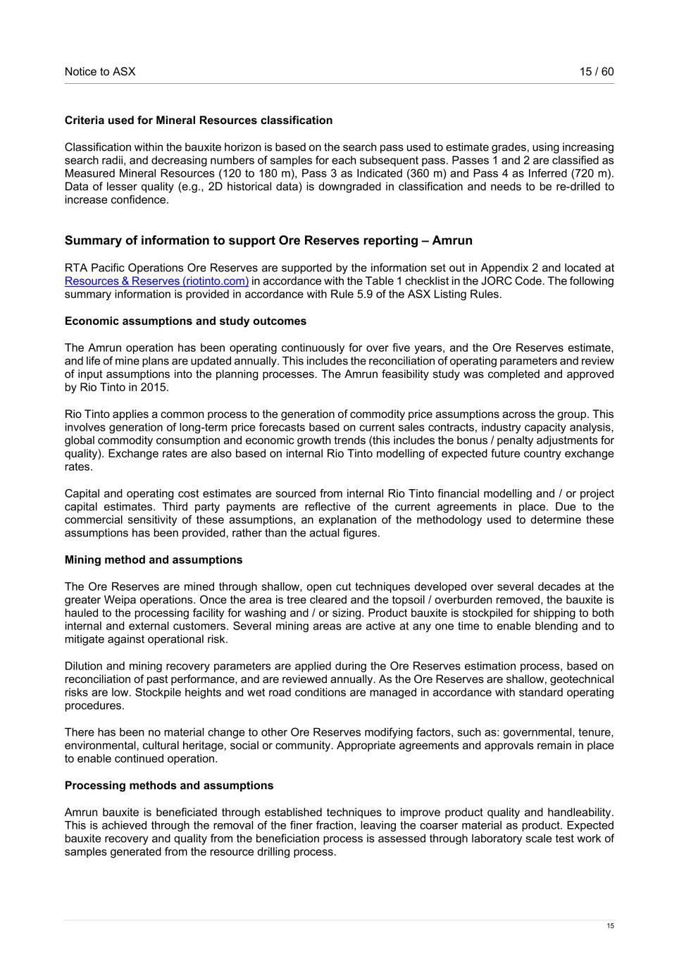 Notice to ASX 15 / 60 15 Criteria used for Mineral Resources classification Classification within the bauxite horizon is based on the search pass used to estimate grades, using increasing search radii, and decreasing numbers of samples for each subsequent pass. Passes 1 and 2 are classified as Measured Mineral Resources (120 to 180 m), Pass 3 as Indicated (360 m) and Pass 4 as Inferred (720 m). Data of lesser quality (e.g., 2D historical data) is downgraded in classification and needs to be re-drilled to increase confidence. Summary of information to support Ore Reserves reporting – Amrun RTA Pacific Operations Ore Reserves are supported by the information set out in Appendix 2 and located at Resources & Reserves (riotinto.com) in accordance with the Table 1 checklist in the JORC Code. The following summary information is provided in accordance with Rule 5.9 of the ASX Listing Rules. Economic assumptions and study outcomes The Amrun operation has been operating continuously for over five years, and the Ore Reserves estimate, and life of mine plans are updated annually. This includes the reconciliation of operating parameters and review of input assumptions into the planning processes. The Amrun feasibility study was completed and approved by Rio Tinto in 2015. Rio Tinto applies a common process to the generation of commodity price assumptions across the group. This involves generation of long-term price forecasts based on current sales contracts, industry capacity analysis, global commodity consumption and economic growth trends (this includes the bonus / penalty adjustments for quality). Exchange rates are also based on internal Rio Tinto modelling of expected future country exchange rates. Capital and operating cost estimates are sourced from internal Rio Tinto financial modelling and / or project capital estimates. Third party payments are reflective of the current agreements in place. Due to the commercial sensitivity of these assumptions, an explanation of the methodology used to determine these assumptions has been provided, rather than the actual figures. Mining method and assumptions The Ore Reserves are mined through shallow, open cut techniques developed over several decades at the greater Weipa operations. Once the area is tree cleared and the topsoil / overburden removed, the bauxite is hauled to the processing facility for washing and / or sizing. Product bauxite is stockpiled for shipping to both internal and external customers. Several mining areas are active at any one time to enable blending and to mitigate against operational risk. Dilution and mining recovery parameters are applied during the Ore Reserves estimation process, based on reconciliation of past performance, and are reviewed annually. As the Ore Reserves are shallow, geotechnical risks are low. Stockpile heights and wet road conditions are managed in accordance with standard operating procedures. There has been no material change to other Ore Reserves modifying factors, such as: governmental, tenure, environmental, cultural heritage, social or community. Appropriate agreements and approvals remain in place to enable continued operation. Processing methods and assumptions Amrun bauxite is beneficiated through established techniques to improve product quality and handleability. This is achieved through the removal of the finer fraction, leaving the coarser material as product. Expected bauxite recovery and quality from the beneficiation process is assessed through laboratory scale test work of samples generated from the resource drilling process.