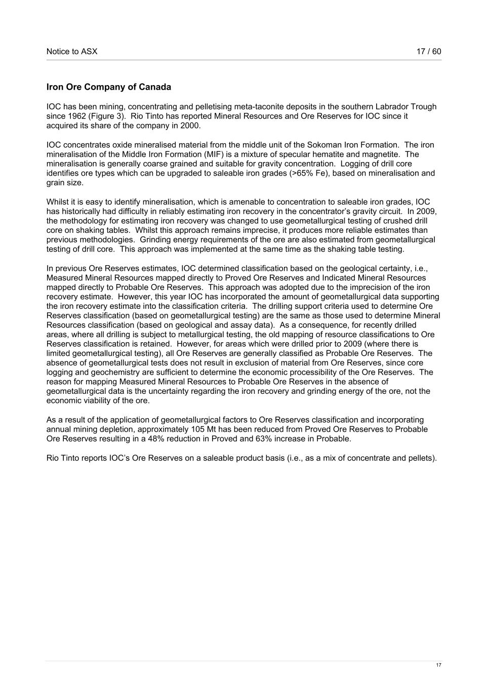 Notice to ASX 17 / 60 17 Iron Ore Company of Canada IOC has been mining, concentrating and pelletising meta-taconite deposits in the southern Labrador Trough since 1962 (Figure 3). Rio Tinto has reported Mineral Resources and Ore Reserves for IOC since it acquired its share of the company in 2000. IOC concentrates oxide mineralised material from the middle unit of the Sokoman Iron Formation. The iron mineralisation of the Middle Iron Formation (MIF) is a mixture of specular hematite and magnetite. The mineralisation is generally coarse grained and suitable for gravity concentration. Logging of drill core identifies ore types which can be upgraded to saleable iron grades (>65% Fe), based on mineralisation and grain size. Whilst it is easy to identify mineralisation, which is amenable to concentration to saleable iron grades, IOC has historically had difficulty in reliably estimating iron recovery in the concentrator’s gravity circuit. In 2009, the methodology for estimating iron recovery was changed to use geometallurgical testing of crushed drill core on shaking tables. Whilst this approach remains imprecise, it produces more reliable estimates than previous methodologies. Grinding energy requirements of the ore are also estimated from geometallurgical testing of drill core. This approach was implemented at the same time as the shaking table testing. In previous Ore Reserves estimates, IOC determined classification based on the geological certainty, i.e., Measured Mineral Resources mapped directly to Proved Ore Reserves and Indicated Mineral Resources mapped directly to Probable Ore Reserves. This approach was adopted due to the imprecision of the iron recovery estimate. However, this year IOC has incorporated the amount of geometallurgical data supporting the iron recovery estimate into the classification criteria. The drilling support criteria used to determine Ore Reserves classification (based on geometallurgical testing) are the same as those used to determine Mineral Resources classification (based on geological and assay data). As a consequence, for recently drilled areas, where all drilling is subject to metallurgical testing, the old mapping of resource classifications to Ore Reserves classification is retained. However, for areas which were drilled prior to 2009 (where there is limited geometallurgical testing), all Ore Reserves are generally classified as Probable Ore Reserves. The absence of geometallurgical tests does not result in exclusion of material from Ore Reserves, since core logging and geochemistry are sufficient to determine the economic processibility of the Ore Reserves. The reason for mapping Measured Mineral Resources to Probable Ore Reserves in the absence of geometallurgical data is the uncertainty regarding the iron recovery and grinding energy of the ore, not the economic viability of the ore. As a result of the application of geometallurgical factors to Ore Reserves classification and incorporating annual mining depletion, approximately 105 Mt has been reduced from Proved Ore Reserves to Probable Ore Reserves resulting in a 48% reduction in Proved and 63% increase in Probable. Rio Tinto reports IOC’s Ore Reserves on a saleable product basis (i.e., as a mix of concentrate and pellets).