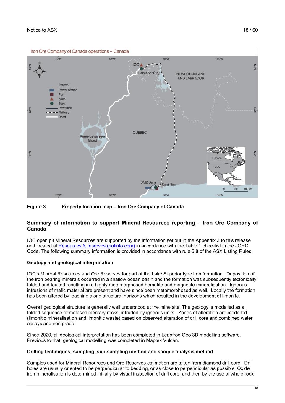 Notice to ASX 18 / 60 18 Figure 3 Property location map – Iron Ore Company of Canada Summary of information to support Mineral Resources reporting – Iron Ore Company of Canada IOC open pit Mineral Resources are supported by the information set out in the Appendix 3 to this release and located at Resources & reserves (riotinto.com) in accordance with the Table 1 checklist in the JORC Code. The following summary information is provided in accordance with rule 5.8 of the ASX Listing Rules. Geology and geological interpretation IOC’s Mineral Resources and Ore Reserves for part of the Lake Superior type iron formation. Deposition of the iron bearing minerals occurred in a shallow ocean basin and the formation was subsequently tectonically folded and faulted resulting in a highly metamorphosed hematite and magnetite mineralisation. Igneous intrusions of mafic material are present and have since been metamorphosed as well. Locally the formation has been altered by leaching along structural horizons which resulted in the development of limonite. Overall geological structure is generally well understood at the mine site. The geology is modelled as a folded sequence of metasedimentary rocks, intruded by igneous units. Zones of alteration are modelled (limonitic mineralisation and limonitic waste) based on observed alteration of drill core and combined water assays and iron grade. Since 2020, all geological interpretation has been completed in Leapfrog Geo 3D modelling software. Previous to that, geological modelling was completed in Maptek Vulcan. Drilling techniques; sampling, sub-sampling method and sample analysis method Samples used for Mineral Resources and Ore Reserves estimation are taken from diamond drill core. Drill holes are usually oriented to be perpendicular to bedding, or as close to perpendicular as possible. Oxide iron mineralisation is determined initially by visual inspection of drill core, and then by the use of whole rock