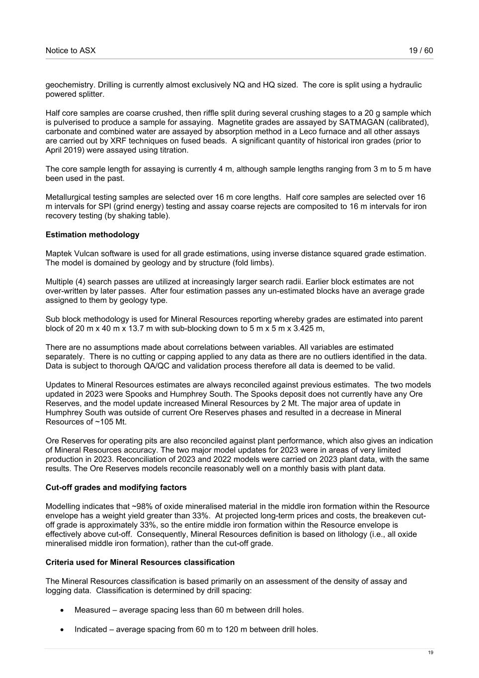 Notice to ASX 19 / 60 19 geochemistry. Drilling is currently almost exclusively NQ and HQ sized. The core is split using a hydraulic powered splitter. Half core samples are coarse crushed, then riffle split during several crushing stages to a 20 g sample which is pulverised to produce a sample for assaying. Magnetite grades are assayed by SATMAGAN (calibrated), carbonate and combined water are assayed by absorption method in a Leco furnace and all other assays are carried out by XRF techniques on fused beads. A significant quantity of historical iron grades (prior to April 2019) were assayed using titration. The core sample length for assaying is currently 4 m, although sample lengths ranging from 3 m to 5 m have been used in the past. Metallurgical testing samples are selected over 16 m core lengths. Half core samples are selected over 16 m intervals for SPI (grind energy) testing and assay coarse rejects are composited to 16 m intervals for iron recovery testing (by shaking table). Estimation methodology Maptek Vulcan software is used for all grade estimations, using inverse distance squared grade estimation. The model is domained by geology and by structure (fold limbs). Multiple (4) search passes are utilized at increasingly larger search radii. Earlier block estimates are not over-written by later passes. After four estimation passes any un-estimated blocks have an average grade assigned to them by geology type. Sub block methodology is used for Mineral Resources reporting whereby grades are estimated into parent block of 20 m x 40 m x 13.7 m with sub-blocking down to 5 m x 5 m x 3.425 m, There are no assumptions made about correlations between variables. All variables are estimated separately. There is no cutting or capping applied to any data as there are no outliers identified in the data. Data is subject to thorough QA/QC and validation process therefore all data is deemed to be valid. Updates to Mineral Resources estimates are always reconciled against previous estimates. The two models updated in 2023 were Spooks and Humphrey South. The Spooks deposit does not currently have any Ore Reserves, and the model update increased Mineral Resources by 2 Mt. The major area of update in Humphrey South was outside of current Ore Reserves phases and resulted in a decrease in Mineral Resources of ~105 Mt. Ore Reserves for operating pits are also reconciled against plant performance, which also gives an indication of Mineral Resources accuracy. The two major model updates for 2023 were in areas of very limited production in 2023. Reconciliation of 2023 and 2022 models were carried on 2023 plant data, with the same results. The Ore Reserves models reconcile reasonably well on a monthly basis with plant data. Cut-off grades and modifying factors Modelling indicates that ~98% of oxide mineralised material in the middle iron formation within the Resource envelope has a weight yield greater than 33%. At projected long-term prices and costs, the breakeven cut- off grade is approximately 33%, so the entire middle iron formation within the Resource envelope is effectively above cut-off. Consequently, Mineral Resources definition is based on lithology (i.e., all oxide mineralised middle iron formation), rather than the cut-off grade. Criteria used for Mineral Resources classification The Mineral Resources classification is based primarily on an assessment of the density of assay and logging data. Classification is determined by drill spacing: • Measured – average spacing less than 60 m between drill holes. • Indicated – average spacing from 60 m to 120 m between drill holes.