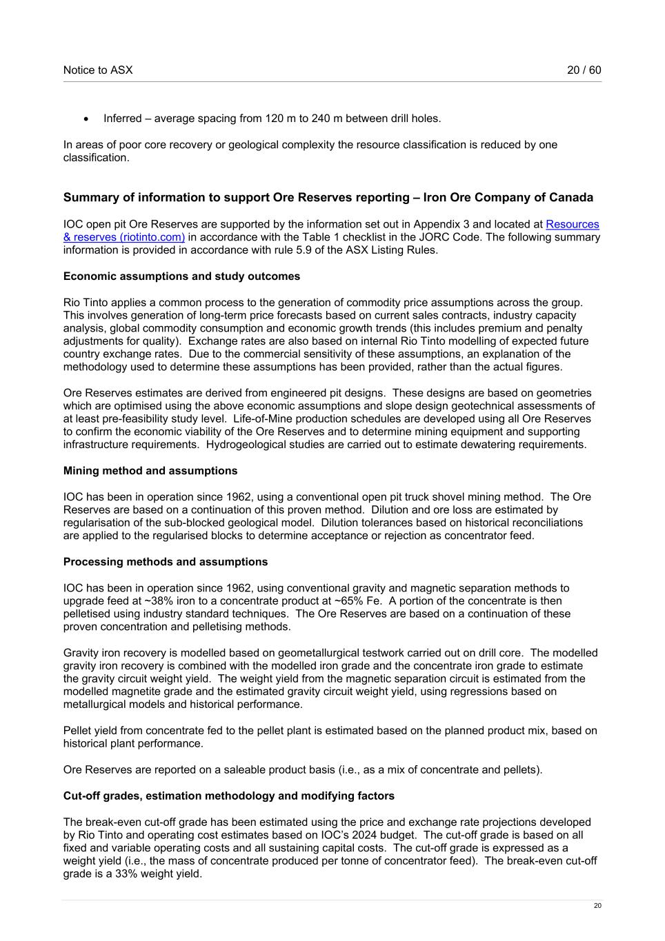 Notice to ASX 20 / 60 20 • Inferred – average spacing from 120 m to 240 m between drill holes. In areas of poor core recovery or geological complexity the resource classification is reduced by one classification. Summary of information to support Ore Reserves reporting – Iron Ore Company of Canada IOC open pit Ore Reserves are supported by the information set out in Appendix 3 and located at Resources & reserves (riotinto.com) in accordance with the Table 1 checklist in the JORC Code. The following summary information is provided in accordance with rule 5.9 of the ASX Listing Rules. Economic assumptions and study outcomes Rio Tinto applies a common process to the generation of commodity price assumptions across the group. This involves generation of long-term price forecasts based on current sales contracts, industry capacity analysis, global commodity consumption and economic growth trends (this includes premium and penalty adjustments for quality). Exchange rates are also based on internal Rio Tinto modelling of expected future country exchange rates. Due to the commercial sensitivity of these assumptions, an explanation of the methodology used to determine these assumptions has been provided, rather than the actual figures. Ore Reserves estimates are derived from engineered pit designs. These designs are based on geometries which are optimised using the above economic assumptions and slope design geotechnical assessments of at least pre-feasibility study level. Life-of-Mine production schedules are developed using all Ore Reserves to confirm the economic viability of the Ore Reserves and to determine mining equipment and supporting infrastructure requirements. Hydrogeological studies are carried out to estimate dewatering requirements. Mining method and assumptions IOC has been in operation since 1962, using a conventional open pit truck shovel mining method. The Ore Reserves are based on a continuation of this proven method. Dilution and ore loss are estimated by regularisation of the sub-blocked geological model. Dilution tolerances based on historical reconciliations are applied to the regularised blocks to determine acceptance or rejection as concentrator feed. Processing methods and assumptions IOC has been in operation since 1962, using conventional gravity and magnetic separation methods to upgrade feed at ~38% iron to a concentrate product at ~65% Fe. A portion of the concentrate is then pelletised using industry standard techniques. The Ore Reserves are based on a continuation of these proven concentration and pelletising methods. Gravity iron recovery is modelled based on geometallurgical testwork carried out on drill core. The modelled gravity iron recovery is combined with the modelled iron grade and the concentrate iron grade to estimate the gravity circuit weight yield. The weight yield from the magnetic separation circuit is estimated from the modelled magnetite grade and the estimated gravity circuit weight yield, using regressions based on metallurgical models and historical performance. Pellet yield from concentrate fed to the pellet plant is estimated based on the planned product mix, based on historical plant performance. Ore Reserves are reported on a saleable product basis (i.e., as a mix of concentrate and pellets). Cut-off grades, estimation methodology and modifying factors The break-even cut-off grade has been estimated using the price and exchange rate projections developed by Rio Tinto and operating cost estimates based on IOC’s 2024 budget. The cut-off grade is based on all fixed and variable operating costs and all sustaining capital costs. The cut-off grade is expressed as a weight yield (i.e., the mass of concentrate produced per tonne of concentrator feed). The break-even cut-off grade is a 33% weight yield.